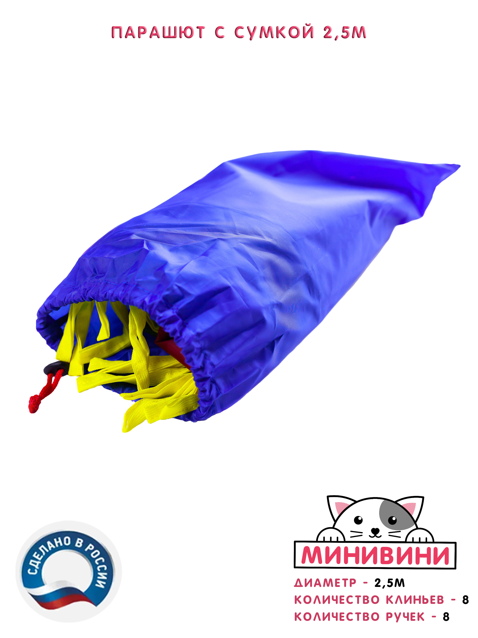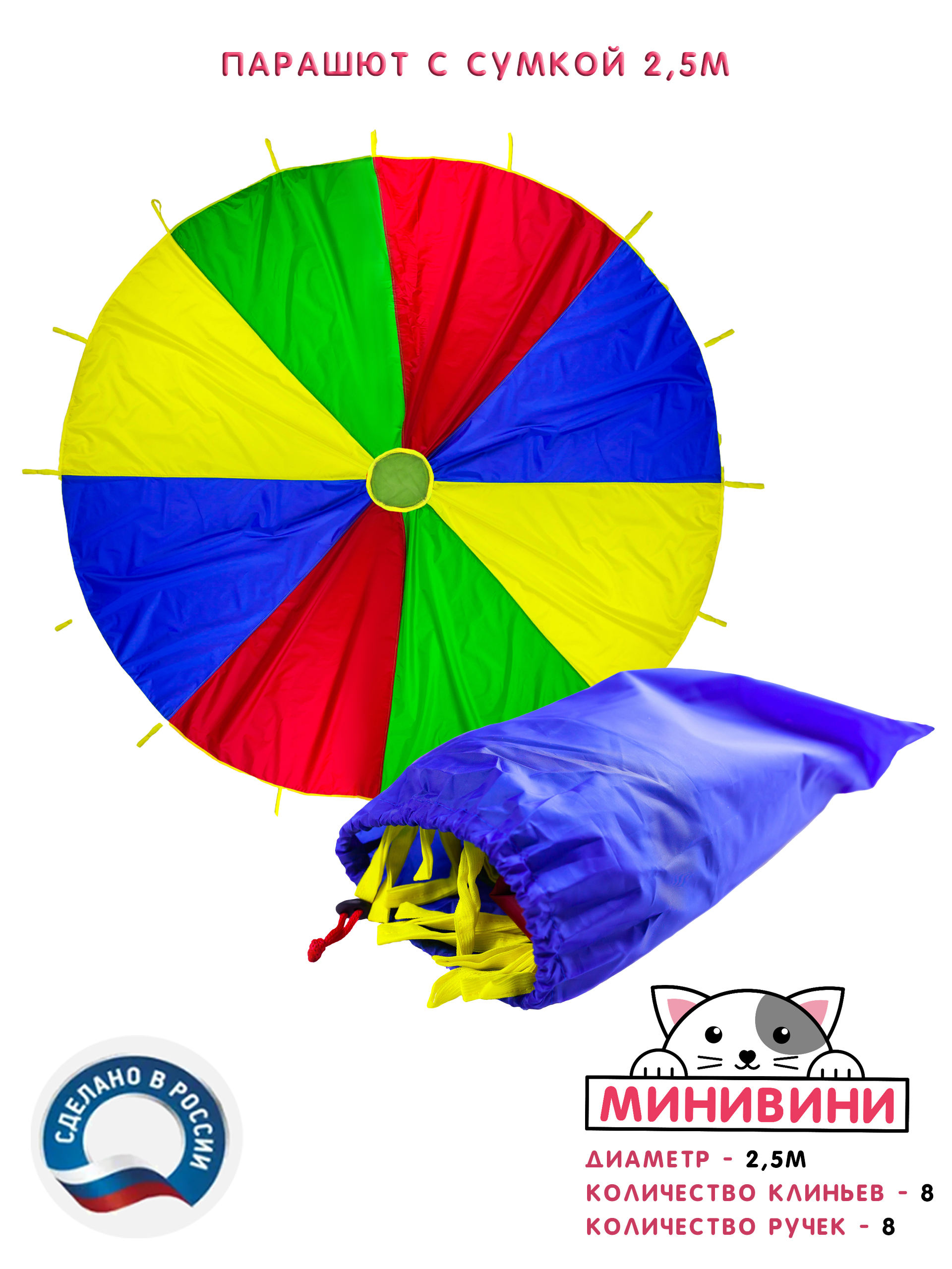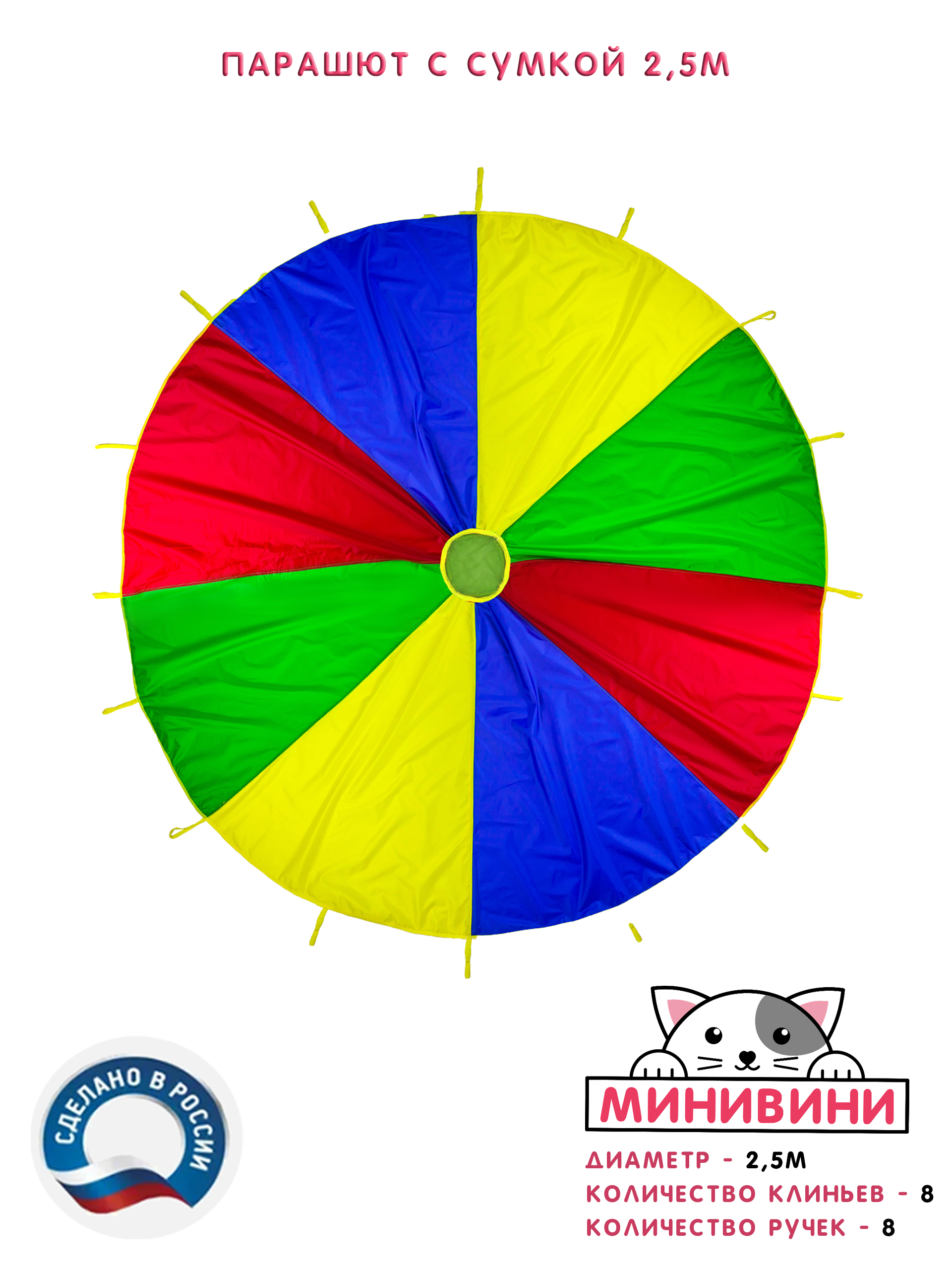 1. Парашют, состоящий из 8-ми клиньев 4-х цветов: синий, красный, желтый, зеленый. По окружности пришиты 16 ручек, в центре парашюта - сетка.