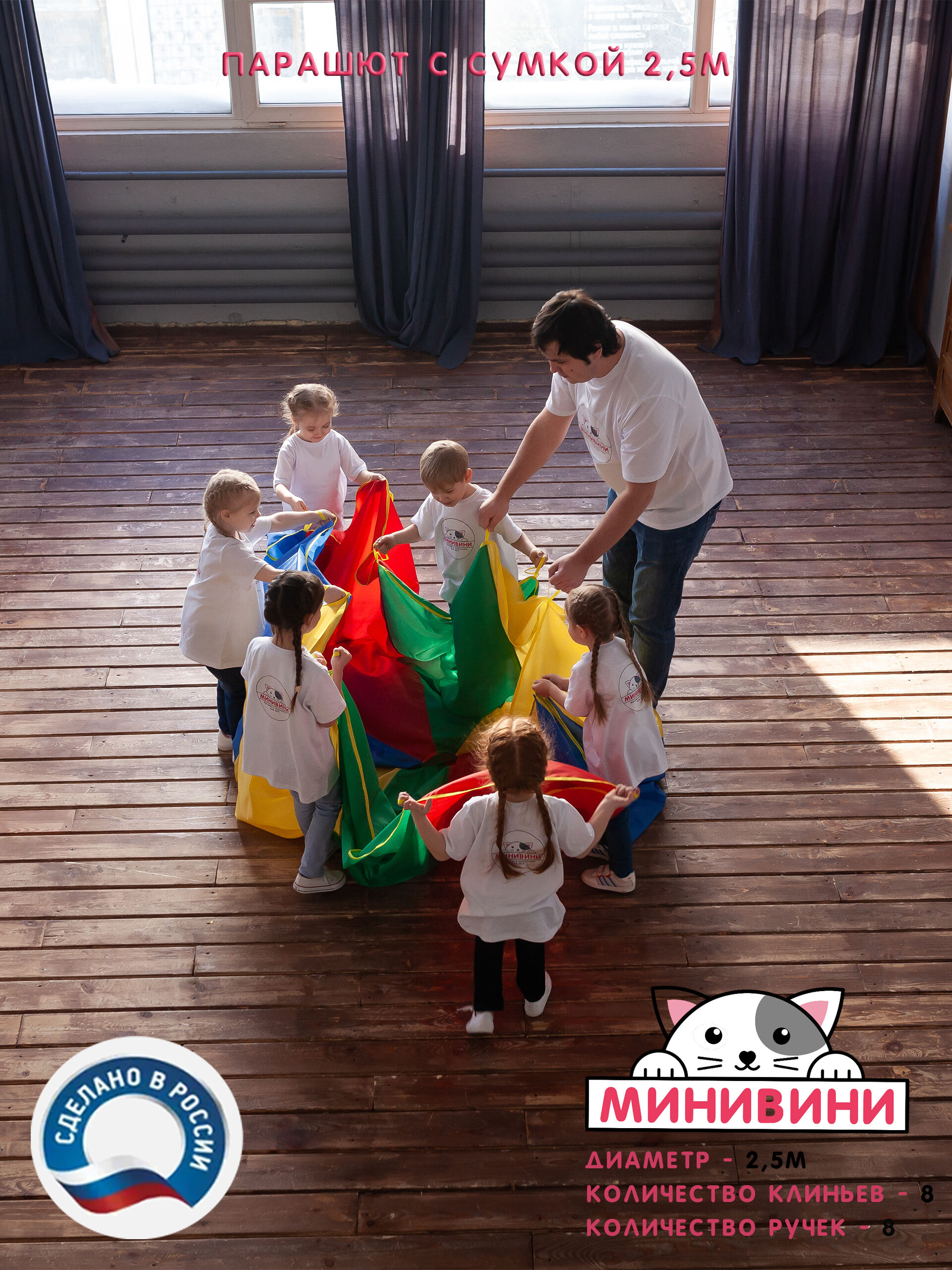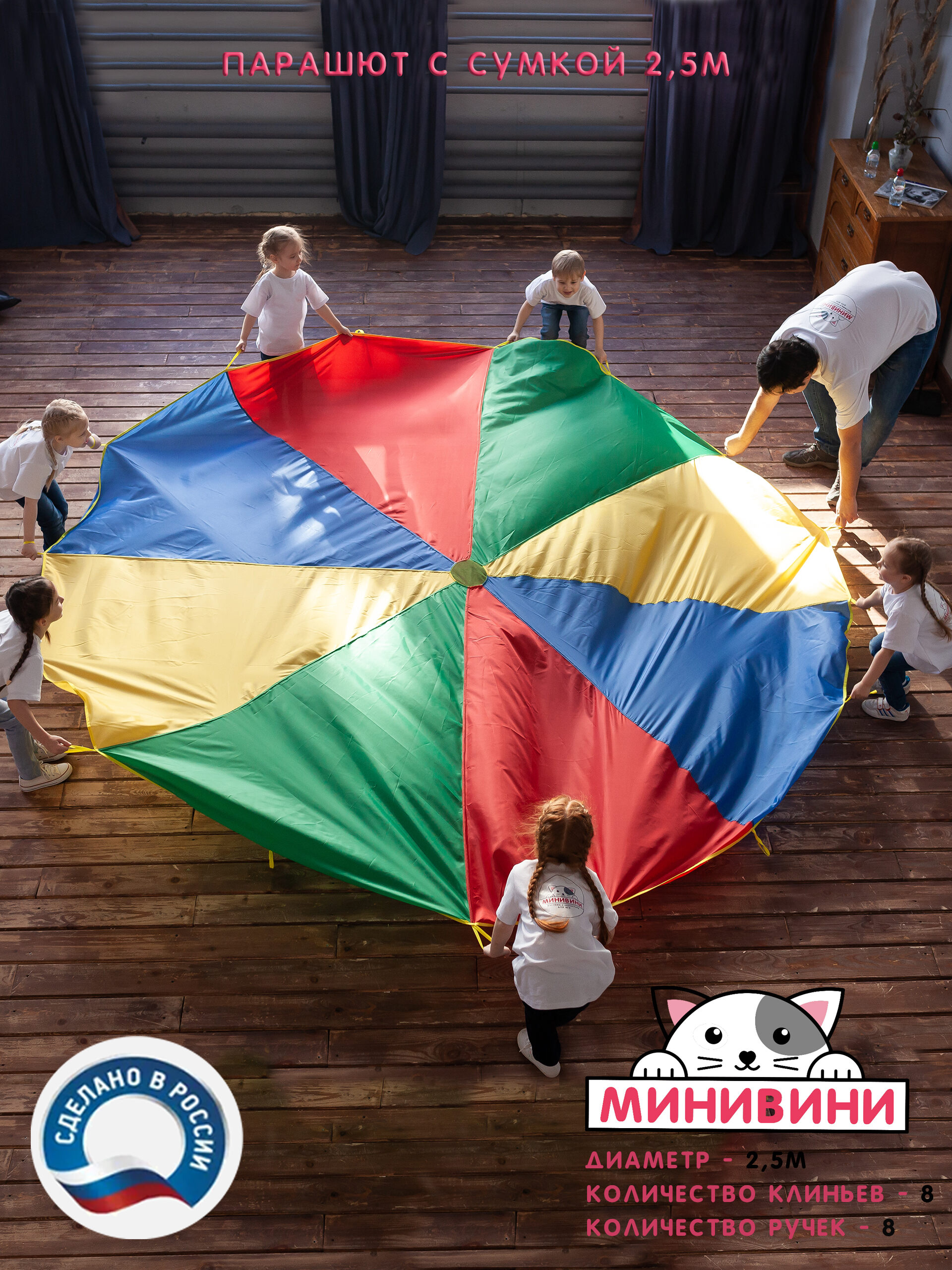 Парашют помогает раскрепостить скромных детей, способствует формированию команды, развивает чувство ритма и хорошо сказывается на физическом развитии ребенка.
