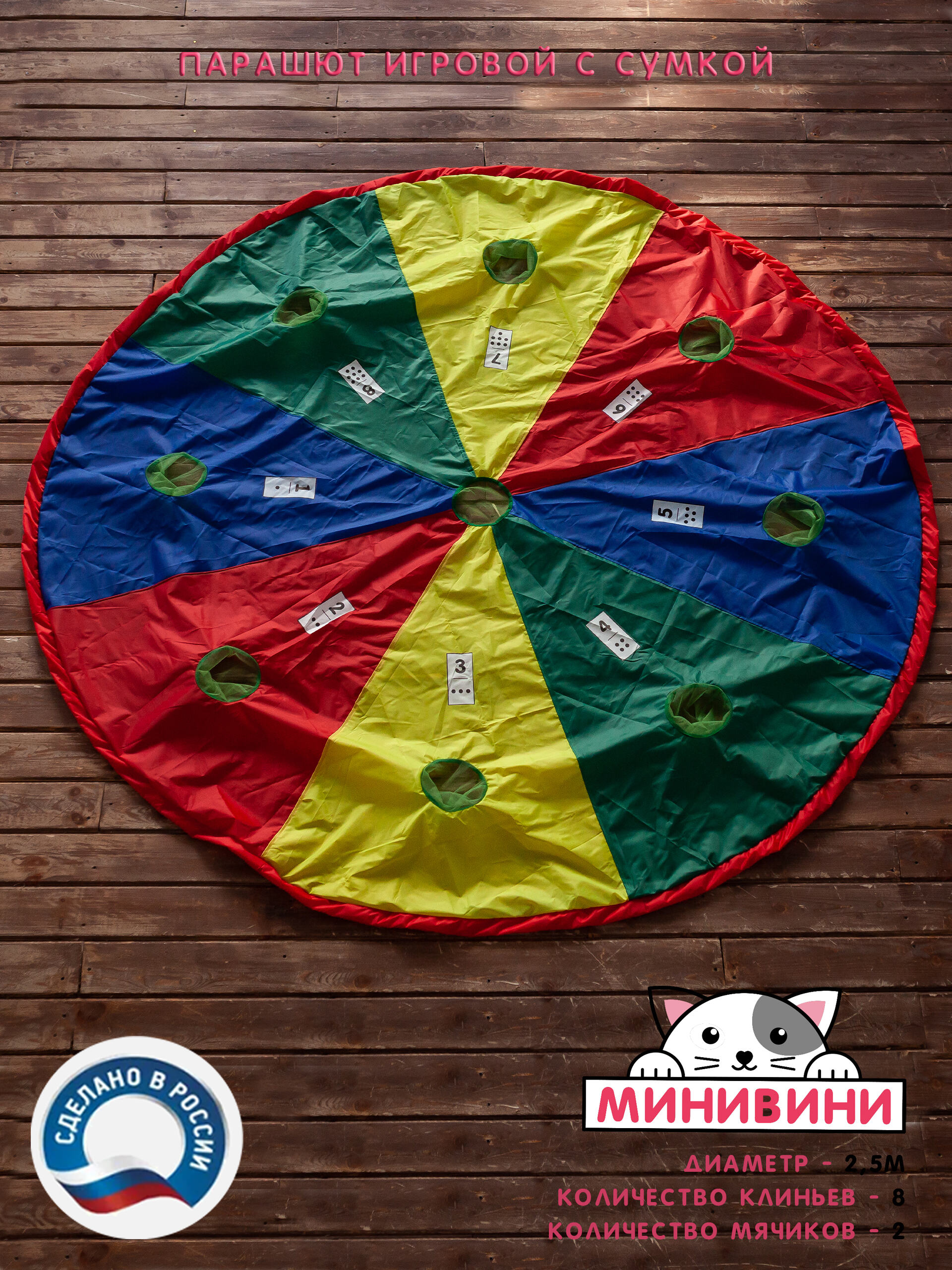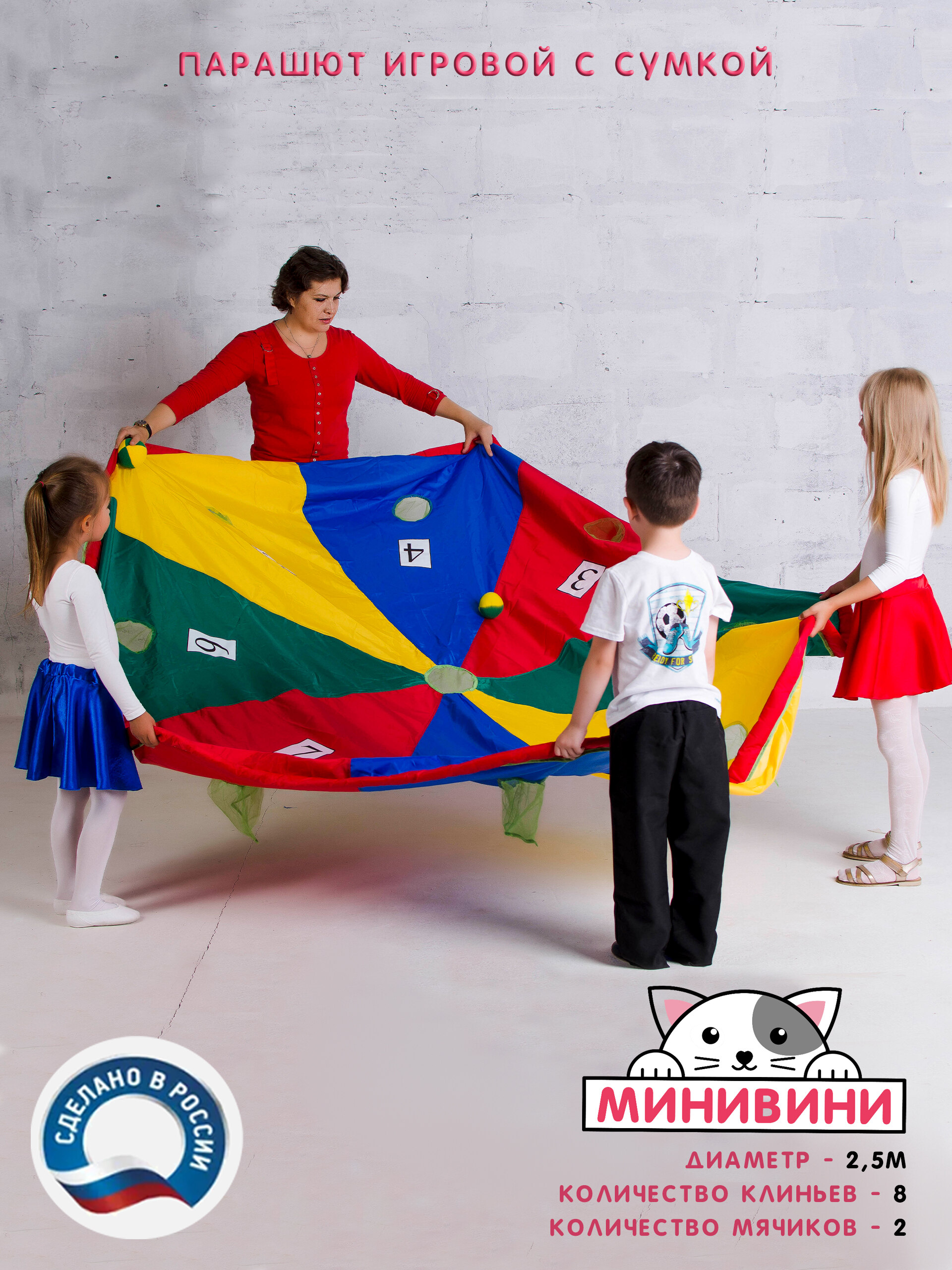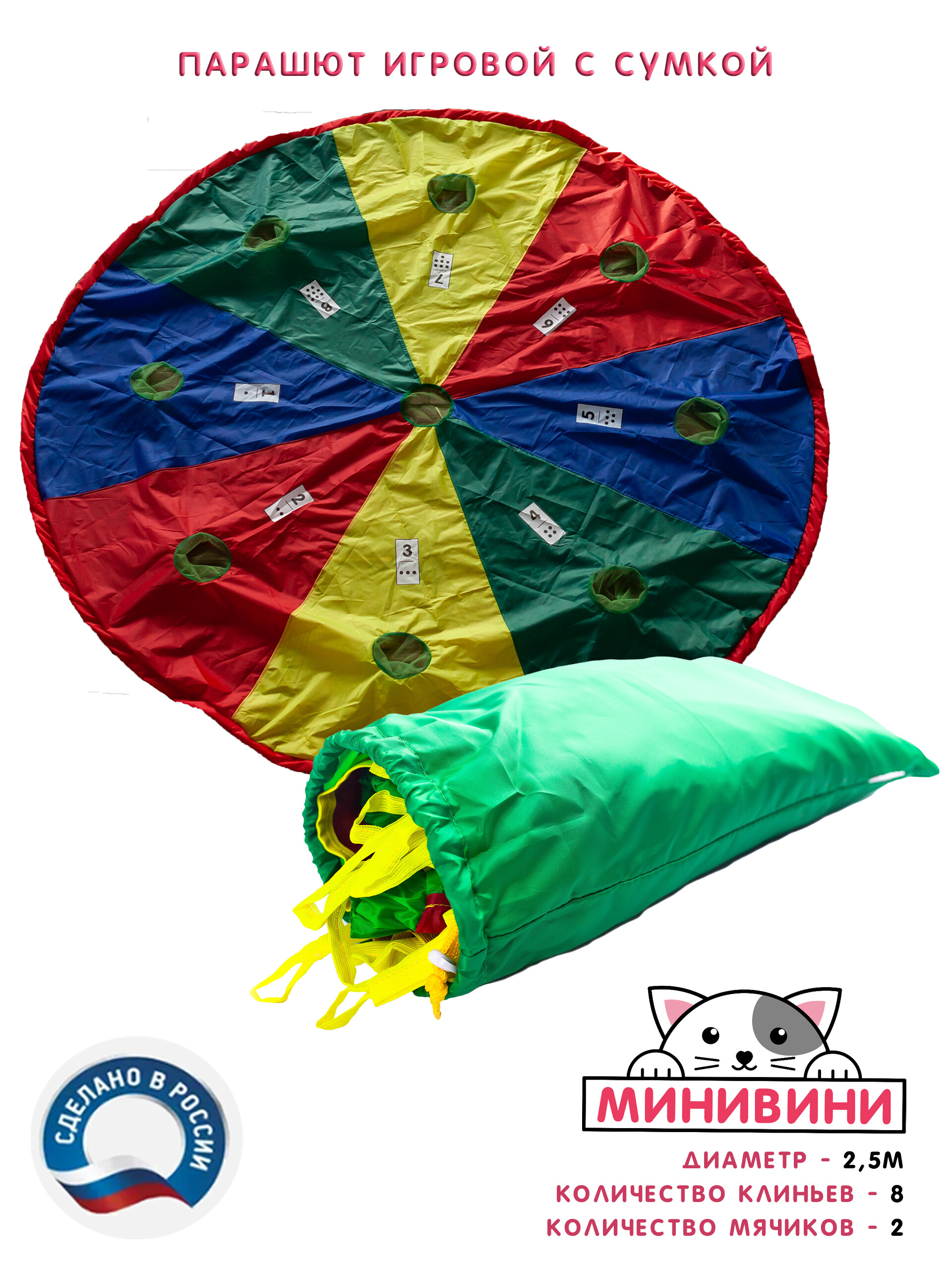 Размер: диаметр парашюта 2,5 метра, мячики-мякиши диаметром 8 см.
