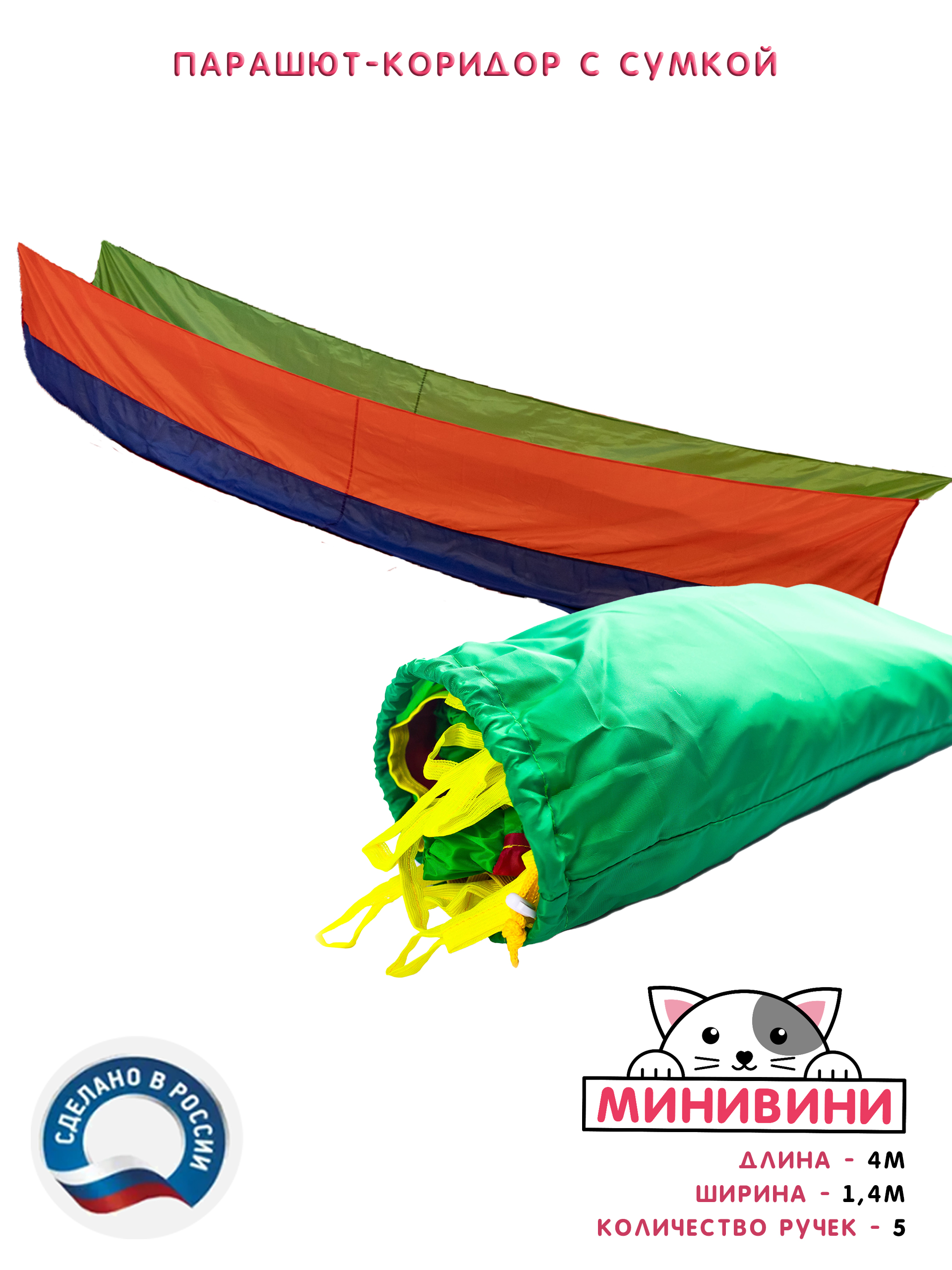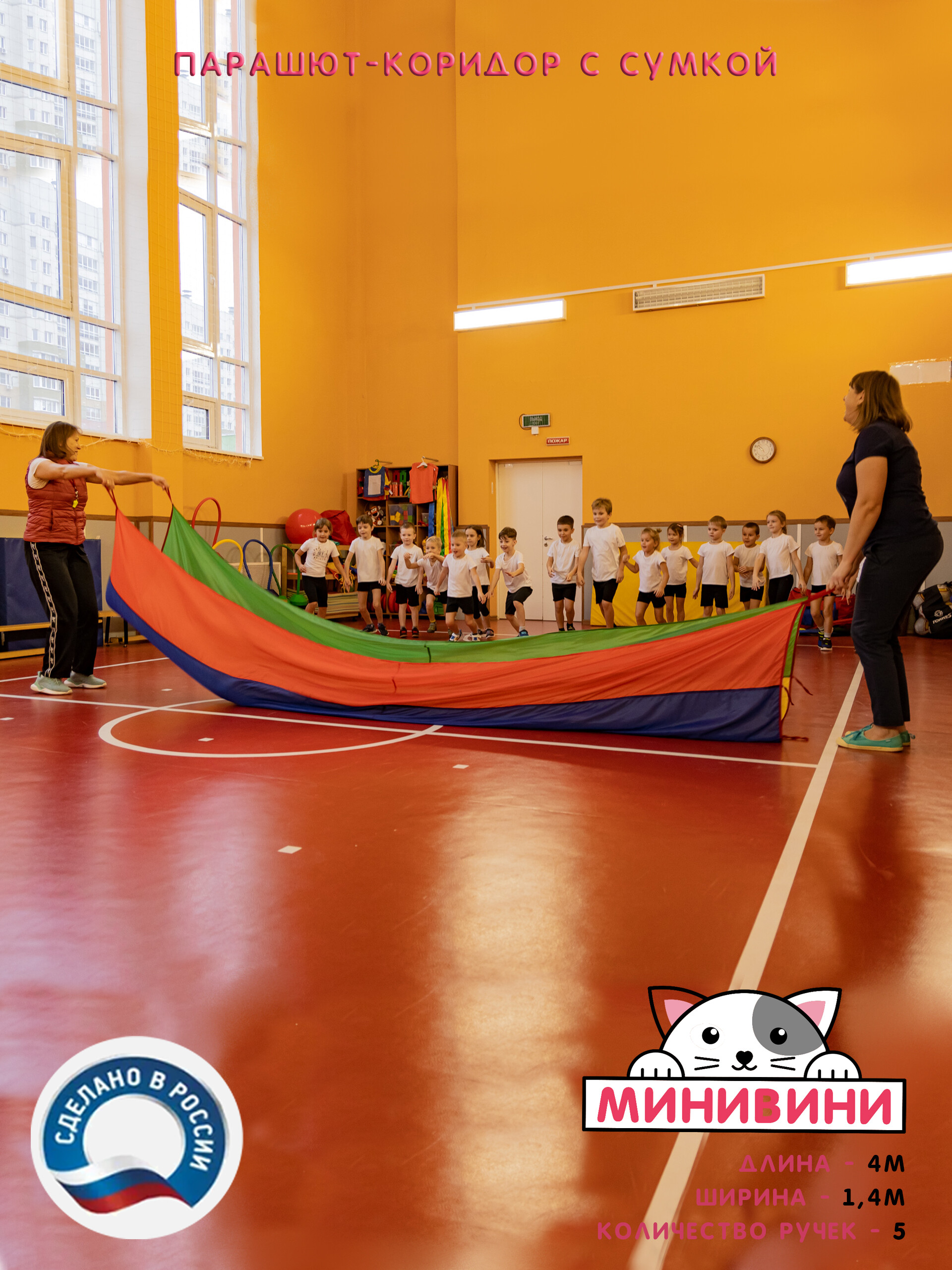 1. Парашют, состоит из четырех полос разных цветов (синий, красный, желтый,зеленый), сшитых между собой. На коротких краях по 5 ручек.