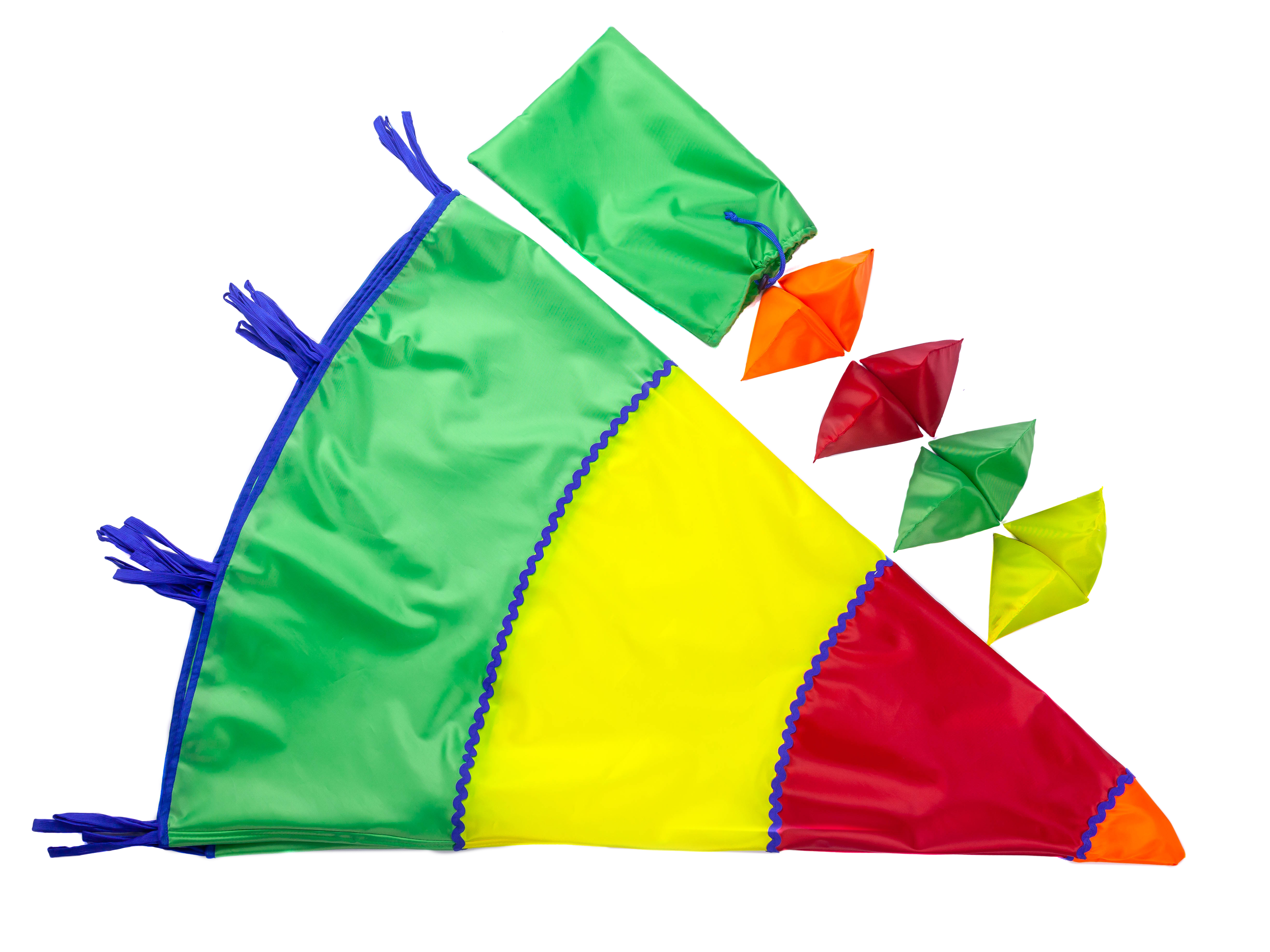 Материал: парашют, мешок для хранения - оксфорд - 100% полиэстер, пирамидки - основа оксфорд, 100% полиэстер, наполнитель - гранулы ПВХ. Комплектация -парашют (зеленый, желтый, красный, оранжевый) с 24 ручками, 8 пирамидок  - по 2 каждого цвета (оранжевый, зеленый, желтый красный, сумка для хранения. Размер: парашют -    диаметр 2м, пирамидки грань 12 см.