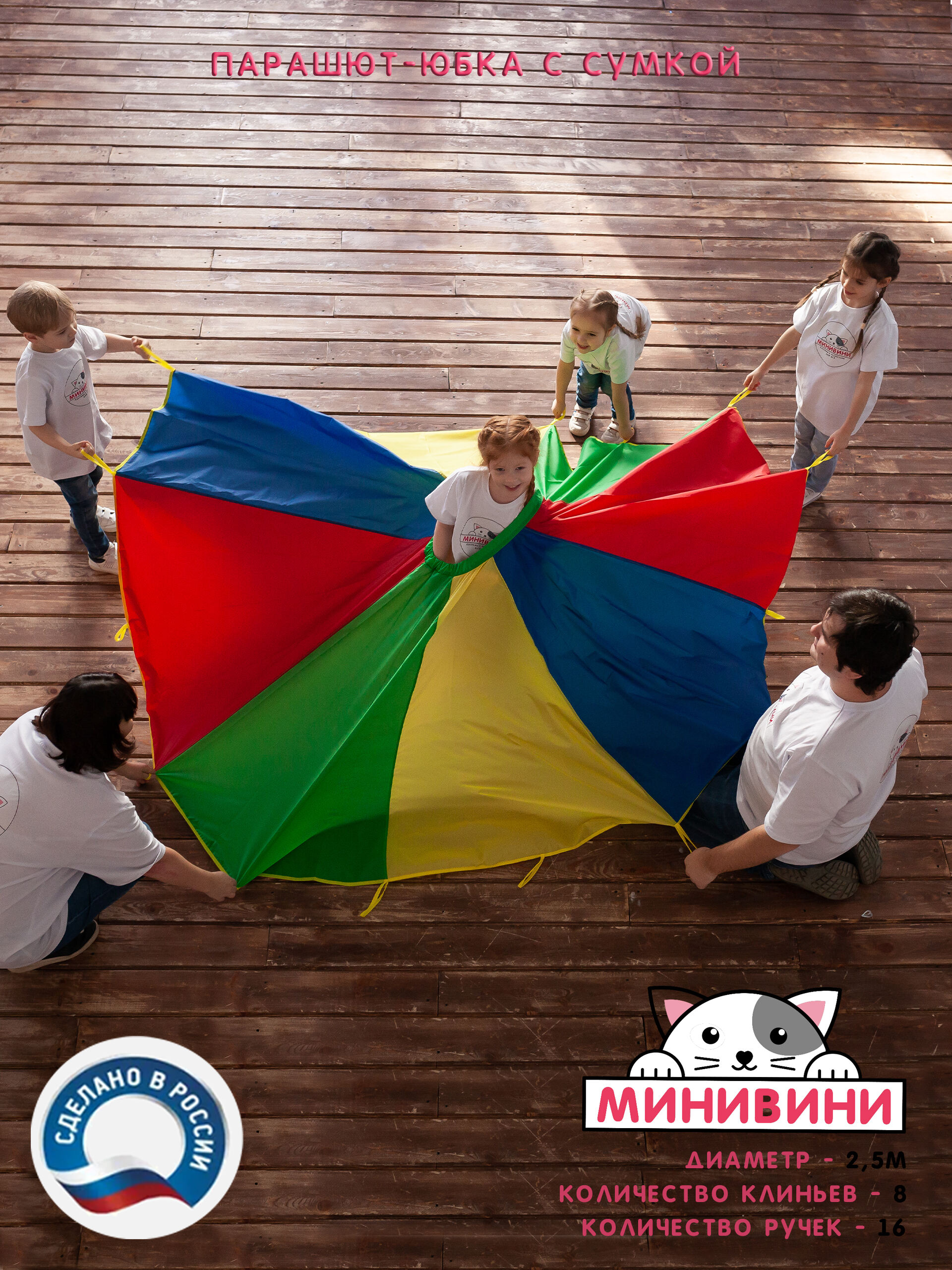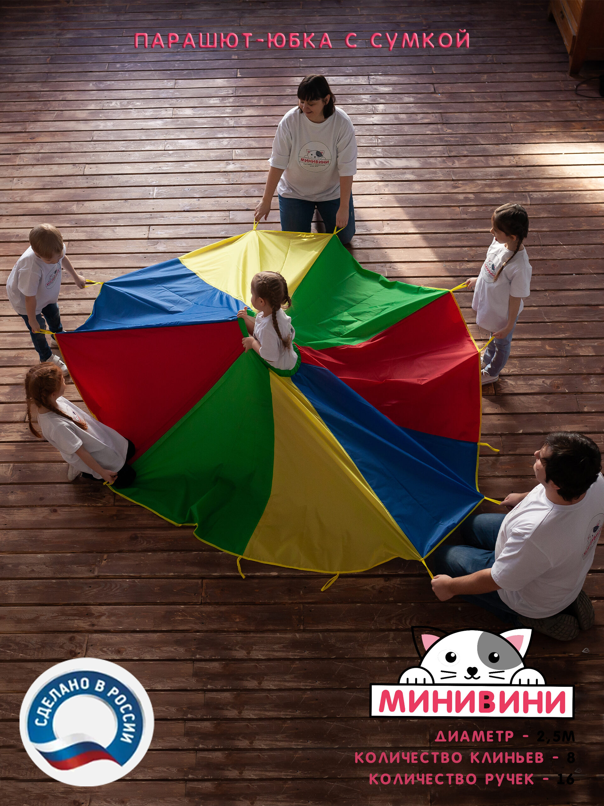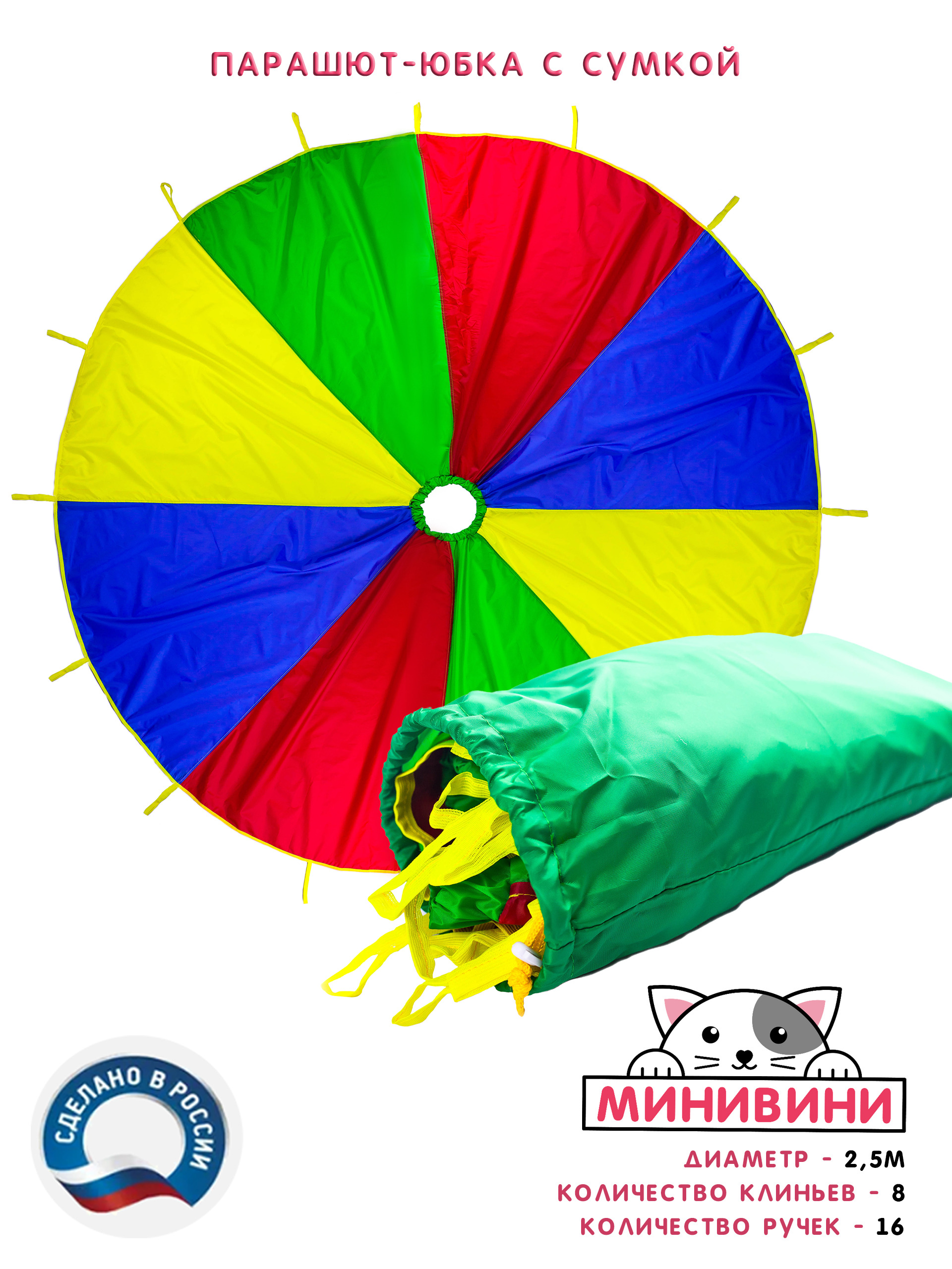 1. Парашют, состоит из 8-ми секторов 4-х цветов (синий, красный, желтый, зеленый) с широким отверстием посредине на резинке. По окружности пришито 16 ручек.
