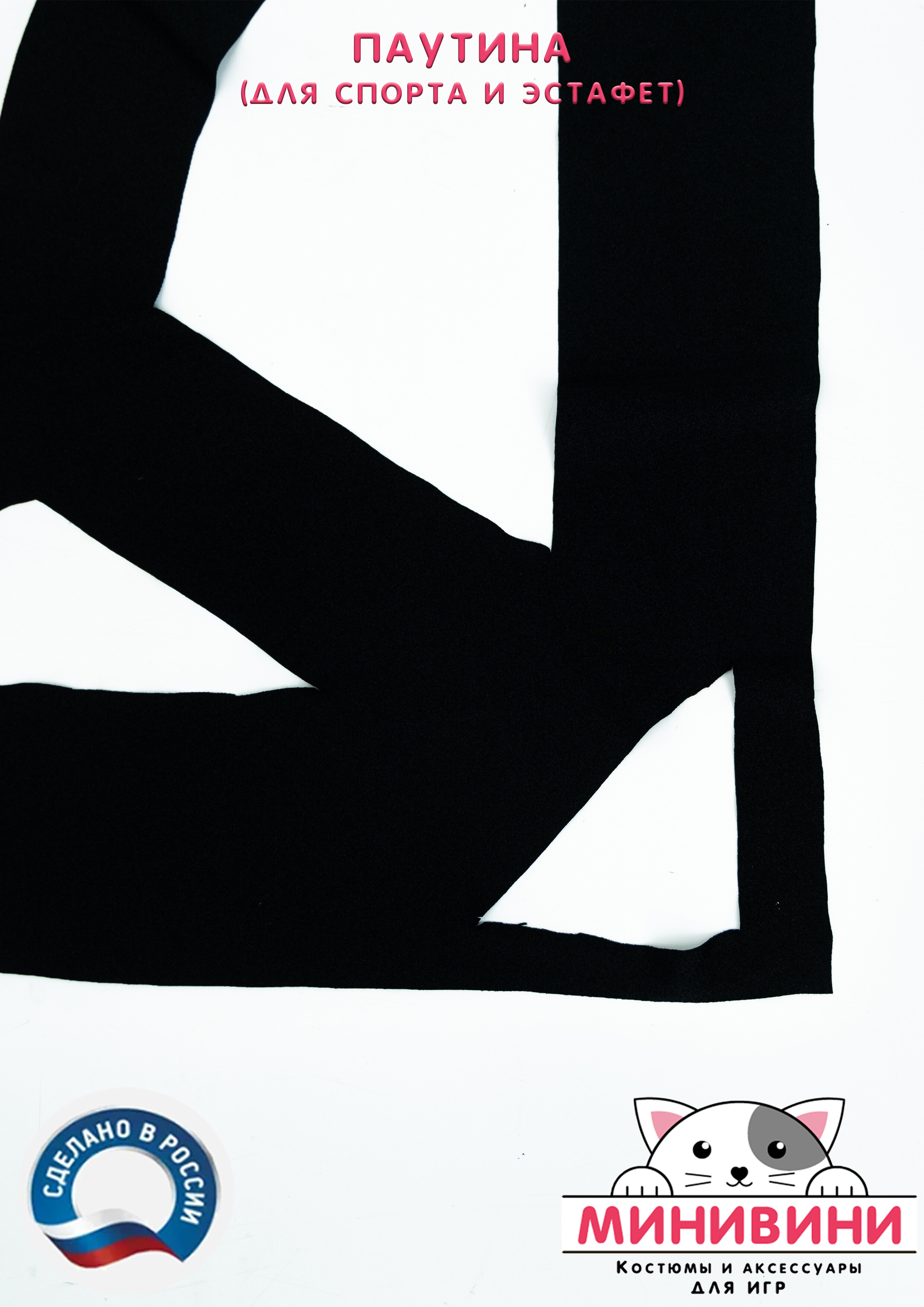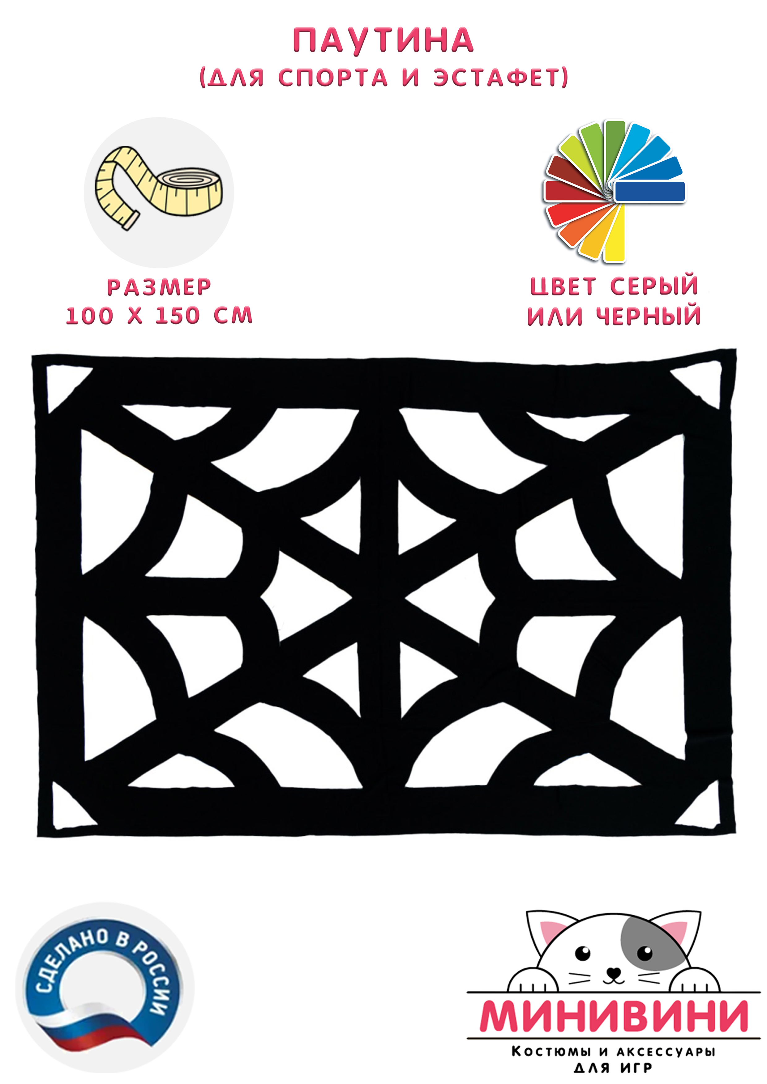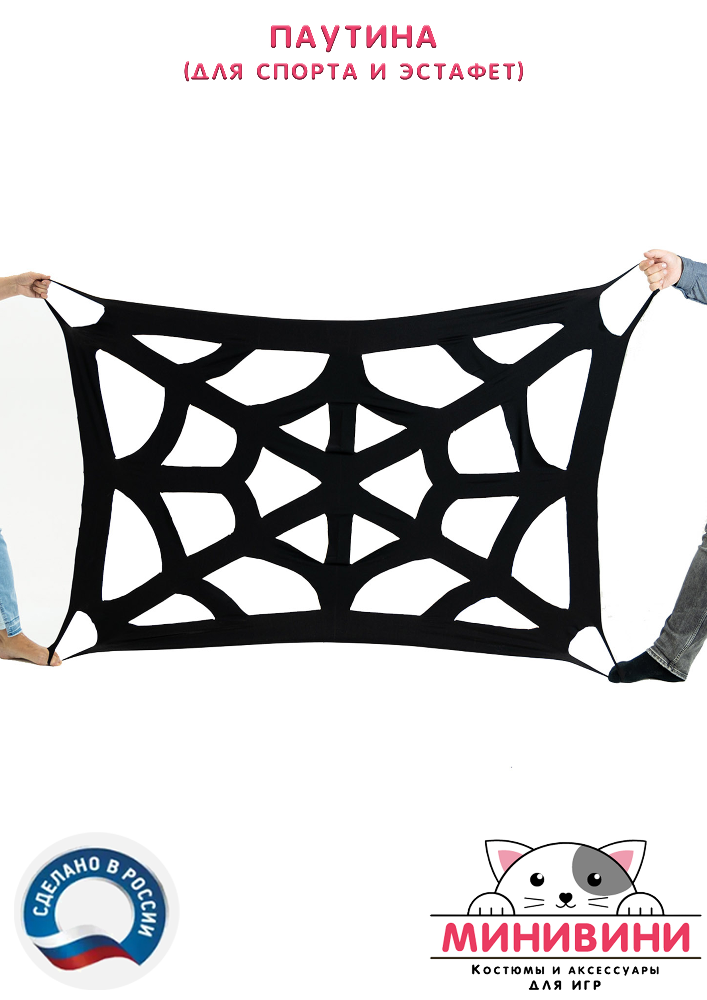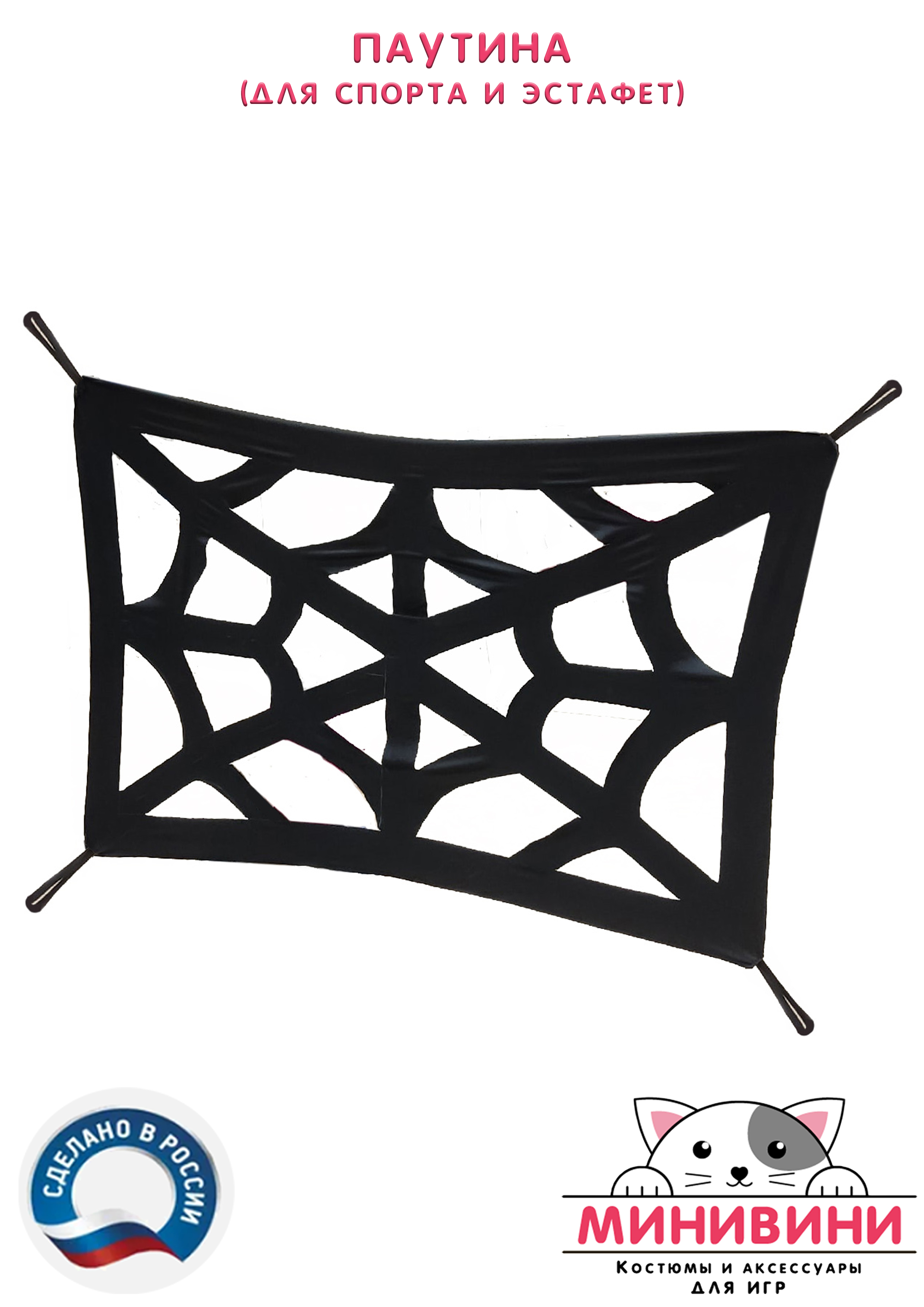 На ткани вырезаны дырки различного размера и конфигурации. Материал очень хорошо тянется. Ребенок (и, в большинстве своем, взрослый) легко пролезет в любую дырку. По углам для удобства тех, кто держит паутину, пришиты резинки.
