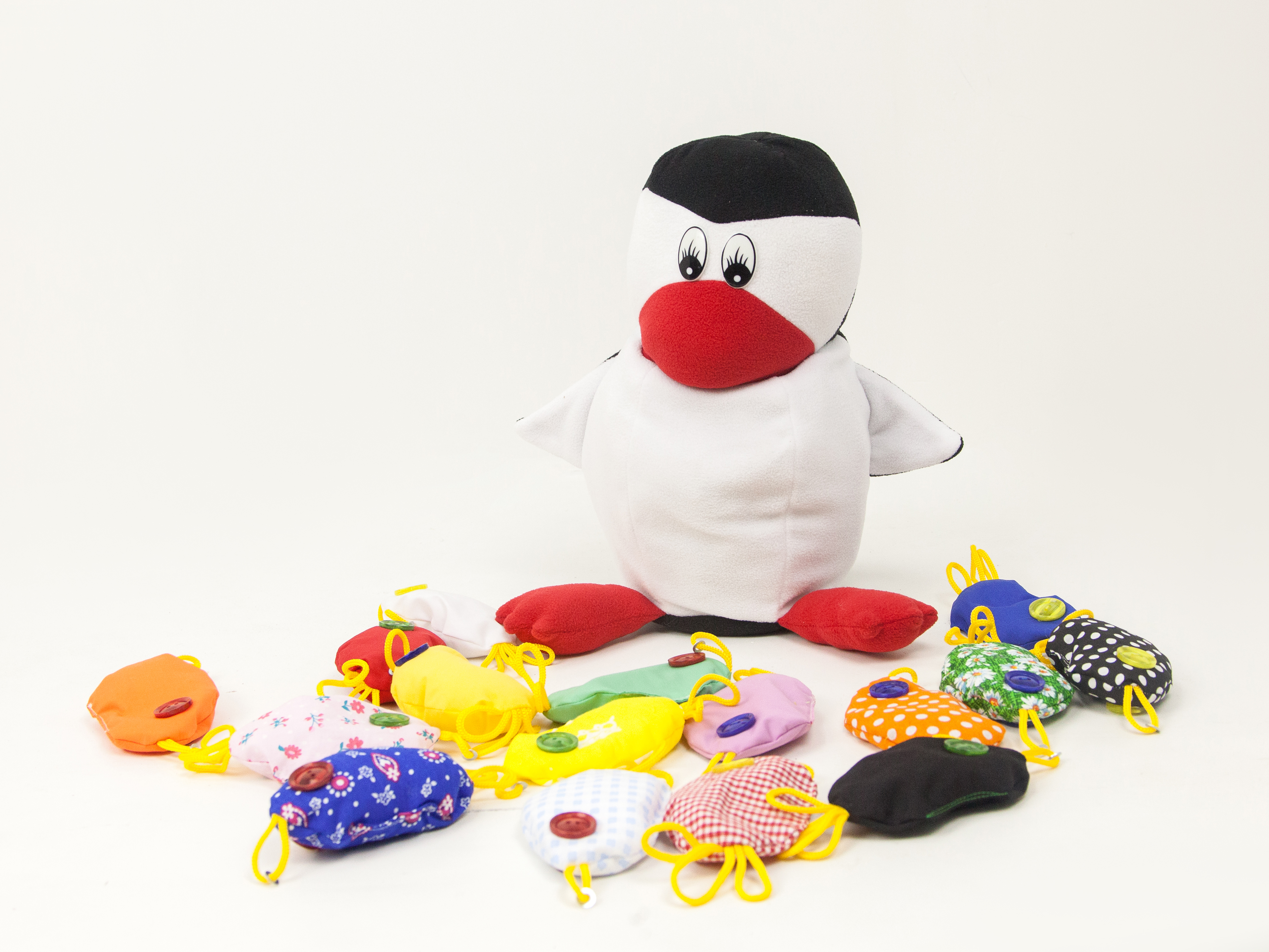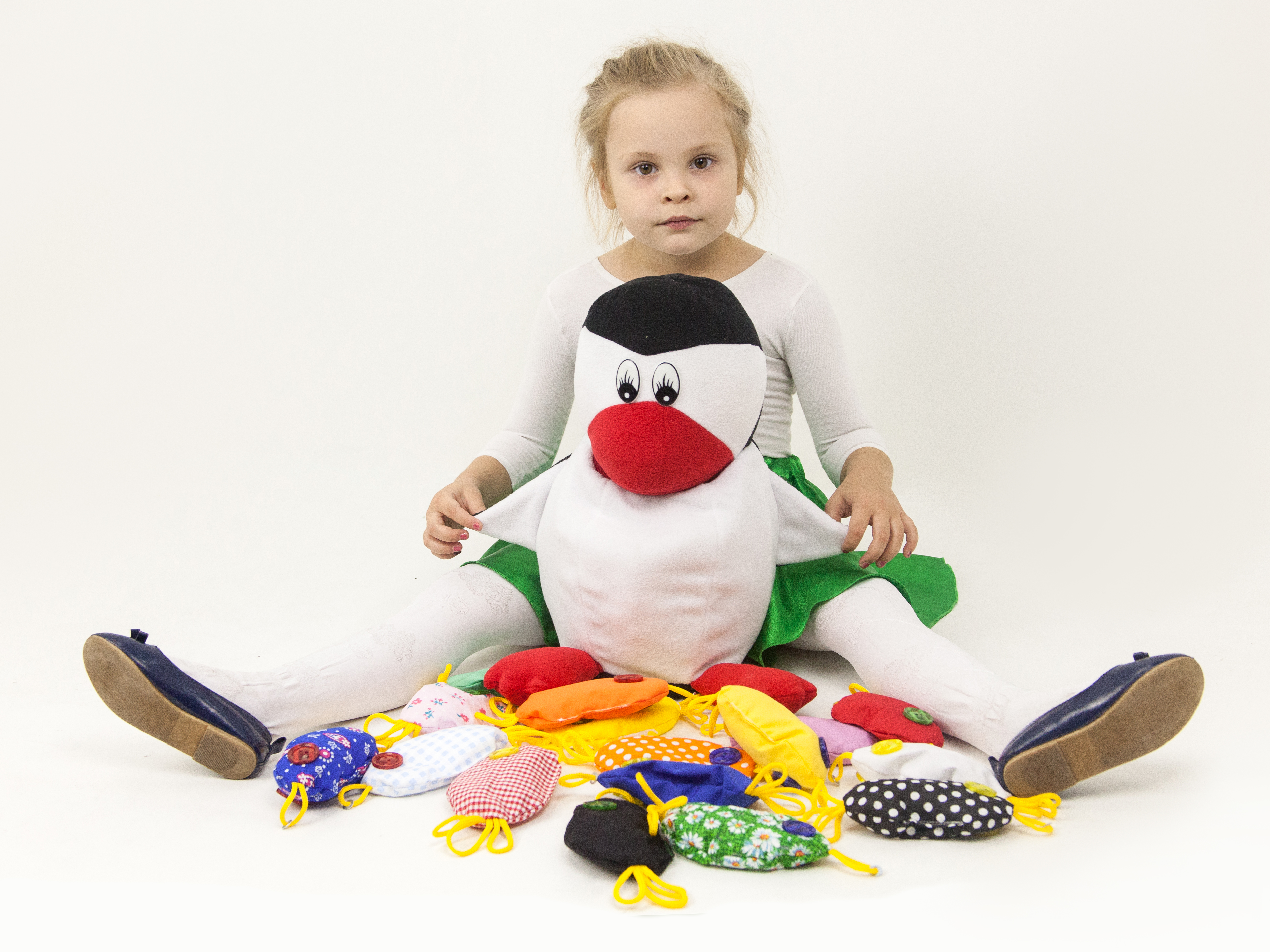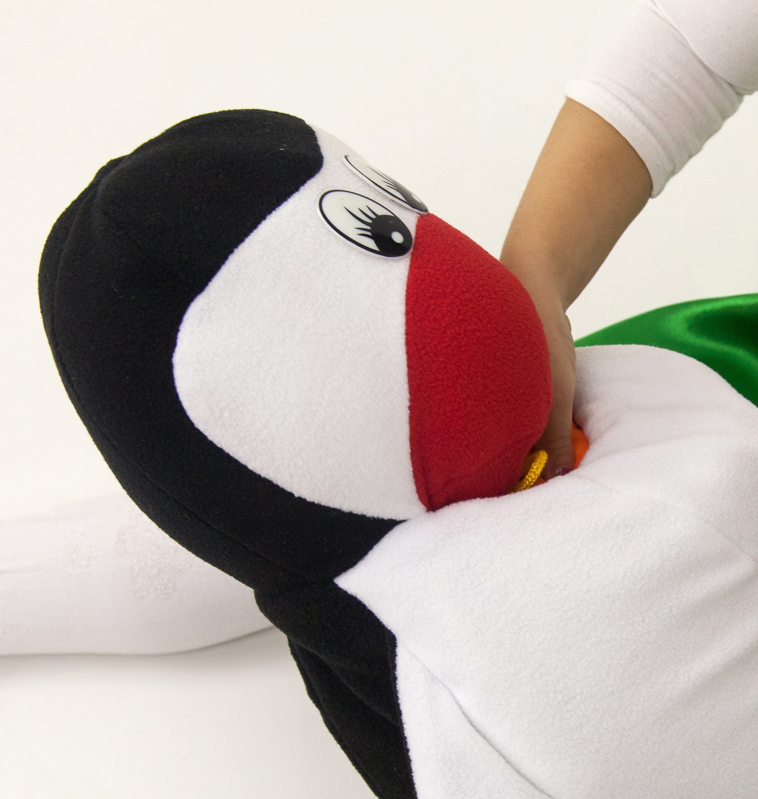 Материал: основа — флис 100% полиэстер, подклад — смесовая ткань — 35% хлопка, 65% полиэстера, наполнение: геовойлок, синтепух — 100% полиэстер. Кормление (складывание предметов) через клюв.