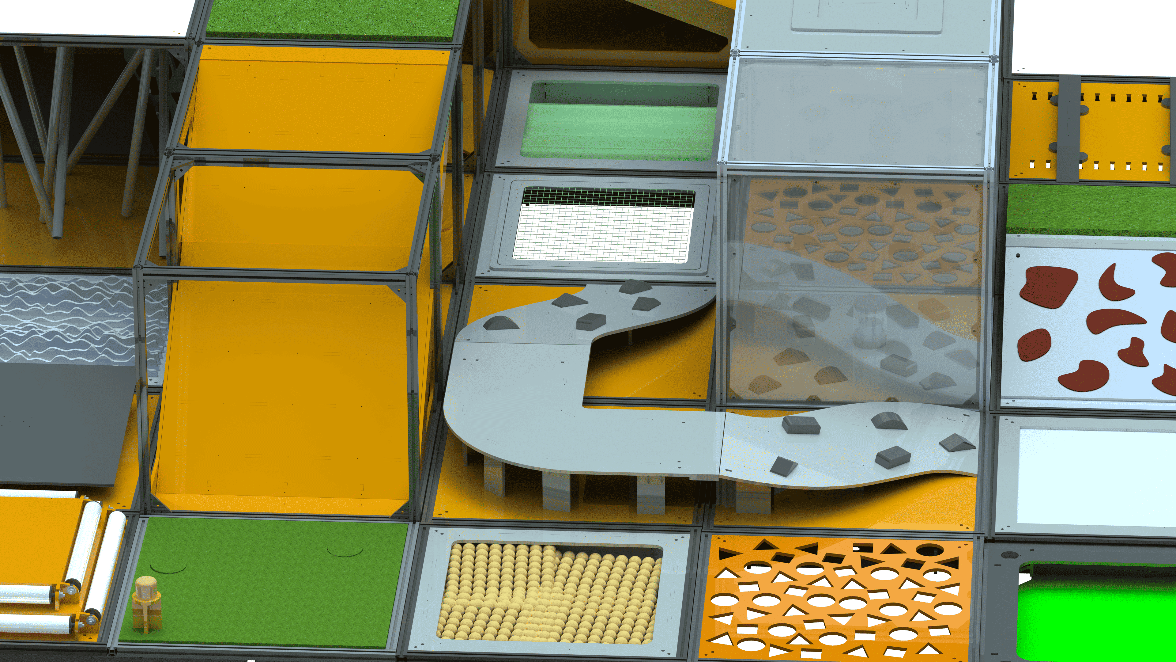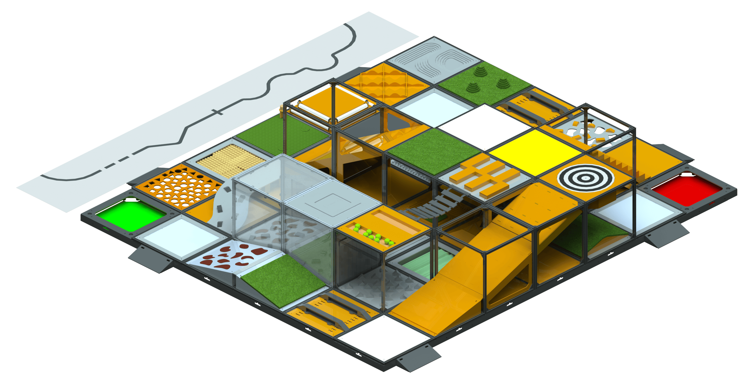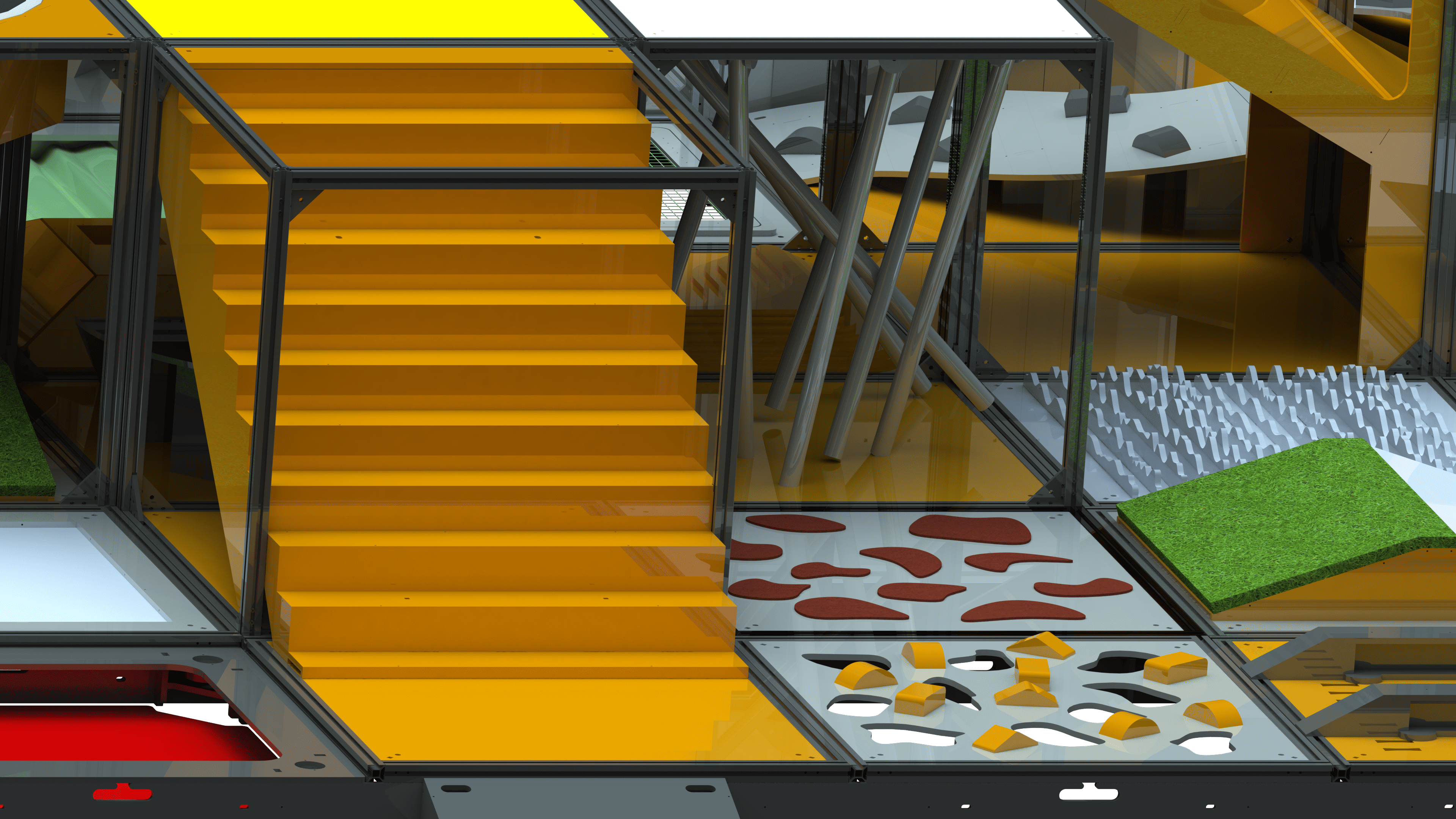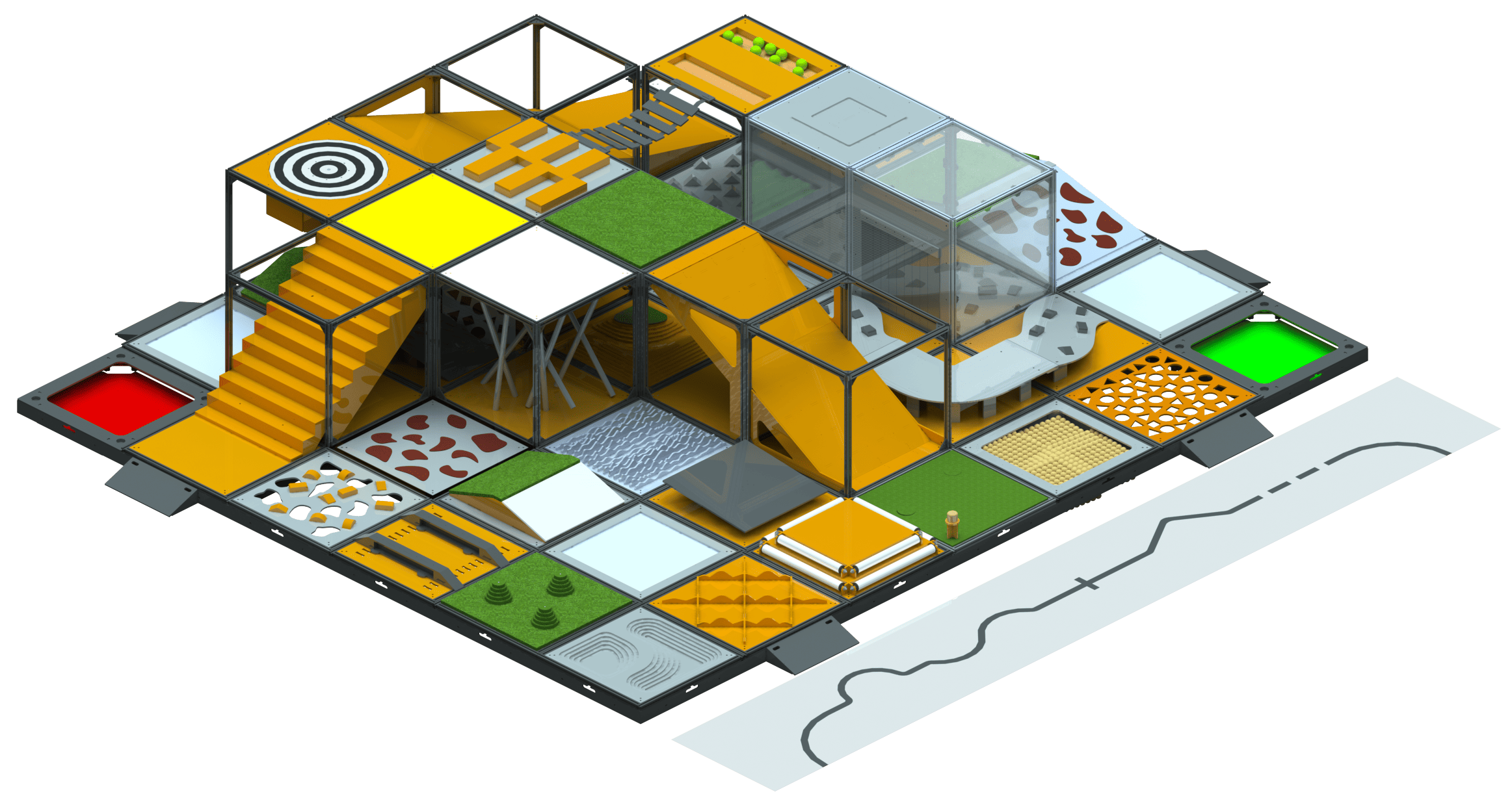 Испытательный полигон «Мега» представляет собой реконфигурируемую полосу препятствий, составными элементами которой являются 42 различные ячейки с испытаниями и заданиями, преодоление или выполнение которых позволяет оценить возможности мобильных роботов. Ячейка - куб или квадрат, ограниченный металлическим профилем.
