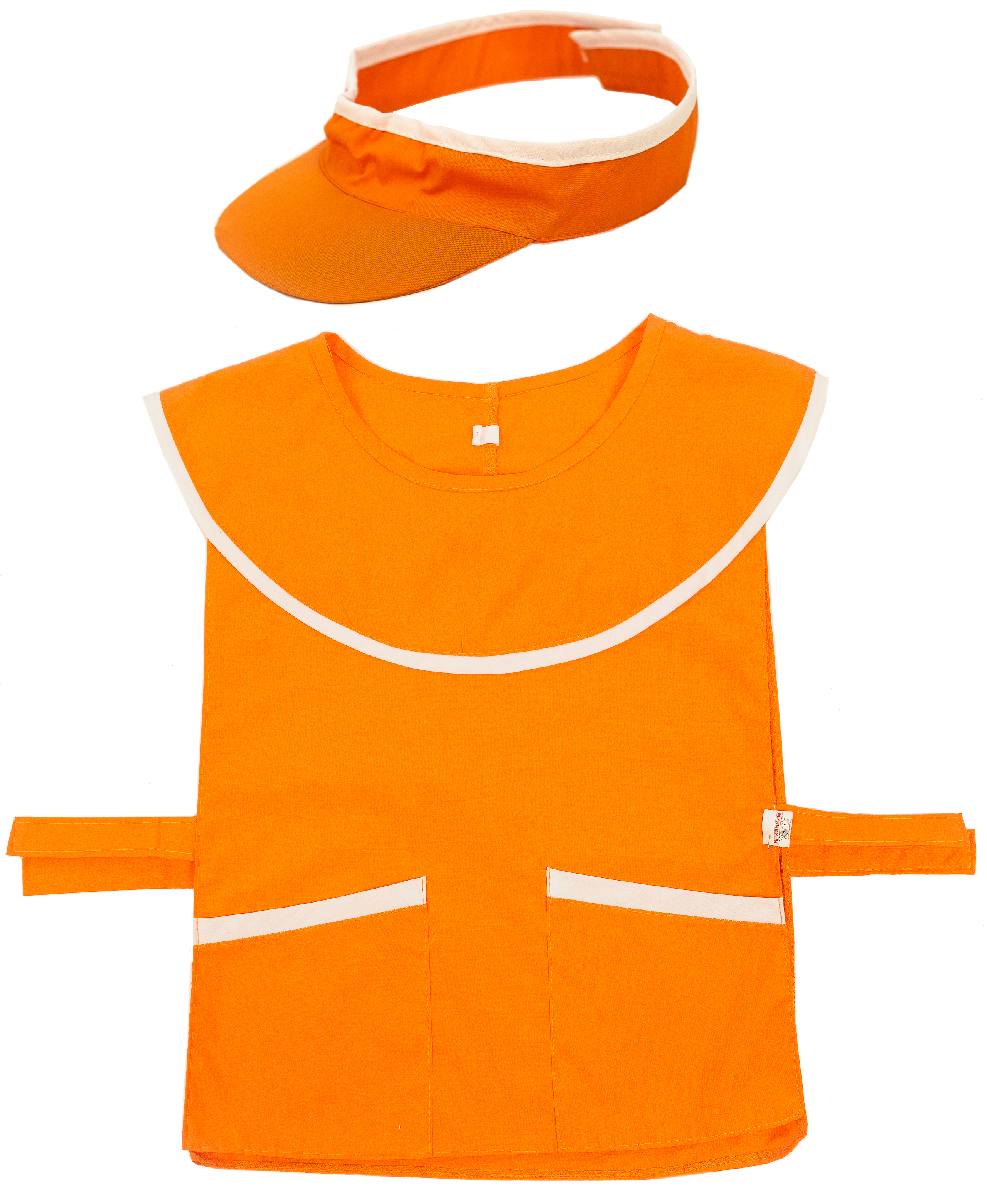Материал: смесовая ткань 35% хлопка 65% полиэстера. Комплектация: 2 предмета –накидка с двумя карманами, застежка на липучки по бокам и головной убор — козырек, обтянутый тканью, застежка сзади на липучку.