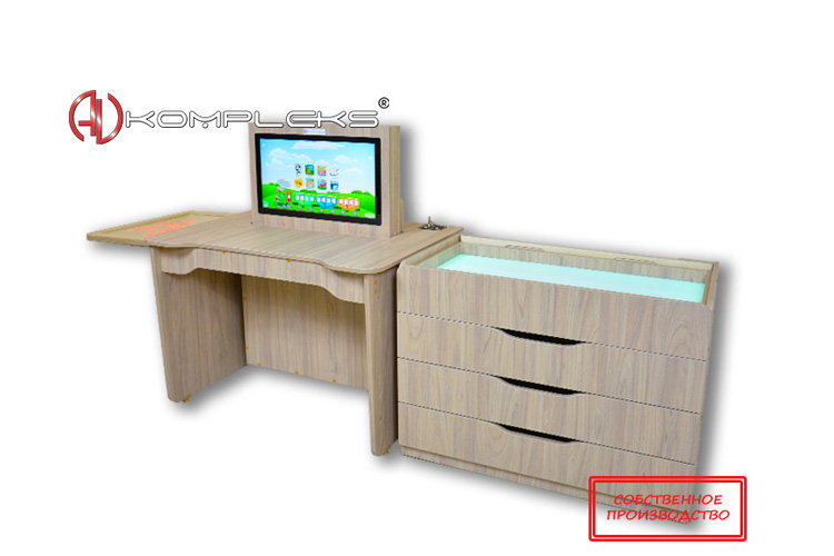 Профессиональный интерактивный стол психолога-дефектолога «AVKompleks ПсихоЛогика Prof» представляет собой полноценный развивающий игровой комплекс. Благодаря комплекту упражнений и интерактивному оборудованию можно развивать органы чувств ребенка и проводить анализ его психологического и эмоционального состояния. В процессе работы с оборудованием можно наблюдать следующие положительные эффекты у детей: 1. улучшение мелкой моторики; 2. развитие обоих полушарий мозга и памяти; 3. распознавание и развитие эмоций; 4. изучение цветов, цифр и форм предметов. В комплектацию входит: сенсорный экран с автоматизированным механизмом, отсек для творчества с крышкой в виде шахматной доски, откидной световой планшет для рисования, а также деревянные развивающие тренажеры для психологического развития. Оборудование безопасно в использовании, имеются все необходимые сертификаты соответствия.