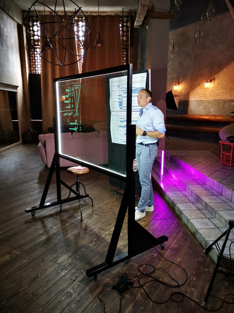 Прозрачная маркерная доска 100*150 см с LED-подсветкой. Сделана из закаленного стекла в металлической раме.