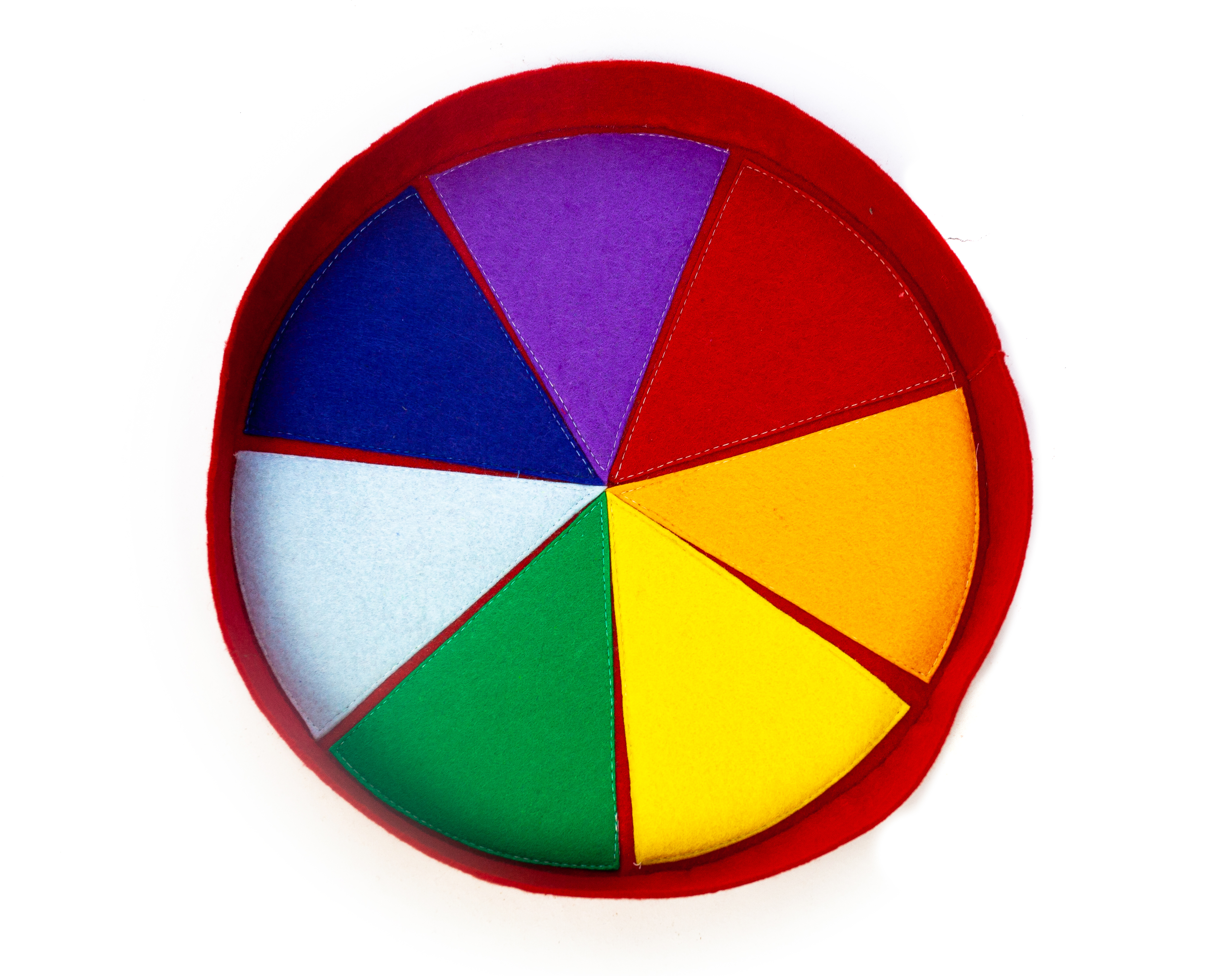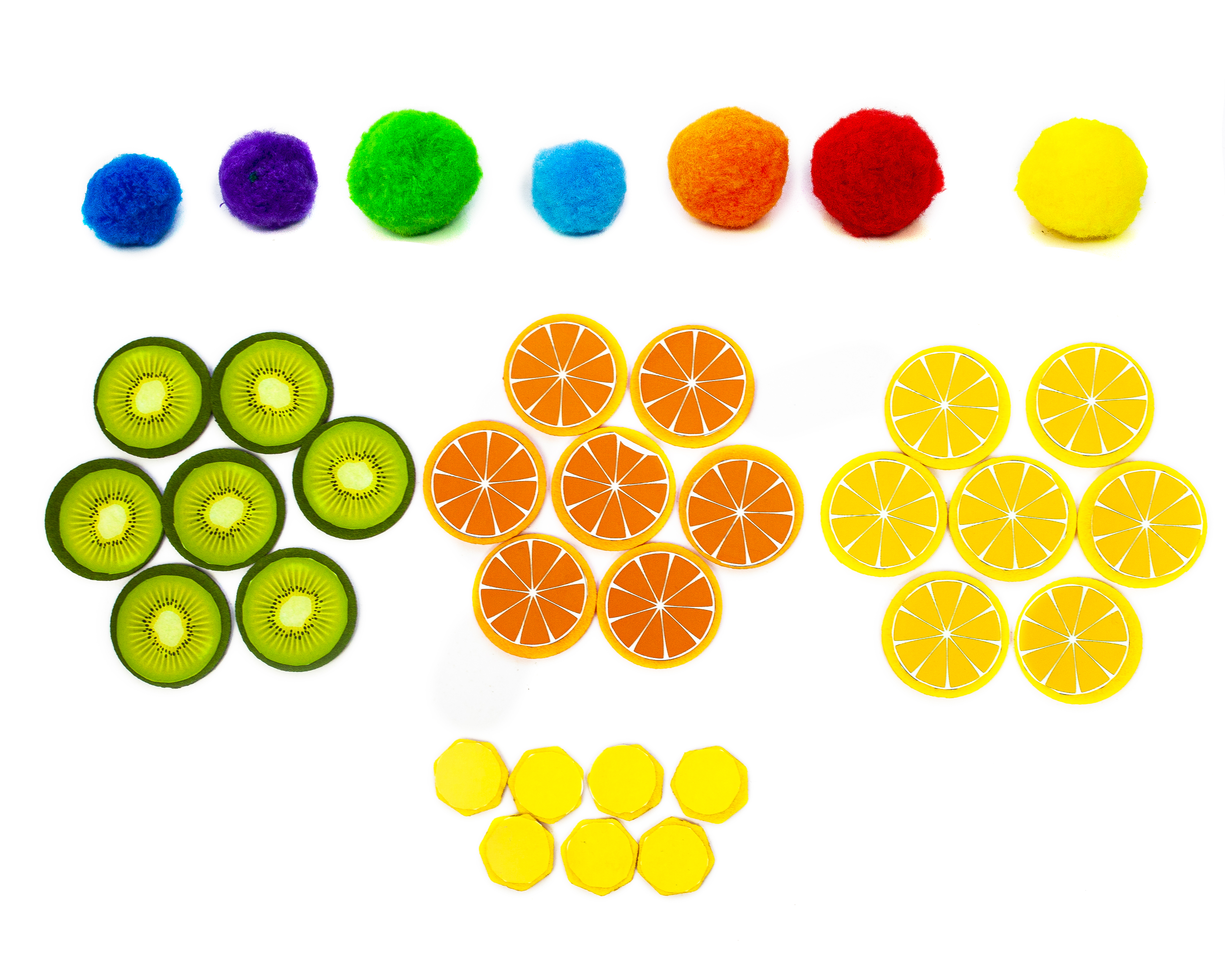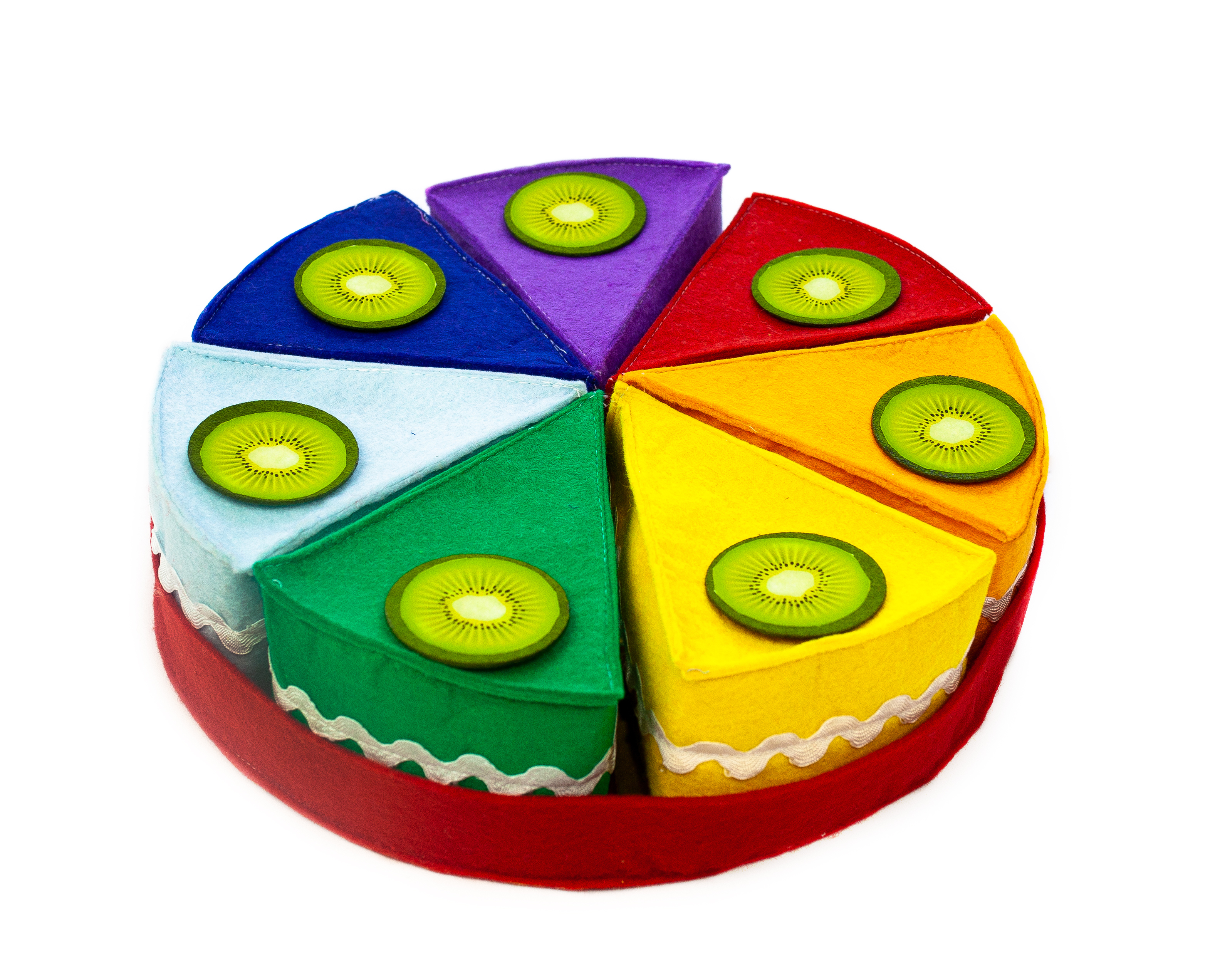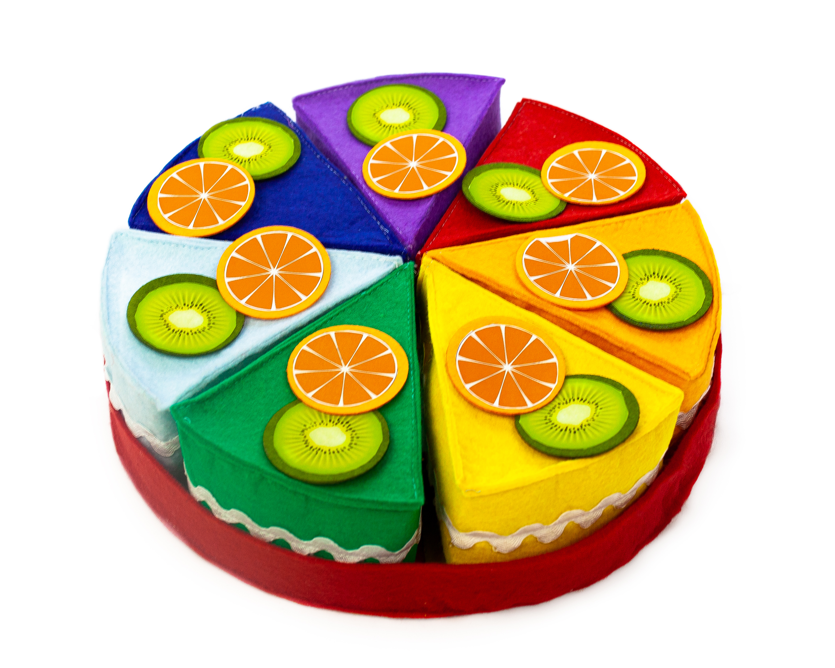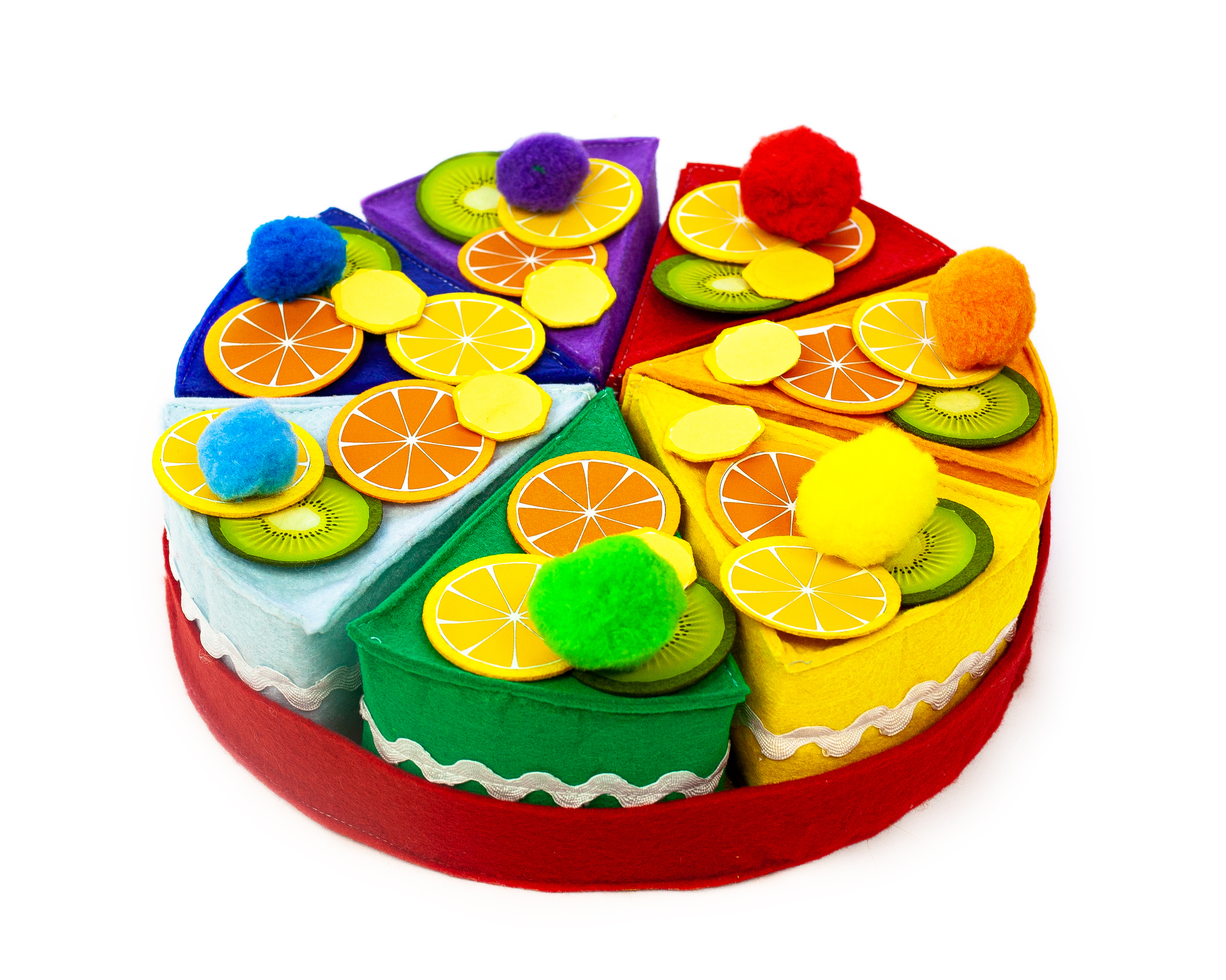 Комплектация: тарелка для торта внутри которой разметка для 7 кусочков по цвету, 7 кусочков торта  по цветам радуги, украшеия для торта: 7 бананов, апельсинов, киви и лимонов, 7 помпонов (зефирки) цветов радуги, мешок для хранения с карманом для мелких деталей..