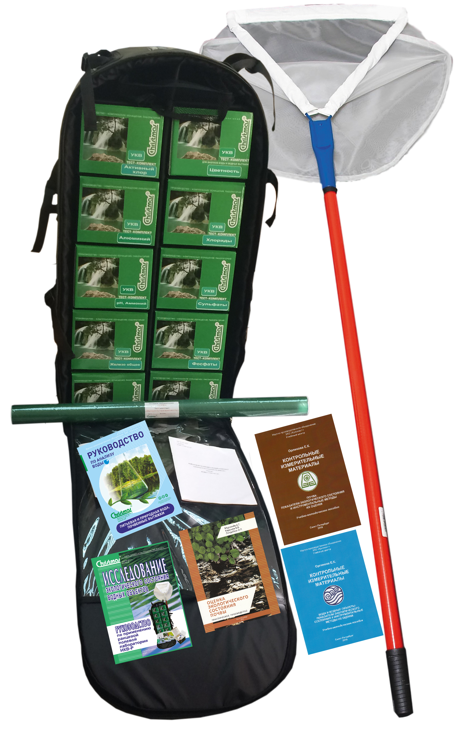 Включает в ранцевой укладке (объём 100 л): 10 тест-комплектов, комплект тест-систем, набор принадлежностей к тест-системам для химического анализа воды «НПТ-вода», набор для гидробиологических исследований, весы электронные, средства индивидуальной защиты, набор принадлежностей, термометр, документация. Отдельно от ранца: тест-комплект «Мутность/прозрачность», сачок гидробиологический специальный СГС.