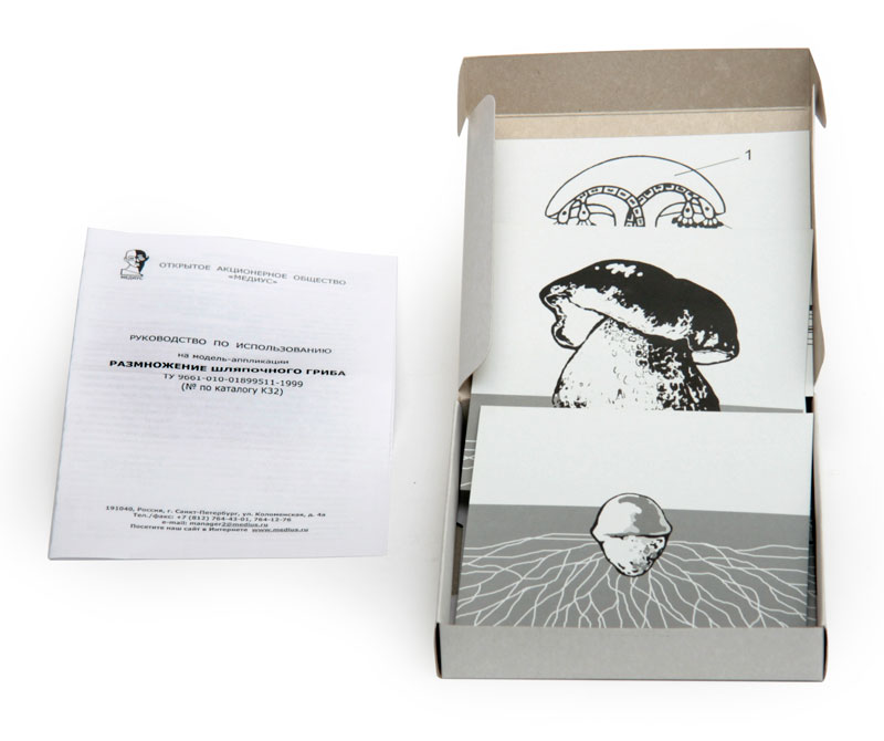 Модель состоит из следующих компонентов: 1 - плодовое тело трубчатого гриба (белого гриба); 2 - части нижней стороны шляпки трубчатого гриба; 3 - плодовое тело пластинчатого гриба (красный мухомор); 4 - часть нижней стороны шляпки пластинчатого гриба; 5 - прорастание споры; 6; 7; 8; 9 - образование грибницы и плодового тела белого гриба.