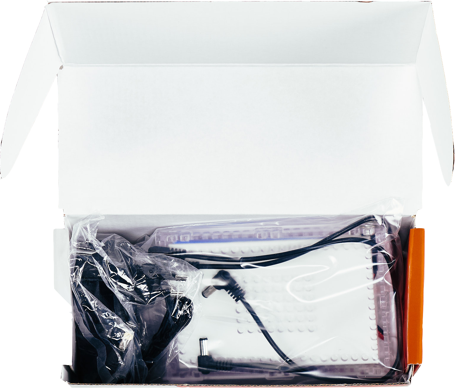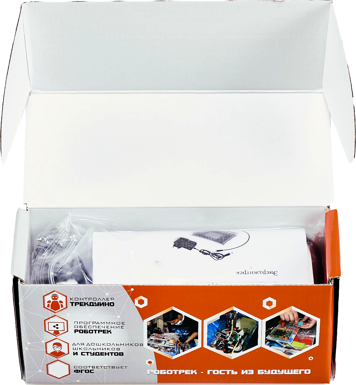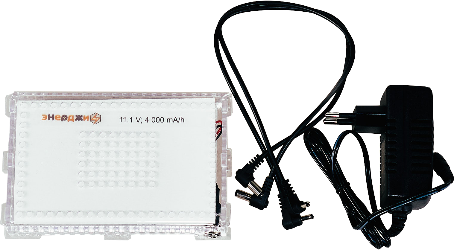 Для подключения к механическим блокам конструктора «Роботрек» на корпусе имеются специальные отверстия. общий разъем для зарядника и потребителей питания. В корпусе есть защитная подложка.