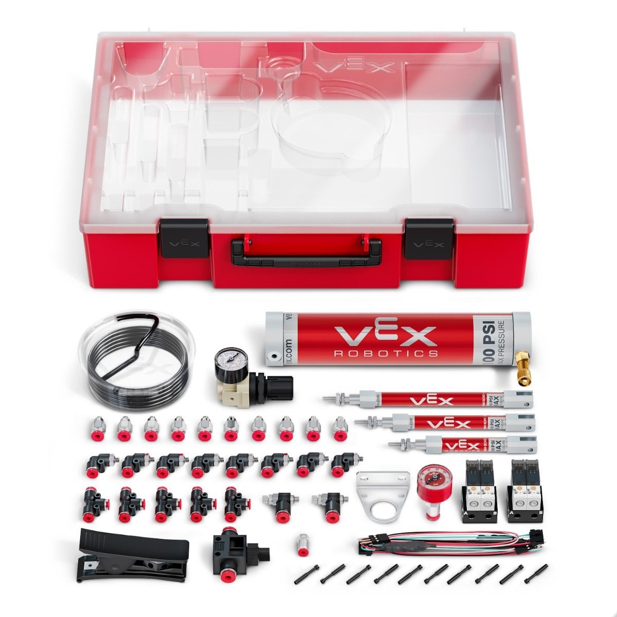 Комплект содержит всё необходимое для работы с пневматикой на уроках или в условиях соревнований по робототехнике VEX. Пневматика обеспечивает быстрое и мощное линейное движение, которое полезно в самых разных инженерных системах. Пневматическую систему можно использовать для управления захватом робота или любого другого механизма, требующего быстрое движение. В частности, пневматика полезна в приложениях, имеющих только два состояния (открыто/закрыто, вверх/вниз и т. д.).
