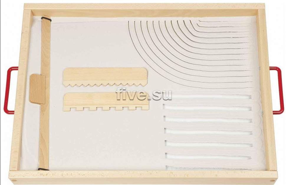 Размер: 65х50х5 см Песочница-поддон из сосны с ручками и дном из безопасного стекла - 1 шт. Инструменты для рисования на песке - 2 шт. Выравниватель для песка - 1 шт. белый кварцевый песок фр 0,1-0,3 - 1 кг