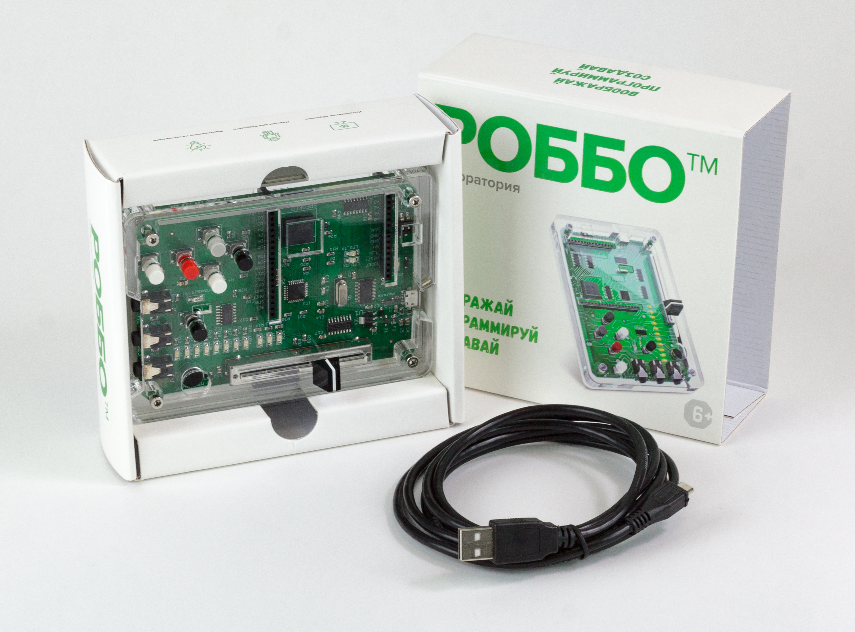 РОББО Лаборатория помогает научить детей получать данные из внешних источников (сенсоров), калибровать их, обрабатывать полученную информацию и использовать ее при написании программ. Это специальная плата, подключив которую к компьютеру вы получите доступ к внешним датчикам и устройствам управления (сенсорам в терминологии Scratch). РОББО лаборатория дает возможность взаимодействовать с персонажами, управлять ситуацией в проектах или каким-то образом познавать окружающий мир без использования клавиатуры и мыши.