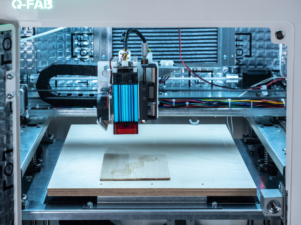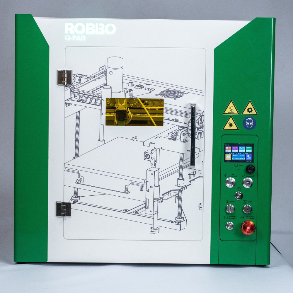 Многофункциональная универсальная платформа «РОББО Q-Fab» не только осуществляет печать термопластиком, в ней также предусмотрены 3D функции фрезерования, лазерной гравировки и резки. Для этого устройство оснащено двумя экструдерами для печати ABS и PLA пластиками, фрезером с воздушным охлаждением и лазерным модулем. Такой 3D принтер имеет подогреваемый рабочий стол и закрытую термокамеру.