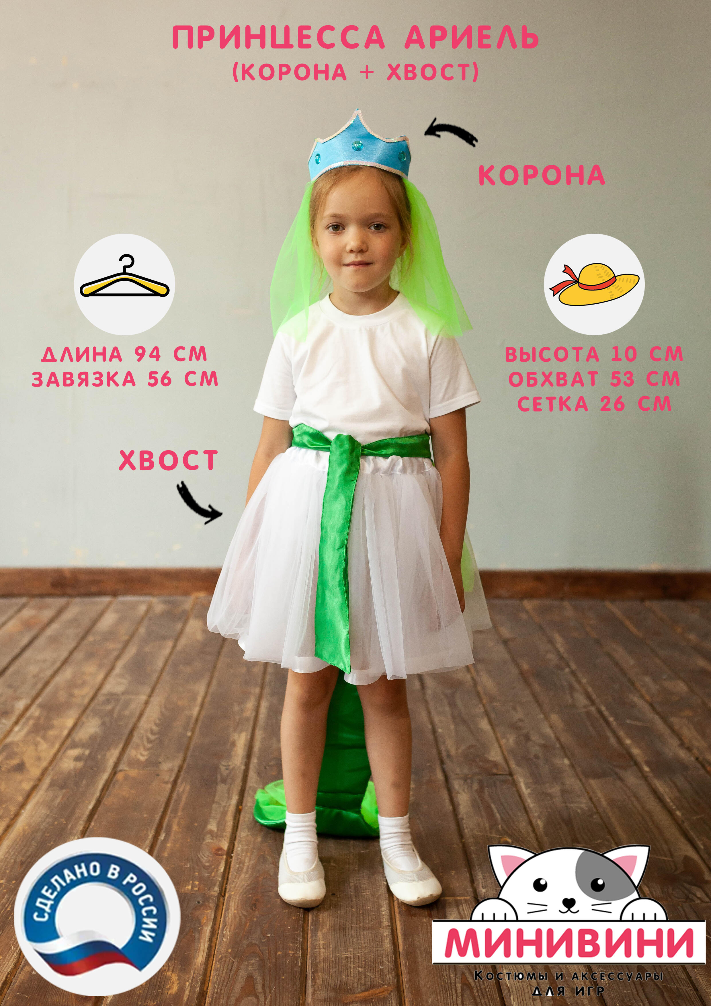 Размер: длина хвоста 94 см, завязки длина 56 см, высота короны 10 см, обхват короны 53 см, длина сетки на короне 26 см.