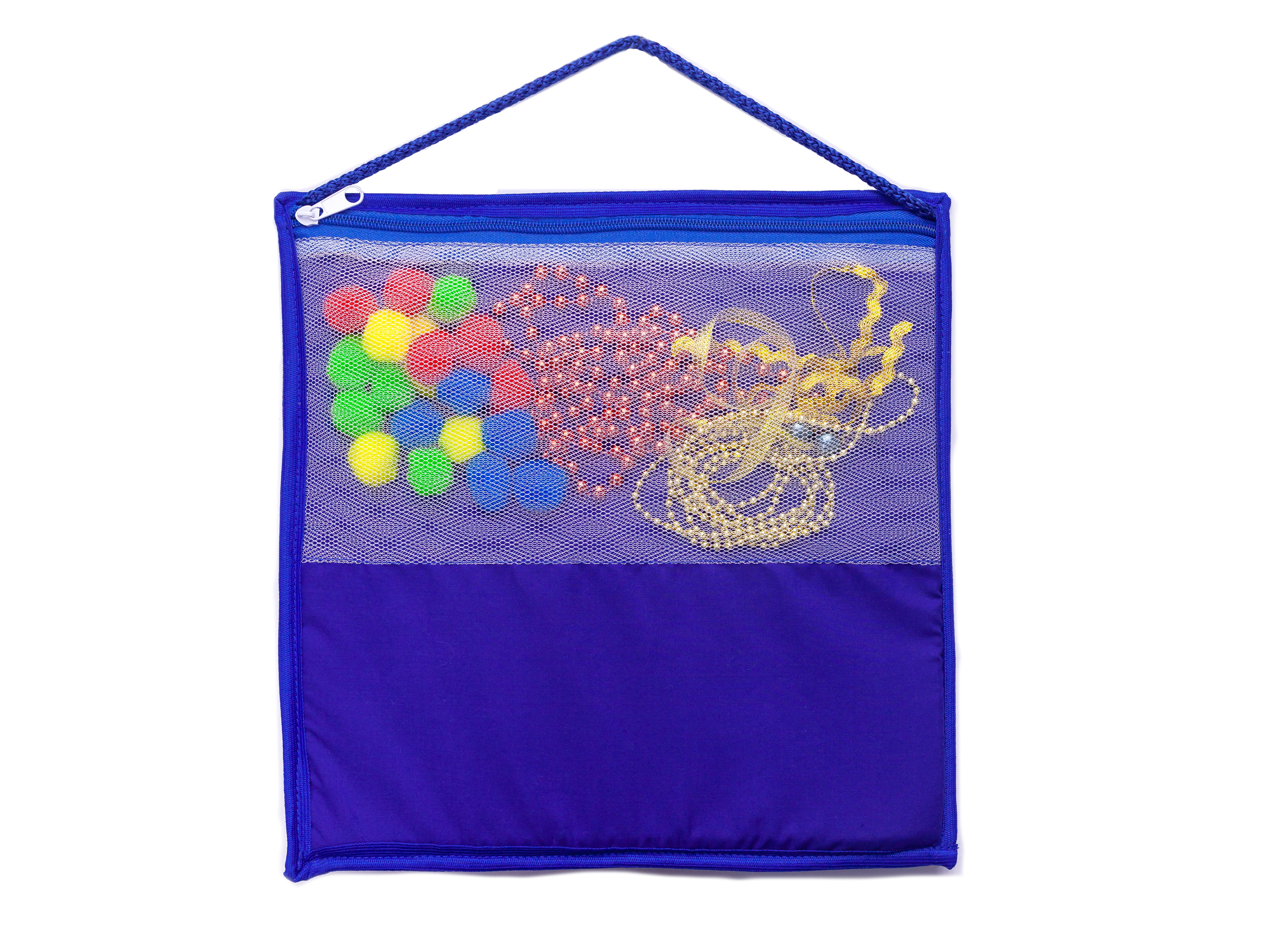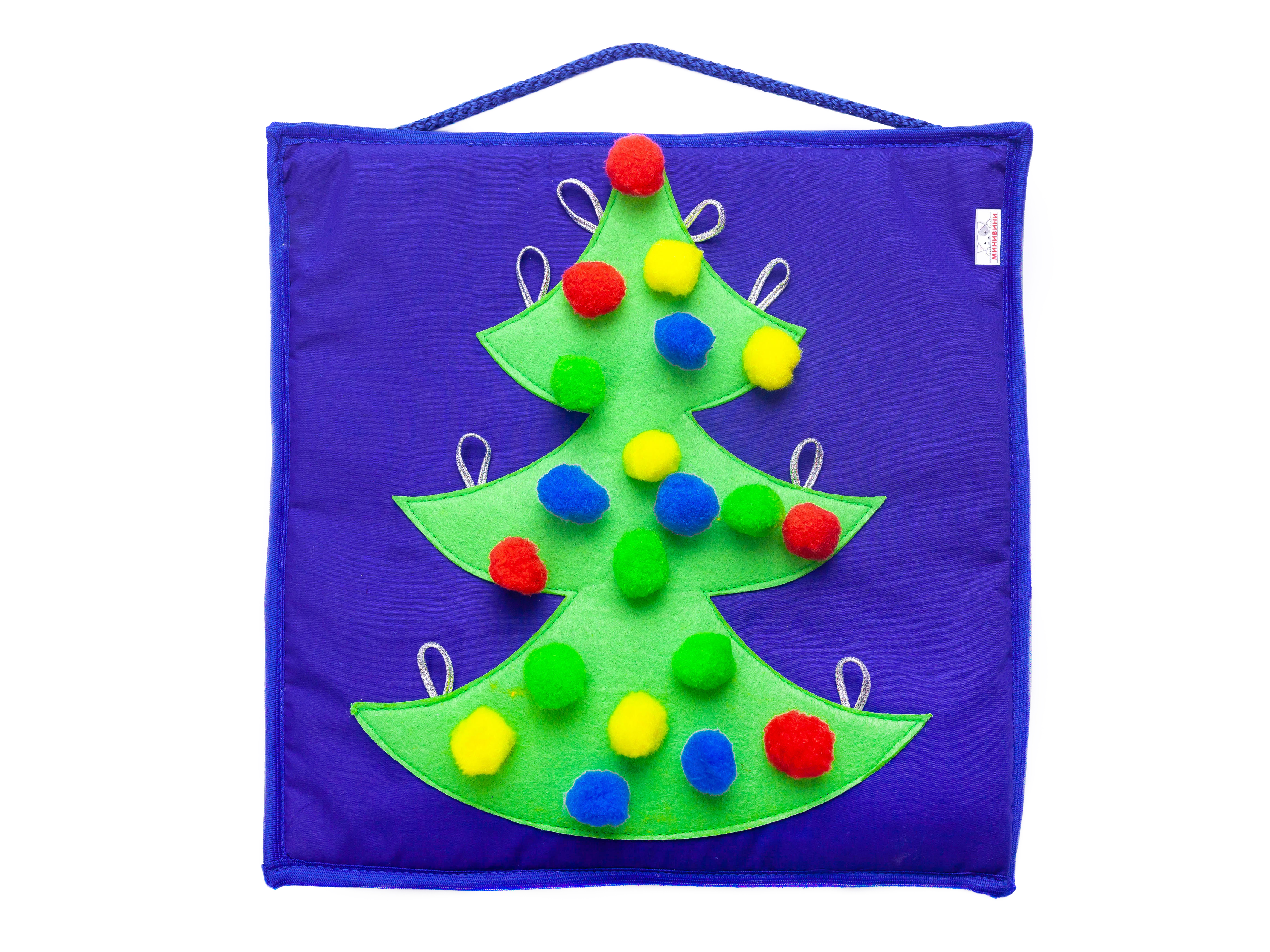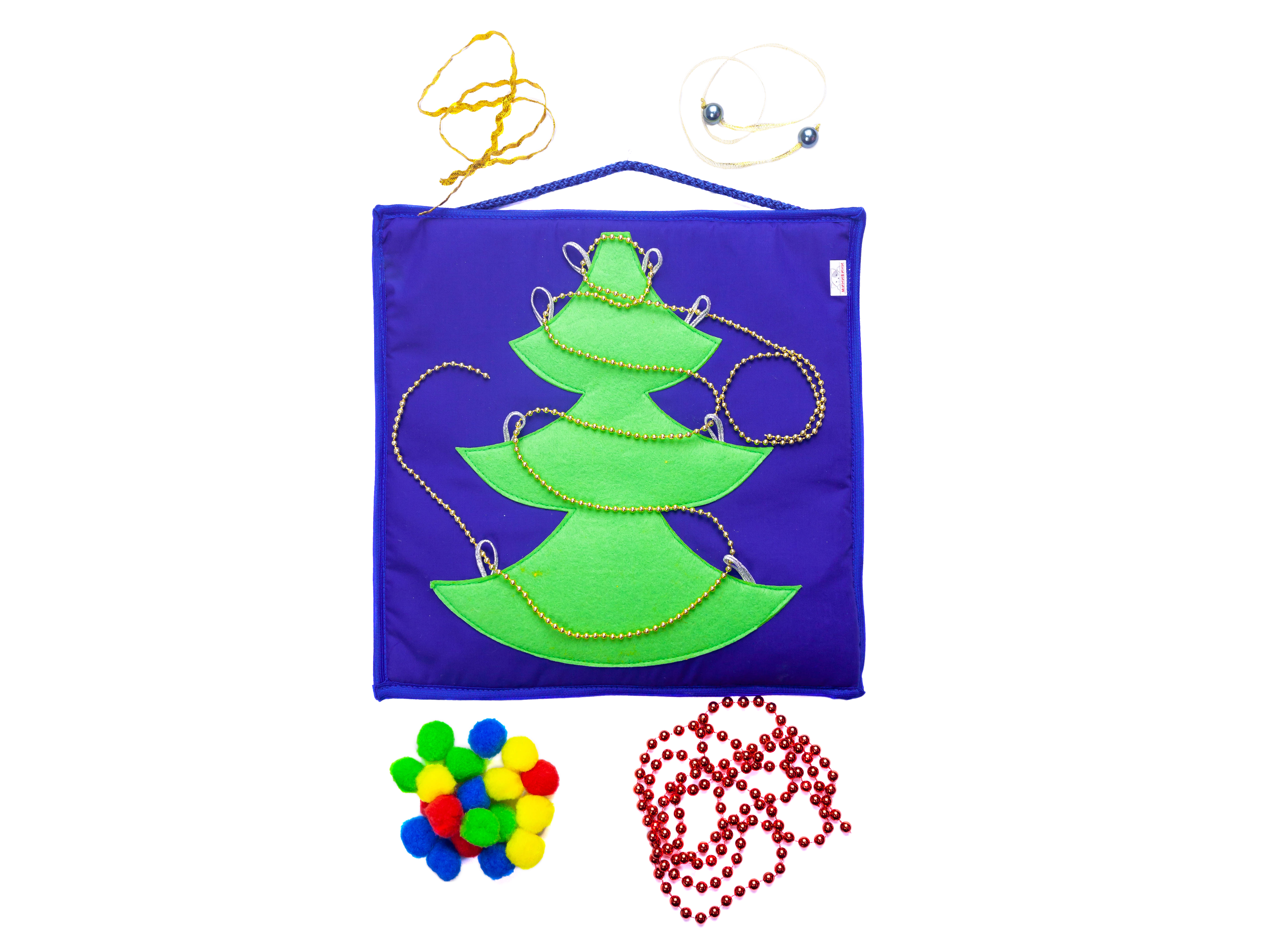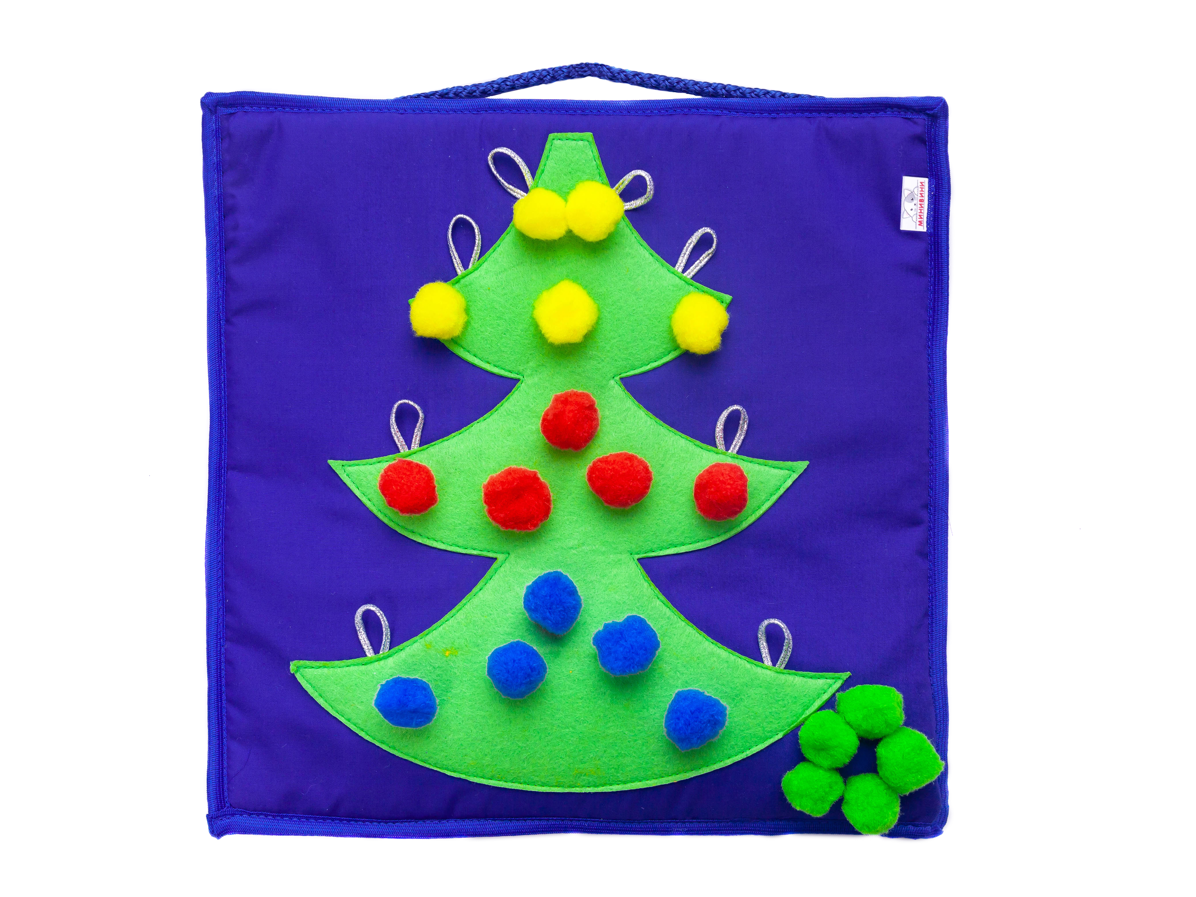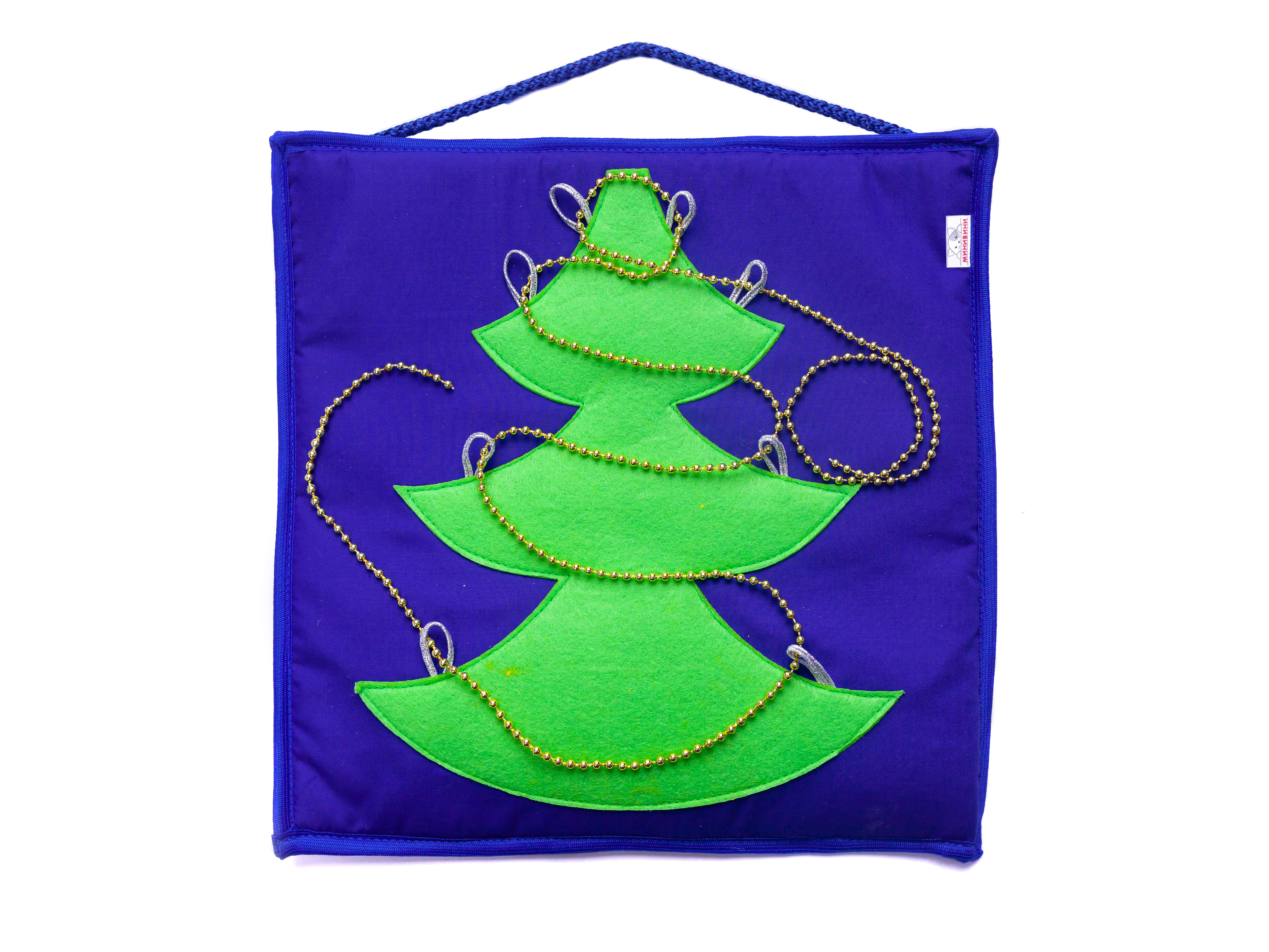 Комплектация:  на квадрат нашита елочка из зеленого фетра, к ней пришиты серебряные петельки (всего 12 штук), сзади 2 кармана из сетки на молнии, помпоны диаметром 3 см 20 штук (4 цвета по 5 штук), гирлянда из бус 2 шт, металлизированная лента, вьюнчик длиной 60 см.
