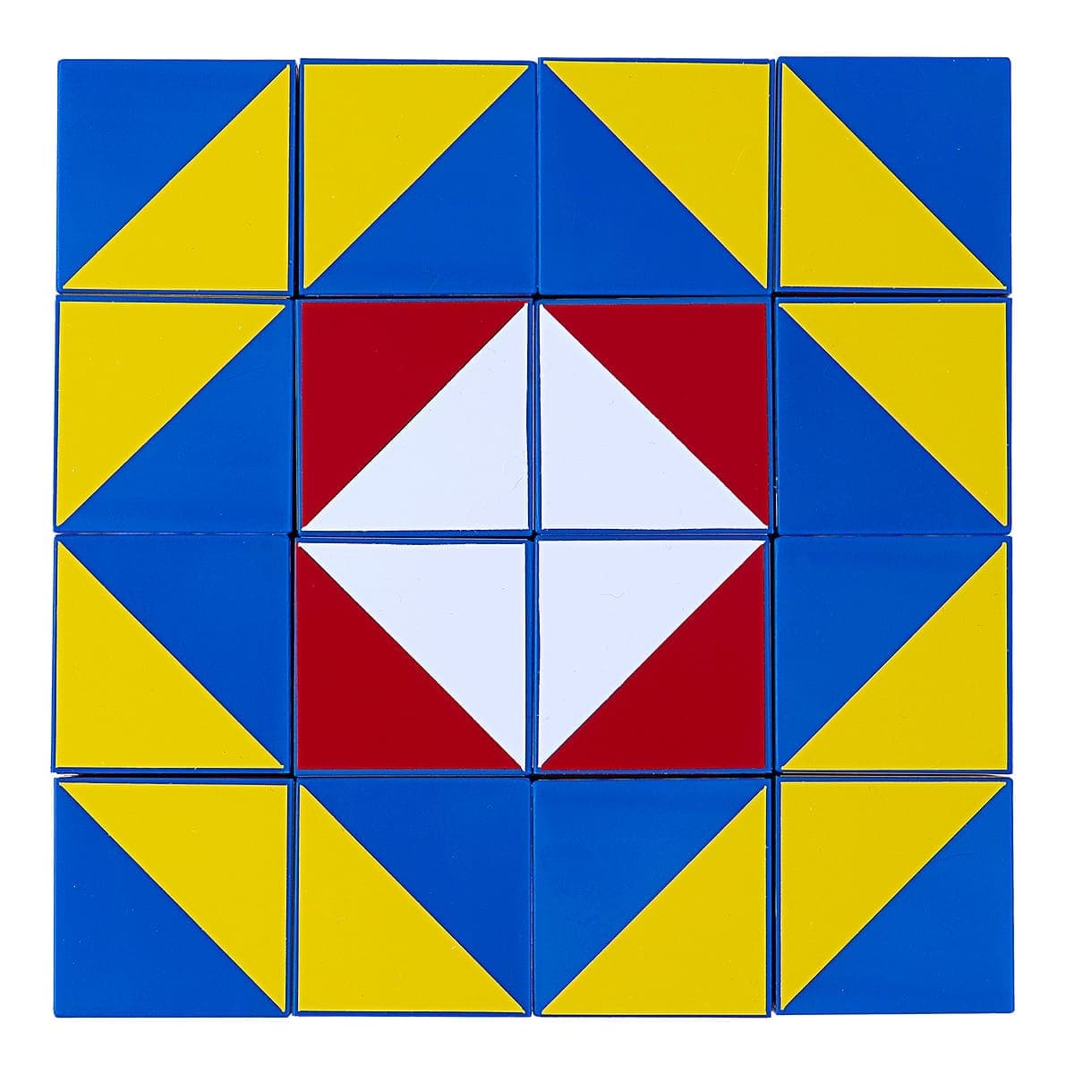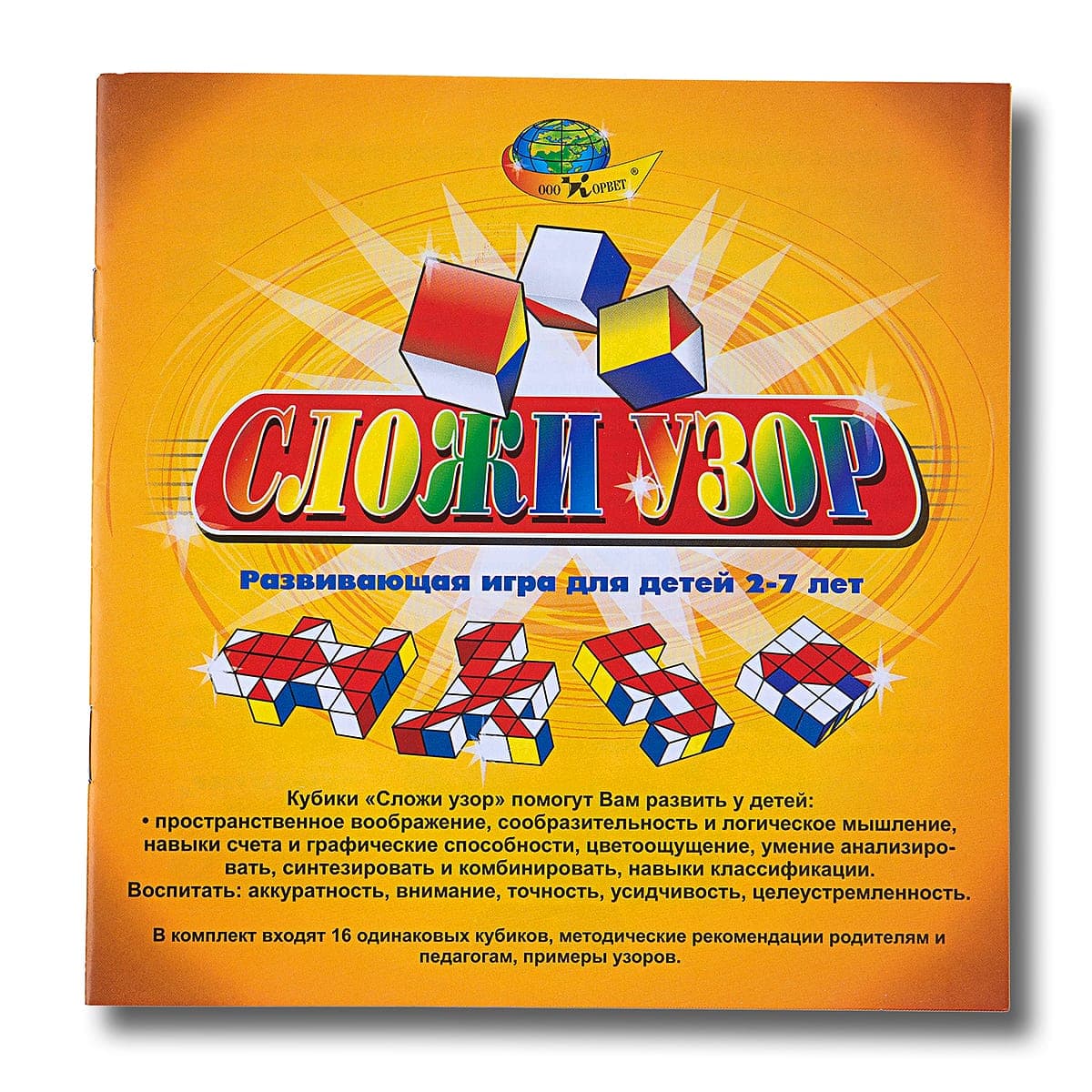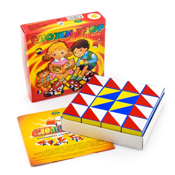 Игра состоит из 16 кубиков (размер кубика 4х4х4 см), грани которых окрашены в четыре цвета (красный, синий, жёлтый, белый) определённым образом. Методические рекомндации с заданиями. Развивает пространственное воображение, аккуратность, внимание, графические способности, умение анализировать, синтезировать и комбинировать.Занимаясь с пособием, ребенок совершенствует мелкую моторику и ориентацию в пространстве, логическое и образное мышление, цветовосприятие. Он учится видеть в абстрактных рисунках силуэты конкретных предметов.Малыш развивает умение работать по схеме, а затем и фантазию, придумывая собственные варианты рисунков. Кубики «Сложи узор» можно купить ребенку от 2 лет. Обучайтесь легко и увлекательно!