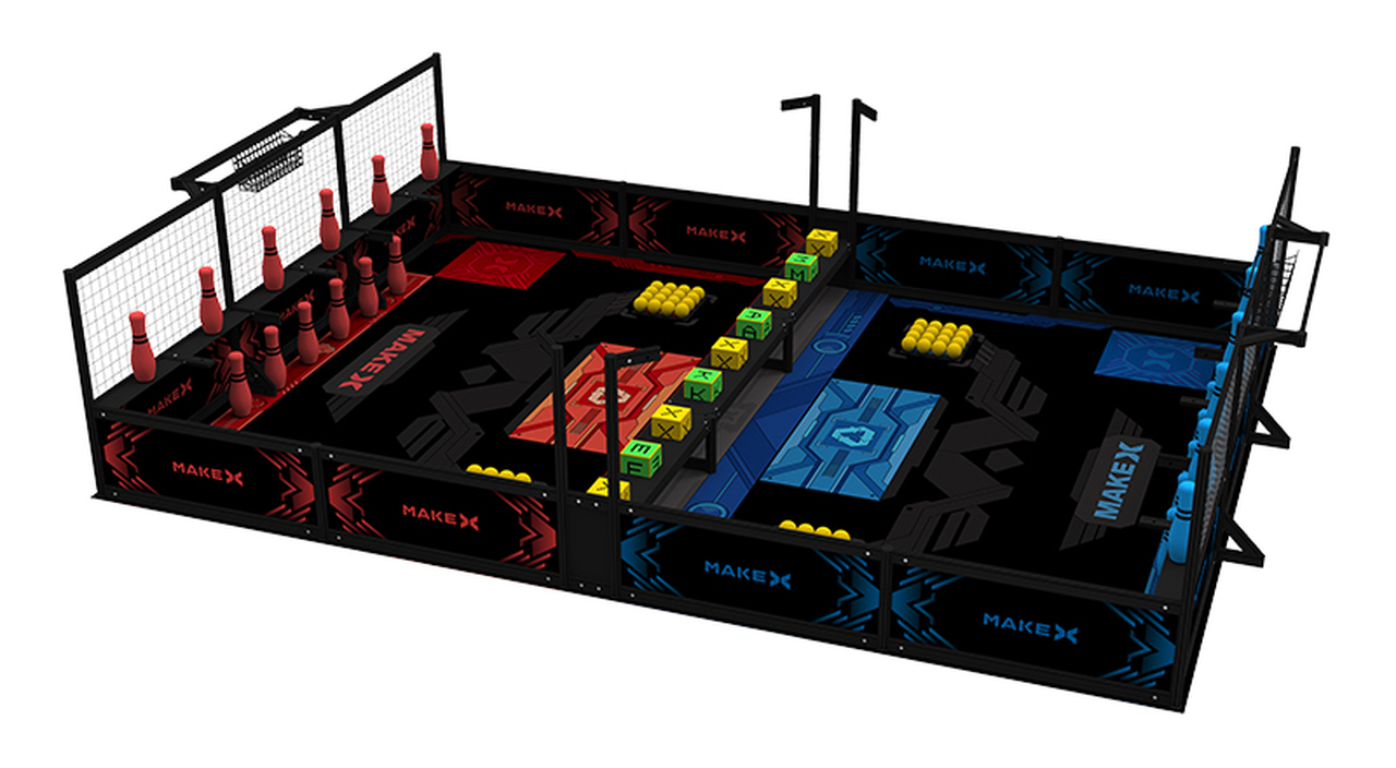 Набор конструктора поля с соревновательными элементами для проведения соревнований программируемых роботов Makeblock MakeX Challenge (регламент 2022г). Роботы должны выполнить задания по движению в автономном и ручном режиме управления по полю, передвигаясь по разметке, перемещая различные объекты на поле. Поле в сборе 4,2м*3м состоит из каркаса/ограждения, собираемого из алюминиевых балок, пластиковых пластин и соединительных элементов, защитной сетки, и самого поля напечатанного на баннерной ткани.