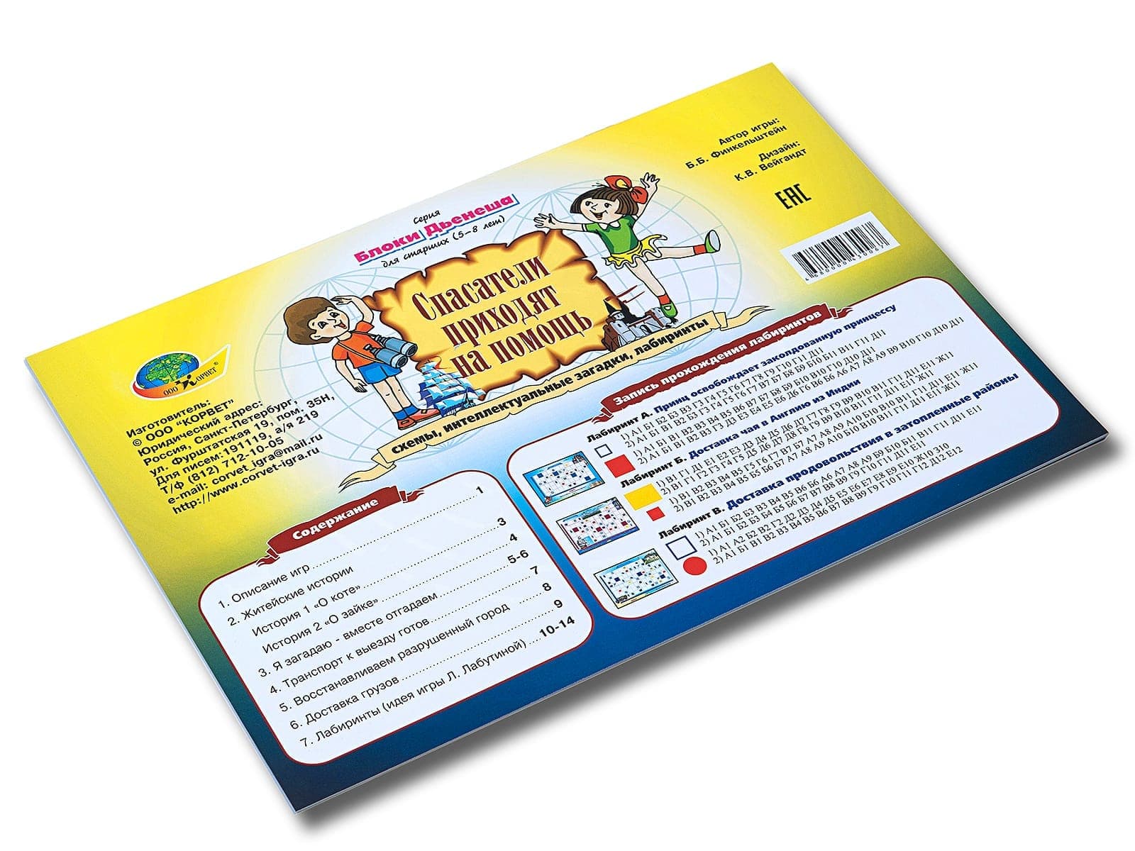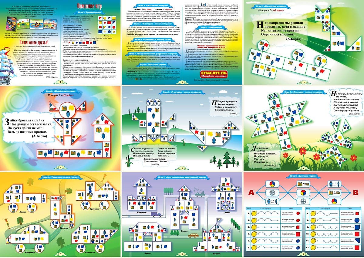 Альбом «Спасатели приходят на помощь» является составной частью игрового методического комплекса к дидактическому материалу ЛОГИЧЕСКИЕ БЛОКИ ДЬЕНЕША и предназначен для работы с детьми 5-8 лет. Как все материалы игрового методического комплекса служит для развития интеллектуальных способностей у детей. В альбоме (16 стр.А4)  7 игр для детей 5-8 лет. Развивает логическое мышление, умение кодировать и декодировать информацию о свойствах; умение строго выполнять правила при выполнении действий; развитие внимания. Развитие умений разбивать множества по одному, двум, трём свойствам, производить логические операции "не","и","или", доказательность мышления.