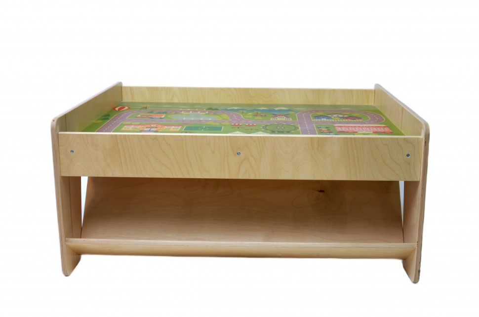 Стол со встроенной наклонной полкой для хранения деталей железной дороги.Материал : фанера, безопасный лак на водной основеРазмер : 65х83х38 см