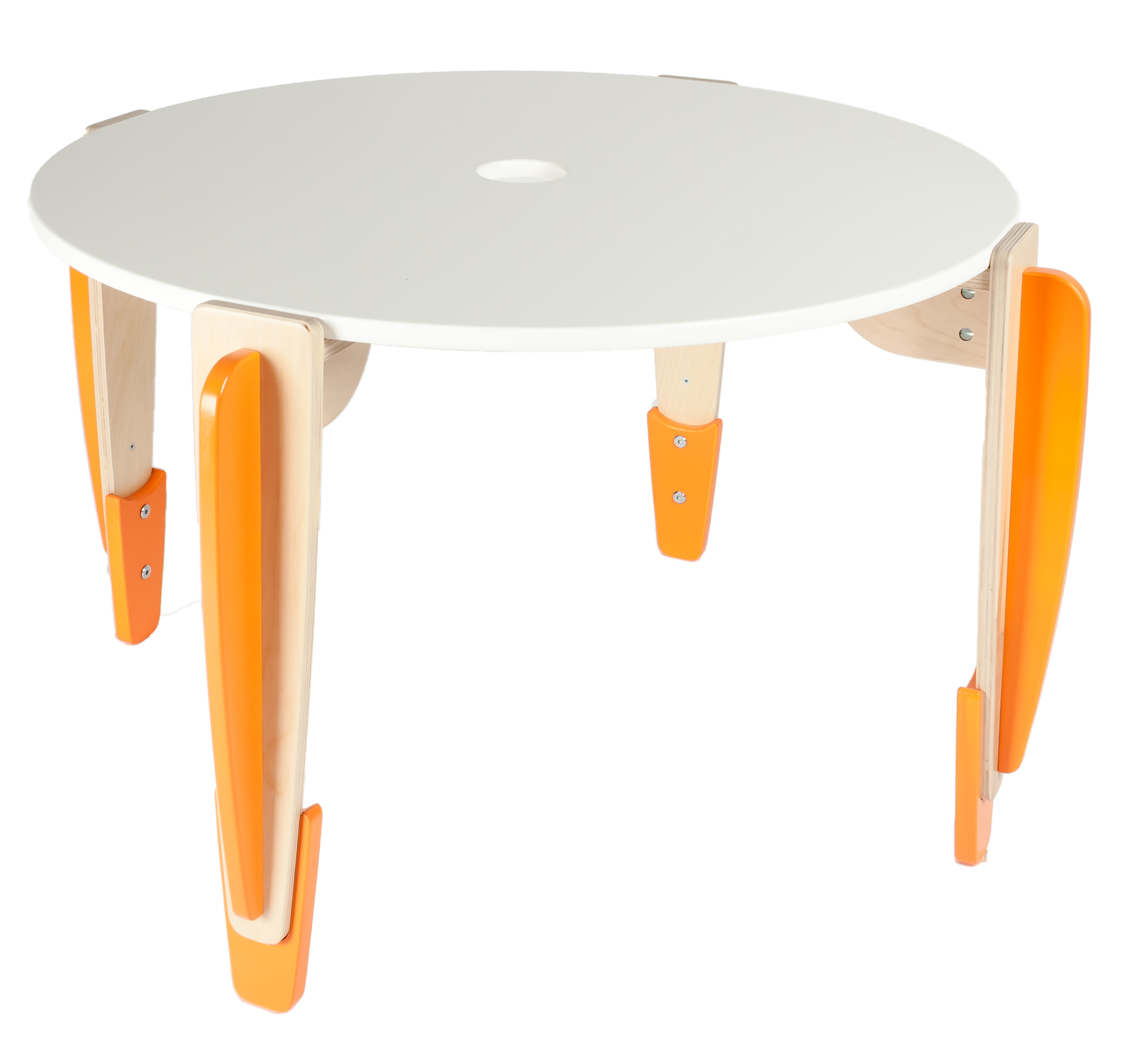Цвет столешницы белый, цвет накладок опор по согласованию с заказчиком. Опоры толщиной 12 мм, имеют ребро жесткости (декоративные цветные накладки) для усиления конструкции.