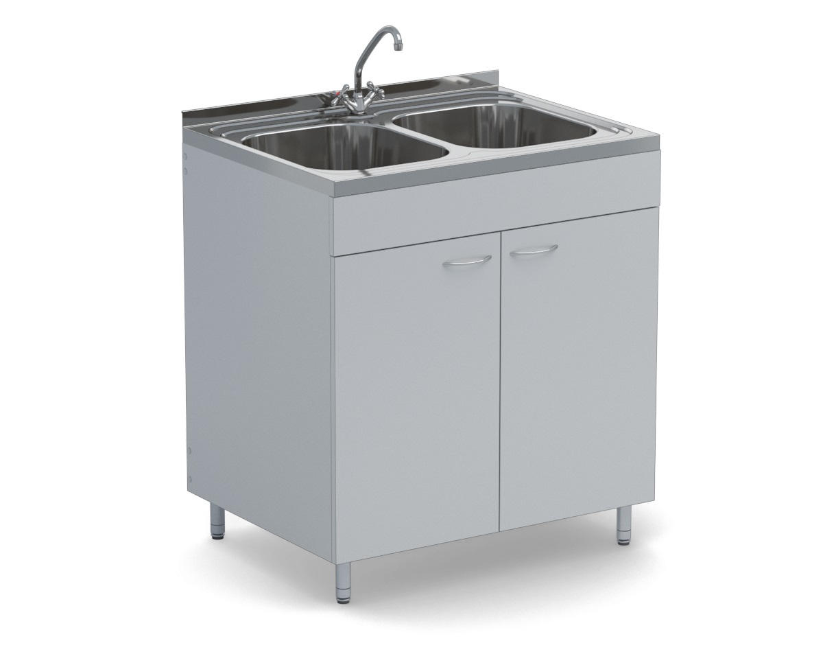 Стол лабораторный моечный включает в себя мойку-столешницу с защитным экраном от брызг, тумбу с двумя дверцами, смеситель, сифон, гибкую подводку. Мойка-столешница изготовлена из нержавеющей стали. Тумба выполнена из ЛДСП 16мм (цвет — светло-серый). Кромка ПВХ 2мм. Размер: 800х600х900 мм.