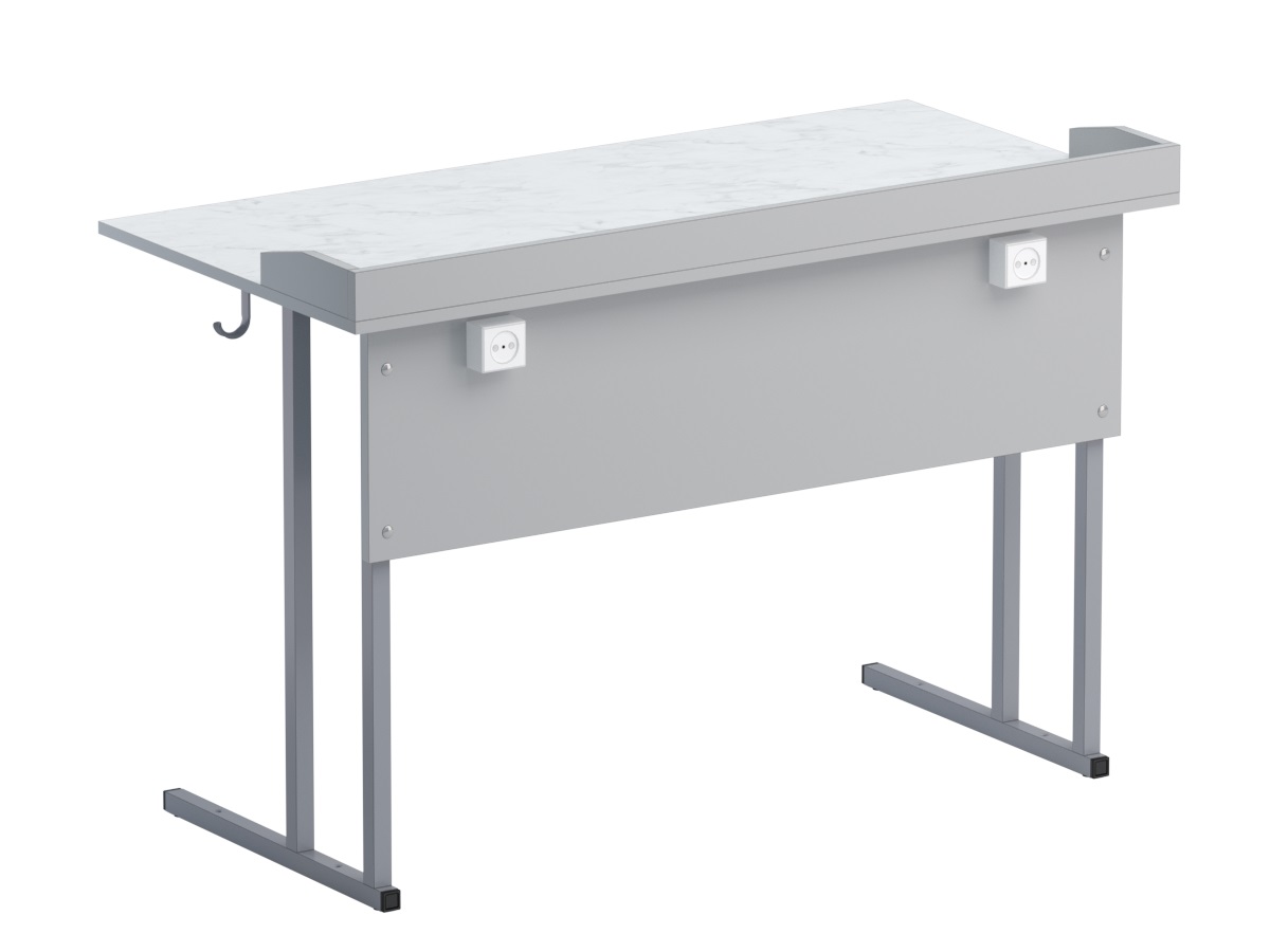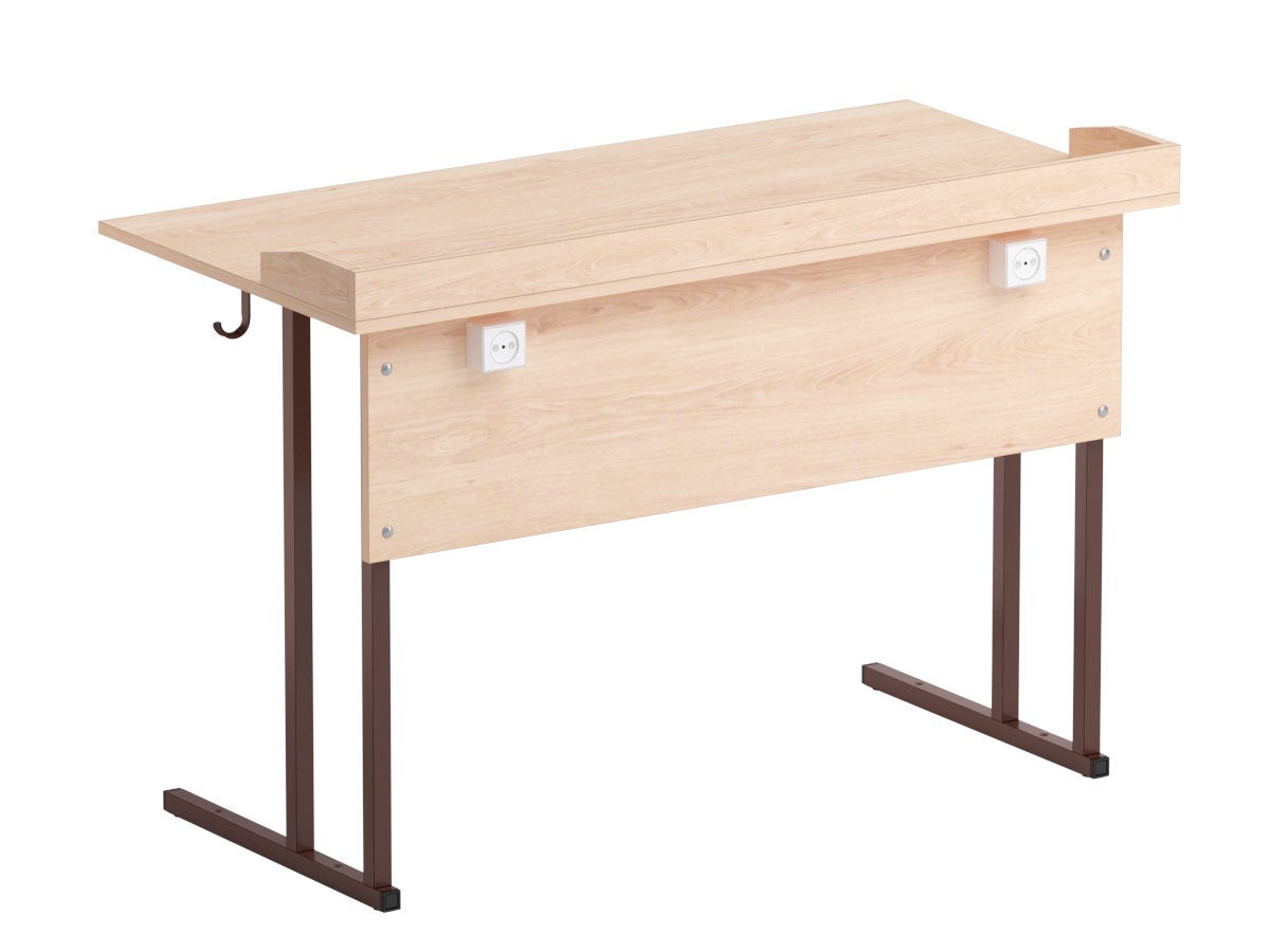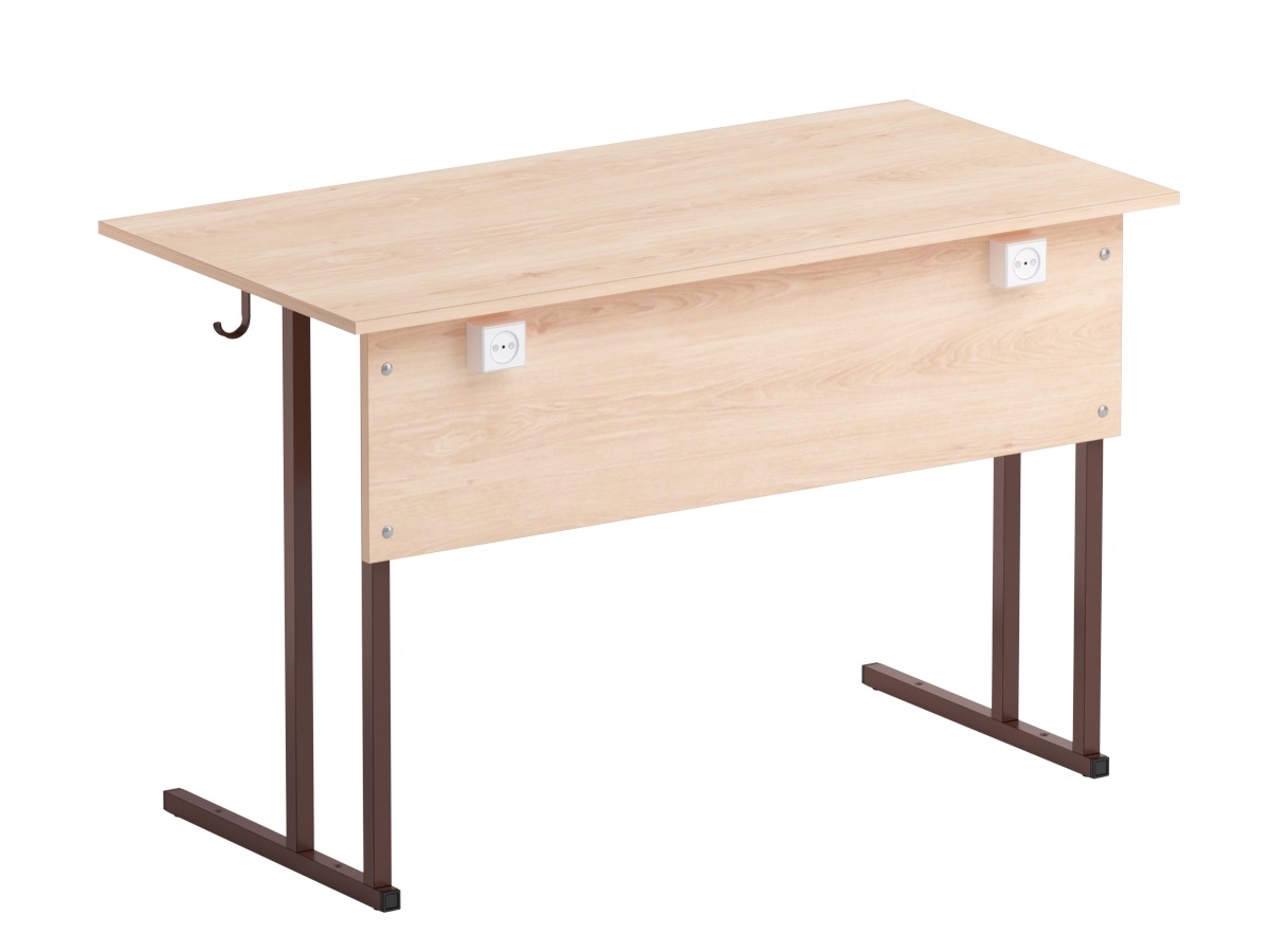 Стол ученический двухместный для кабинета физики изготавливается на металлическом каркасе прямоугольного сечения, окрашенном порошковой краской, стойкой к химическим и механическим воздействиям, на свободных концах труб установлены заглушки из ударопрочных полимеров. Столешница выполнена из ДСП 16 мм, облицована стойким к химическим воздействиям пластиком, торцы обрамлены крмокой ПВХ 2 мм. Крепление металлической основы со столешницей осуществляется методом скрытого крепления, без выступающих на рабочей поверхности болтов. Стол комплектуется двумя электрическими розетками 36…42 V, для электропроводки в каркасе предусмотрены отверстия. Имеется два крючка для портфелей. Каркас стола имеет полимерные подпятники, предотвращающие повреждение напольных покрытий. Внимание! Если стол с бортиком, цена изменится. Размер: 1200х600х760 мм.