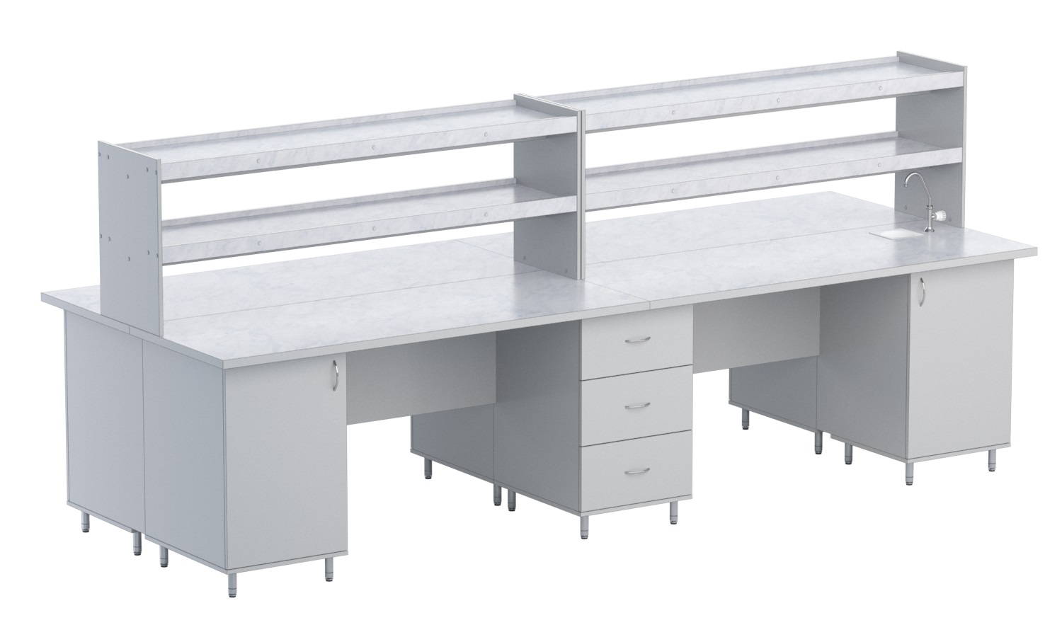 Все тумбы оснащены регулируемыми по высоте цокольными опорами. На одной из столешниц установлена лабораторная раковина с краном для холодной воды.