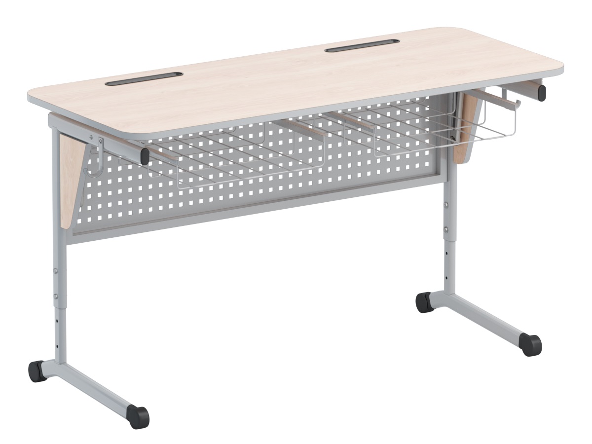 Стол ученический, 2-х местный, регулируемый по высоте (гр.р. 3-5) и плавной регулировкой наклона столешницы от 0 до 24 градусов с перфорируемой панелью на плоскоовальной трубе. Стол изготовлен на металлическом каркасе с прямоугольной столешницей и закруглёнными R60 углами из ламинированной ДСП 16мм. Столешница облицована кромкой ПВХ толщиной 2мм, на рабочей поверхности имеется выемка для ручек, карандашей и других принадлежностей. Каркас стола состоит из нижних подвижных опор. На вертикальных стойках закреплена панель с перфорацией. Подвижные опоры выполнены цельносварными из плоскоовальной трубы. Имеется крючок для портфеля. На концах подвижных опор установлены опоры из ударопрочного полимера, которые не повреждают поверхность напольных покрытий. Весь металлический каркас и перфорированная панель покрыты стойким порошковым полимерным покрытием. Размеры: