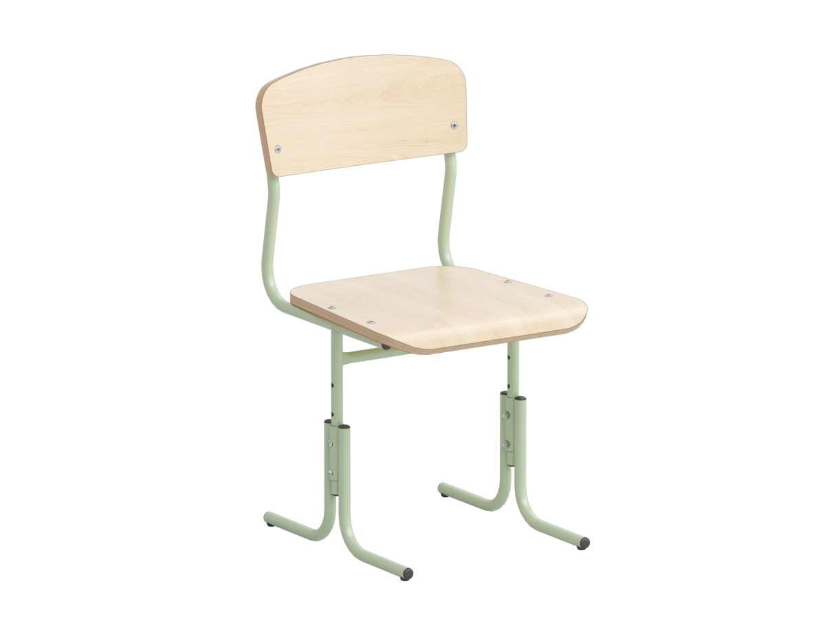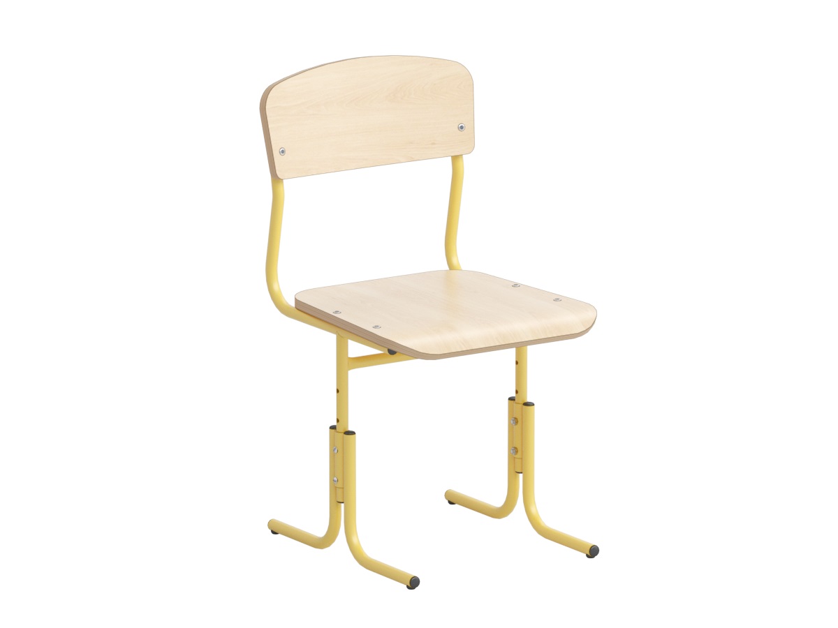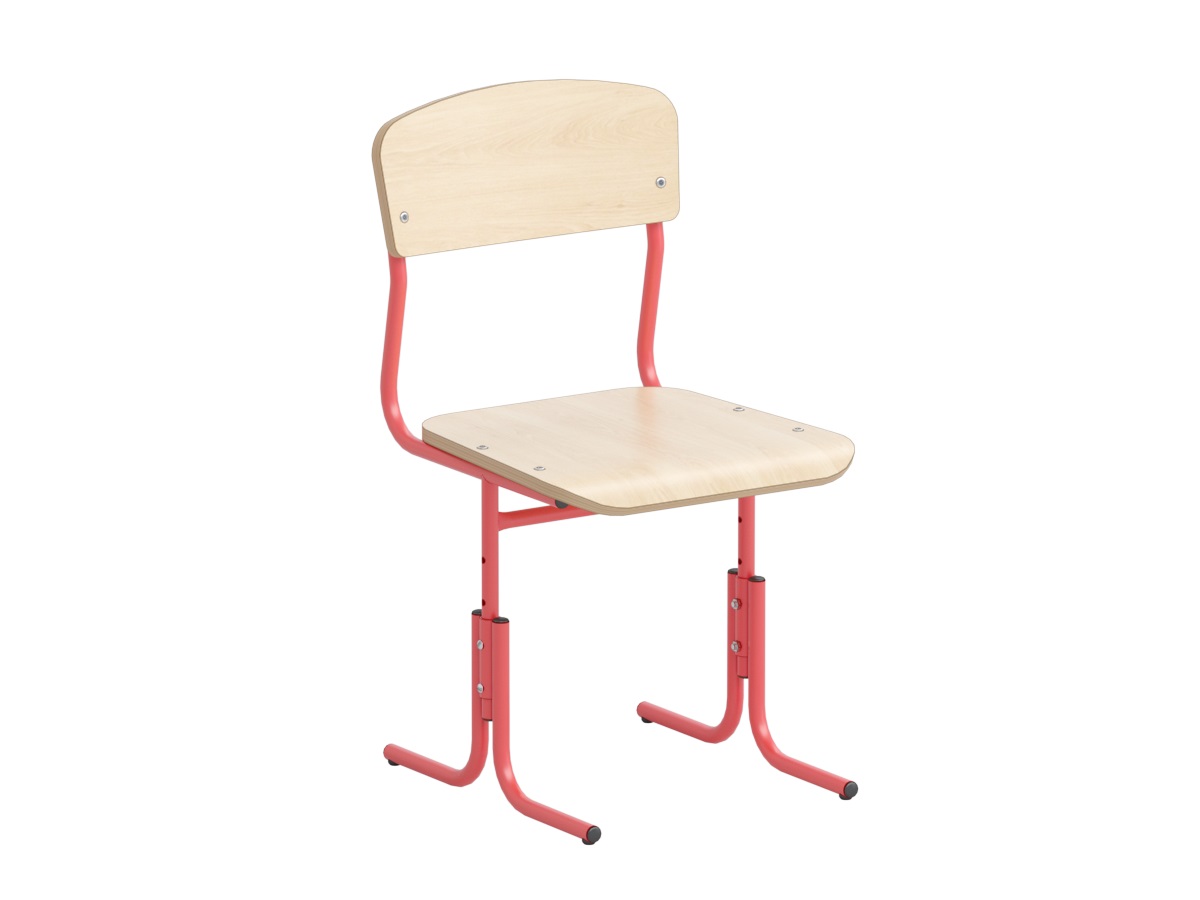 Спинка и сиденье крепятся к каркасу вытяжными заклепками. Каркас стула представляет собой сборную конструкцию из трёх частей: каркаса подвижного, являющегося основанием сиденья и спинки стула, и двух опор неподвижных, служащих стулу ножками. Каркас стула выполнен из трубы Ø16 и Ø20 мм. Регулировка высоты и крепление неподвижных опор к подвижному каркасу осуществляется четырьмя болтами М6 (по два на каждую сторону). Каркас покрыт стойкой порошковой эмалью. На свободных концах труб установлены заглушки. В нижней части неподвижных опор установлены подпятники, предотвращающие напольное покрытие от повреждения. Заглушки и подпятники выполнены из ударопрочного материала. Стул детский регулируемый по высоте, позволяет установить нужные параметры индивидуально, в зависимости от роста детей.