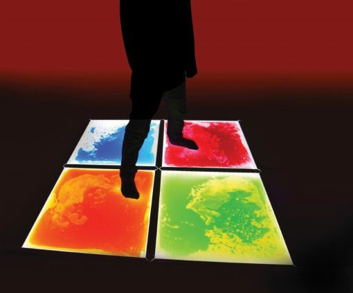 Светящийся пол всегда вызывает интерес, а когда он еще и меняется, то оторваться невозможно. В основание с подсветкой (цвет меняется с пульта) встроены 4 сенсорных плитки с цветным гелем внутри (цвета случайные), при наступании на которые гель движется и смешивается, меняя рисунок.Материалы : фанера, пластик, светодиодная лентаРазмер : 105х105х4 см