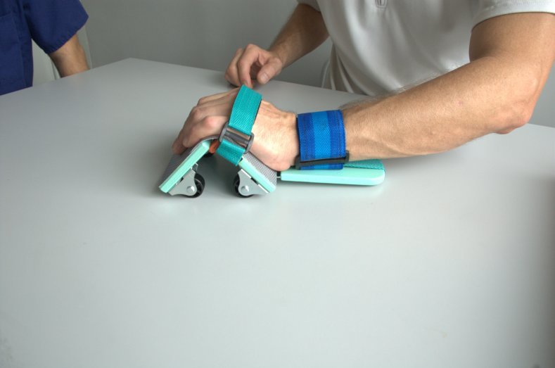 Тренажер предназначен для сознательной тренировки мышц разгибателей ладони и пальцев в режиме напряжение-расслабление, улучшения подвижности локтевого и плечевого суставов.Занятия улучшают координацию и повышают объем движений руки, улучшают кровообращение.