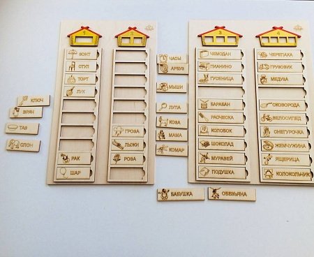 В комплекте 2 основы - слоговые домики и карточки с картинками и текстом на разное количество слогов (от 1 до 4) Игра «слоговые домики» поможет интересно научить ребенка читать, определять количество слогов и ставить правильное ударение в словах. Как играть раскладываем слова в зависимости от количества слогов, из которых они состоят (для начала возьмите только слова, состоящие из одного и двух слогов) добавляем предлоги и составляем из разбросанных слов логическое предложение или истории выделяем ударные слоги определяем наличие и место заданного звука в слове. отгадываем, какие гласные есть в словах, потом проверяем по карточке(сначала только с одним слогом, как только ребенок начнет правильно определять гласные в словах с одним слогом, переходим ко второму домику с двумя слогами и так постепенно и медленно от простого к сложному). Что в комплекте Игра состоит из двух больших планшетов размером 38*25 см. На одном планшете - домики и слова, состоящие из одного и двух слогов, на втором планшете - из трех и четырех. На каждый слоговый домик - 10 деревянных карточек со словами. Размеры карточек - 10x2,5 см.
