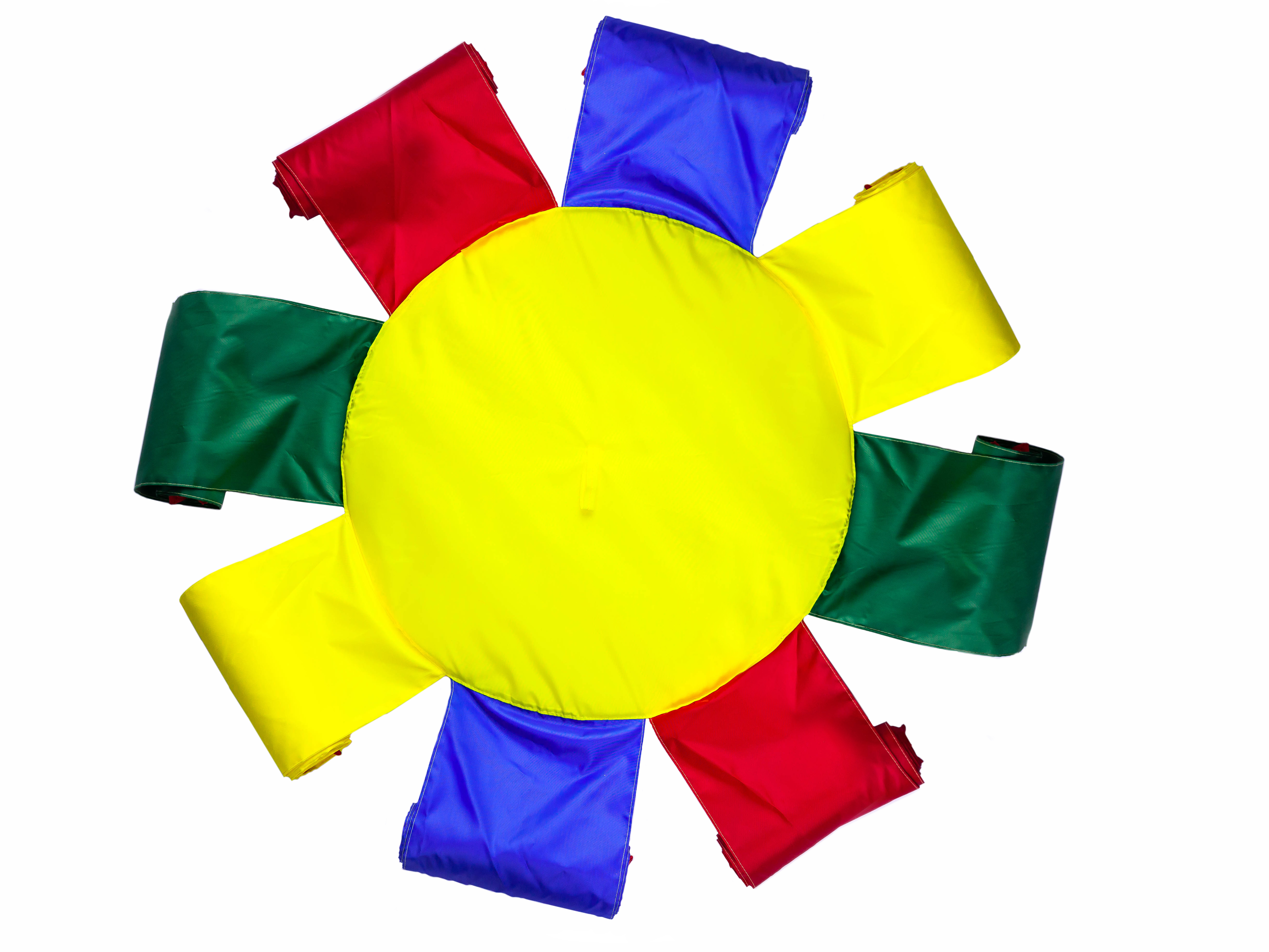 Размер: диаметр круга 50 см,  ширина  лепестка 20 см,  на конце лепестка вшита мягкая труба, чтобы детям было удобно держаться за него и выполнять упражнения (скручивать и раскручивать лепестки). Длина лепестка у 3-х метрового цветика - 125 см + держатель, 5-ти метрового - 225 см + держатель.