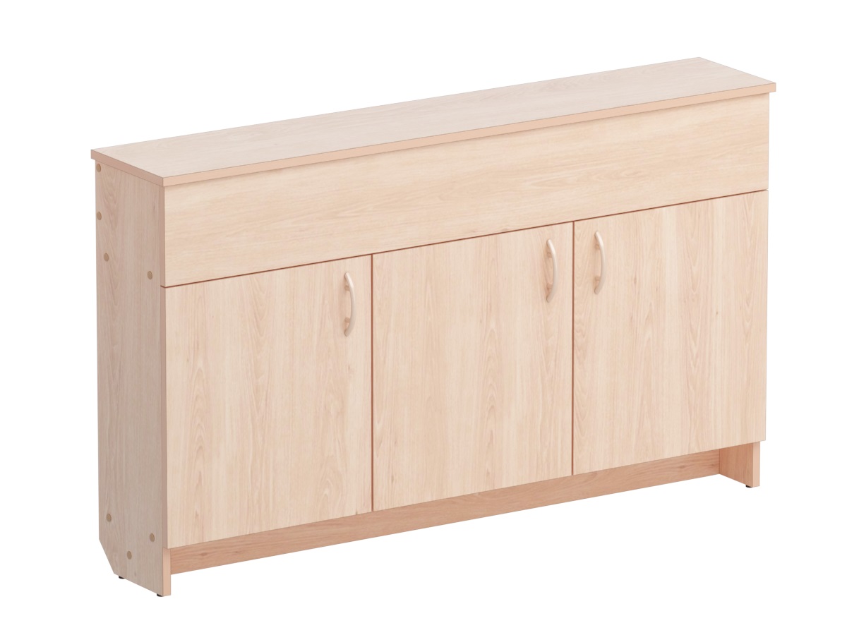 Тумба для классной доски изготавливается из ламинированной ДСП 16 мм. Имеет верхнее отделение для хранения карт, плакатов, нижние - для геометрических наборов, мела и прочего. Вертикальные стенки тумбы классной доски имеют полимерные подпятники, защищающие напольные покрытия от повреждений. В комплект входит фурнитура для крепления тумбы к стене. Размер: 1263х240х760 мм.