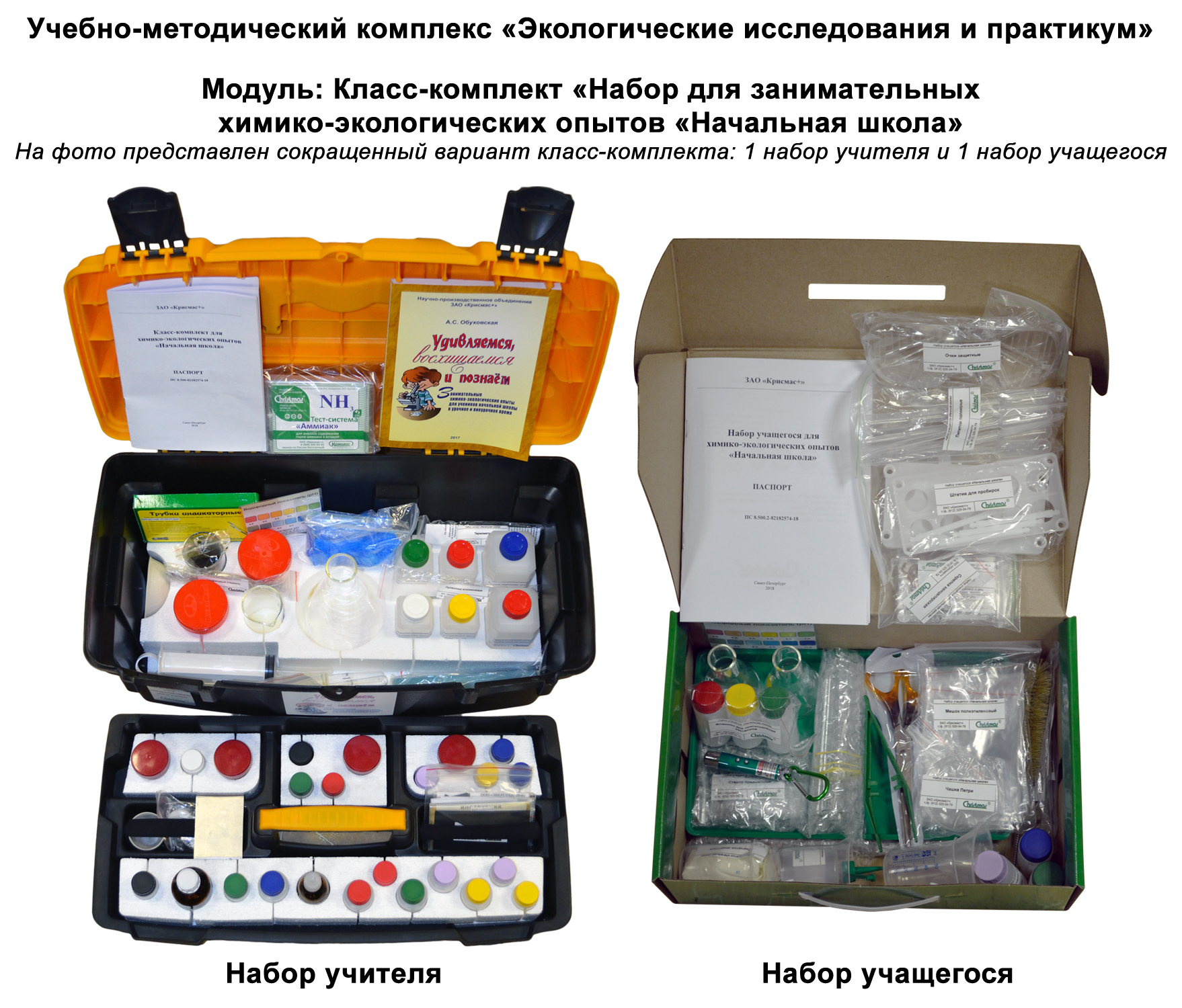 В состав каждого из модулей входит не только все необходимое оборудование, расходные материалы, принадлежности и посуда, тестовые средства, полностью готовые к употреблению химические растворы и сухие реактивы, но и комплект всей необходимой для организации и проведения экологически ориентированного практикума методической литературы и инструктивных материалов, разработанных специально под функциональные особенности каждого из модулей.