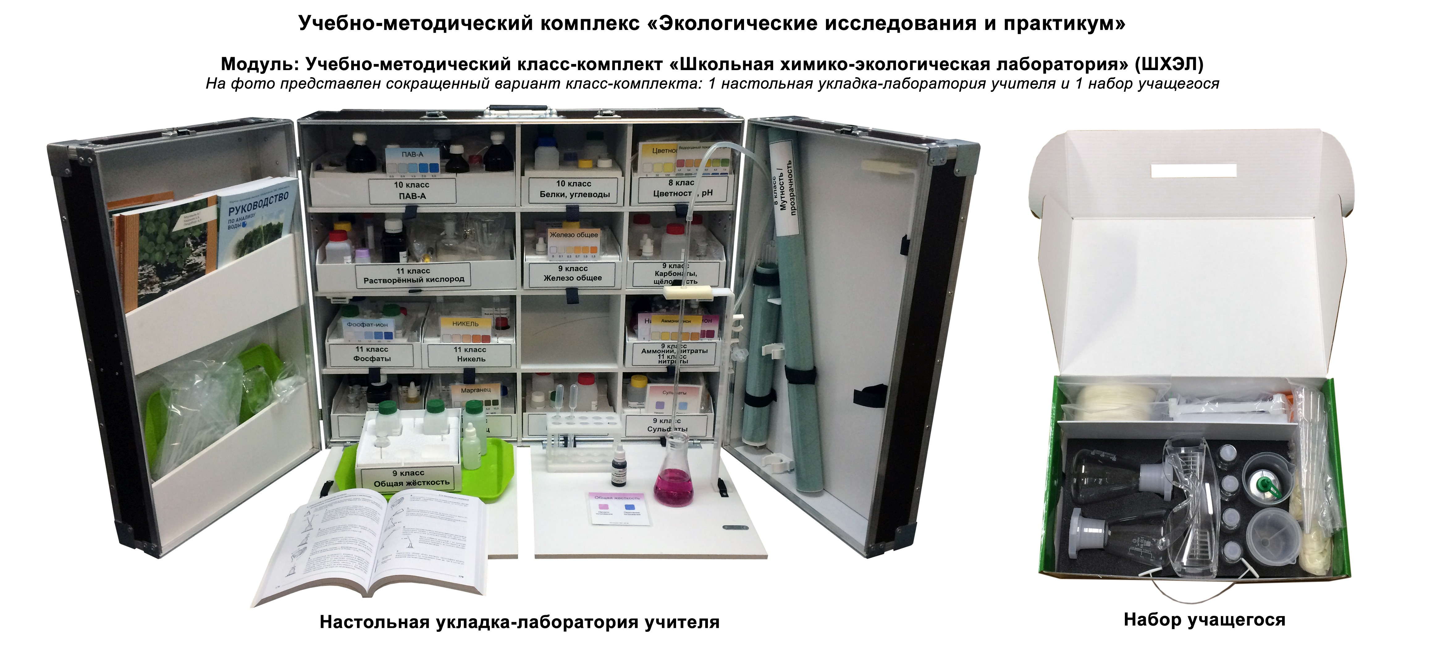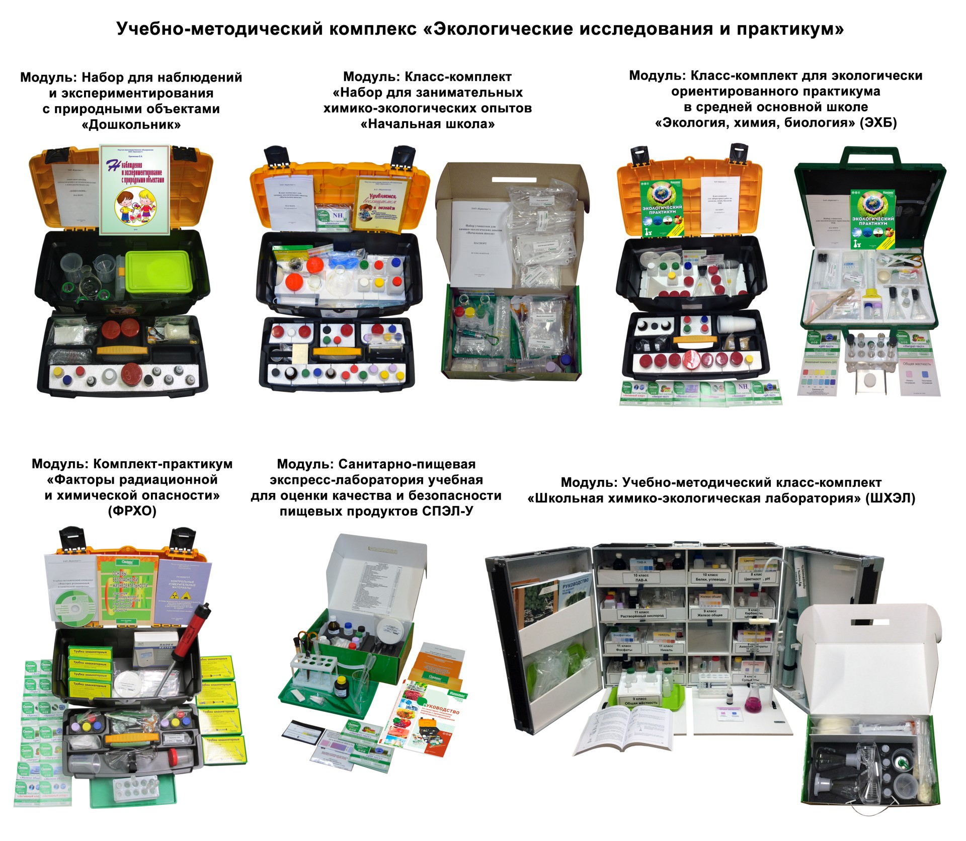 Учебно-методический комплекс «Экологические исследования и практикумы» может быть дополнен мини-экспресс-лабораторией учебной «Пчёлка-У», ранцевой лабораторией исследования водоёмов НКВ-Р и пр.