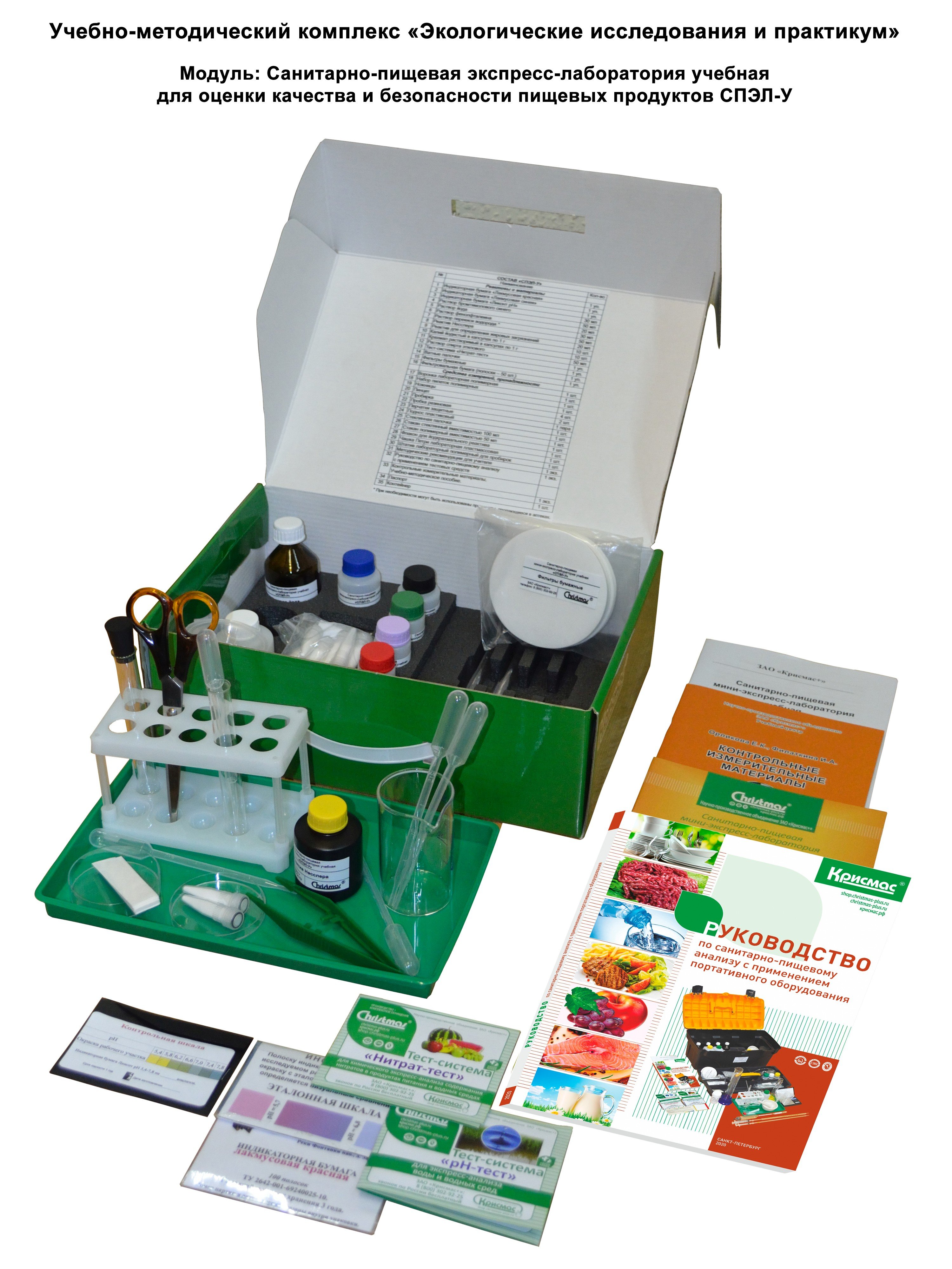 Учебно-методический комплект санитарно-пищевая экспресс-лаборатория учебная СПЭЛ-У предназначена для проведения лабораторных работ и опытов, предусматривающих практическую оценку показателей качества и безопасности пищевых продуктов и продовольственного сырья, а также состояния кухонного и столового инвентаря с использованием методов тестового химического анализа. Применима при изучении предметов «Технология», «Биология», «ОБЖ», «Экология». В учебно-методический комплекс «Экологические исследования и практикум» входит специально для изучения разделов, тематически связанных с экологией безопасностью и здоровьем человека.