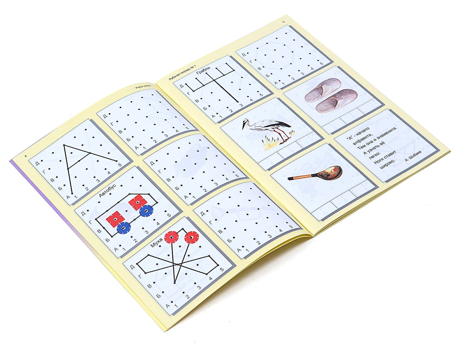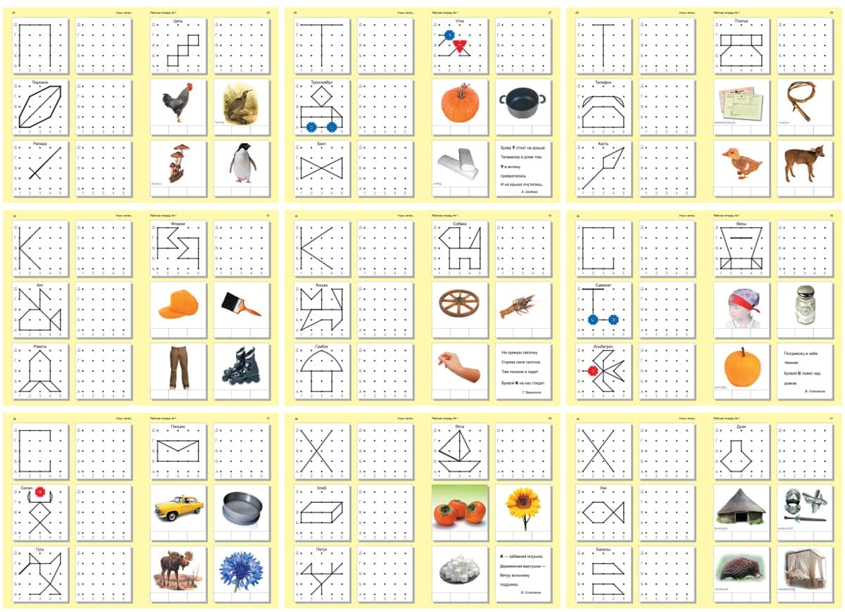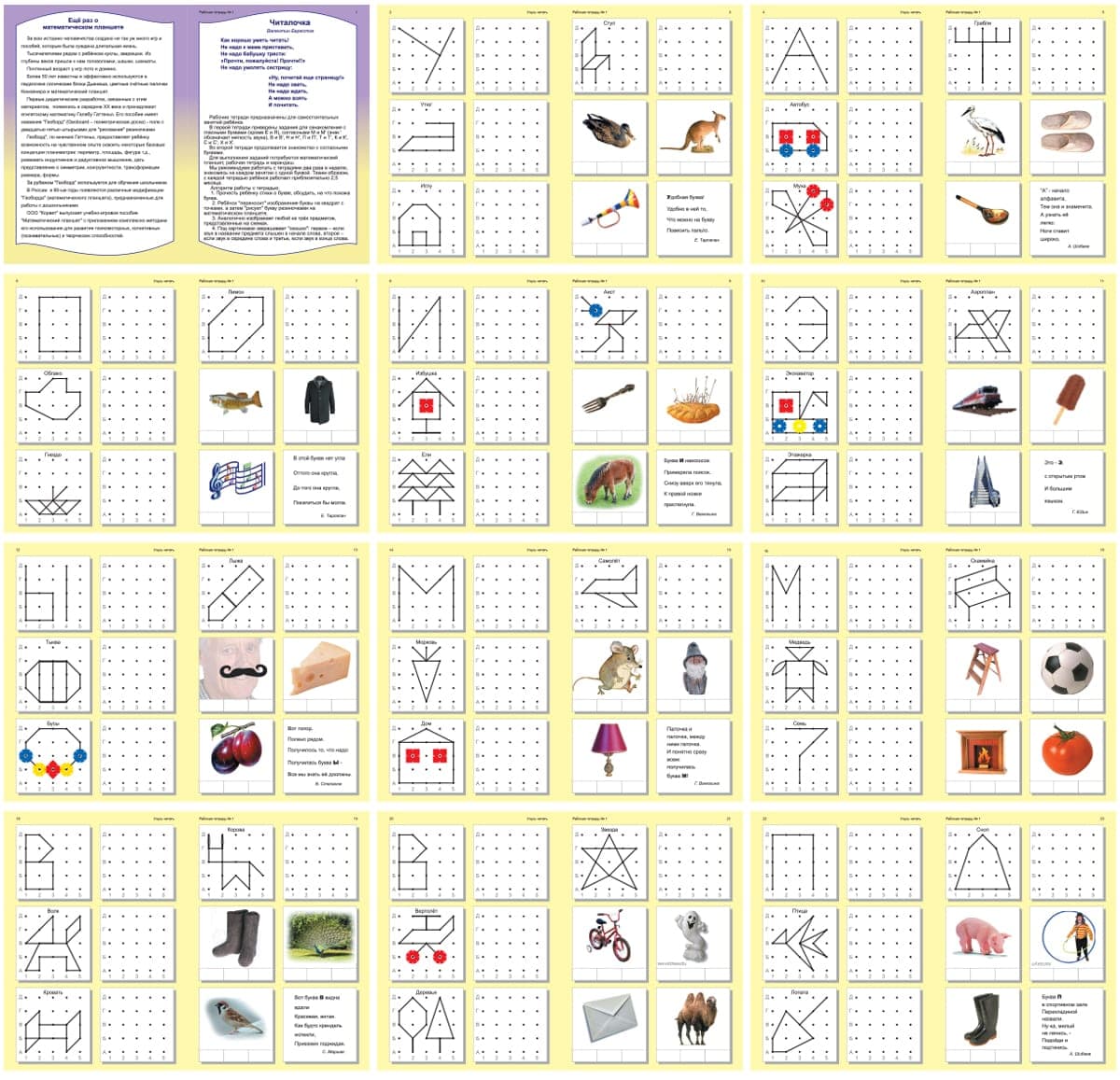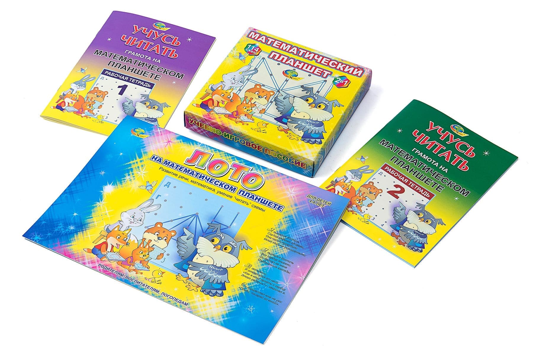 Математический планшет становится полем для исследований ребенка, реализации его собственных идей. Кратко возможности планшета можно разделить по трем направлениям:  Развитие познавательных процессов: памяти, внимания, восприятия, воображения. Форма работы: зрительные и слуховые диктанты; задания на дорисовку.Развитие интеллектуально-творческих способностей. Моделирование математических свойств и отношений; моделирование пословиц и поговорок, загадок, стихотворений, сказок; составление узоров. Развитие коммуникативных качеств. Выполнение коллективных работ (на основе объединения планшетов). Развитие навыков сотрудничества. В Тетради 1 приведены задания для ознакомления с гласными буквами (кроме Е и Я), согласными М и М’ (знак ‘ обозначает мягкость звука), В и В’, Н и Н’, П и П’, Т и Т’, К и К’, С и С’, Х и Х’. В Тетради 2  продолжается знакомство с согласными буквами.