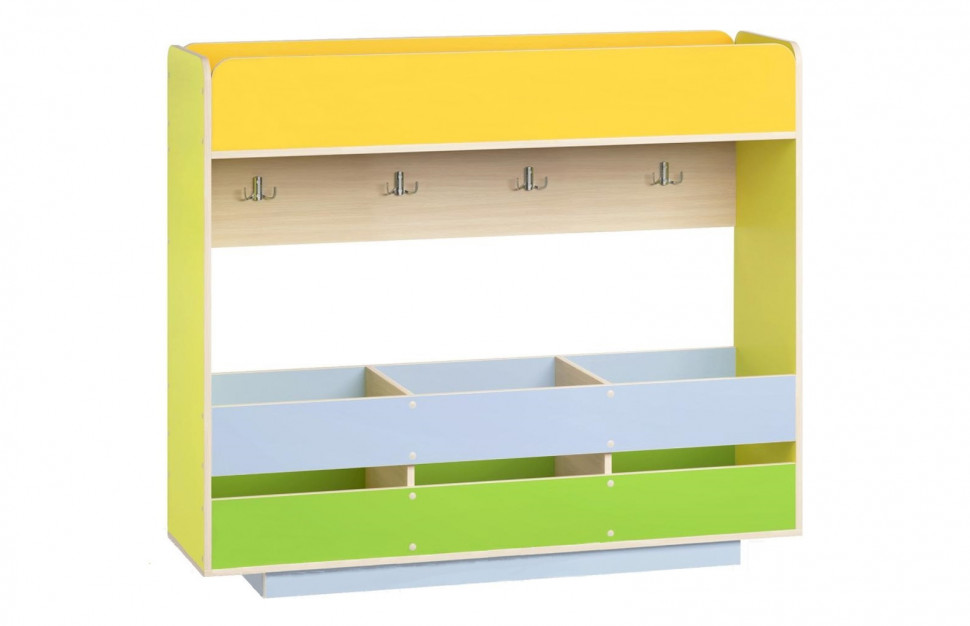 Уголок для спортивного инвентаря разделен на несколько зон, чтобы приучить детей к порядку: ящики, крючки, полки. Размер : 138х50х118 см Материал : ЛДСП