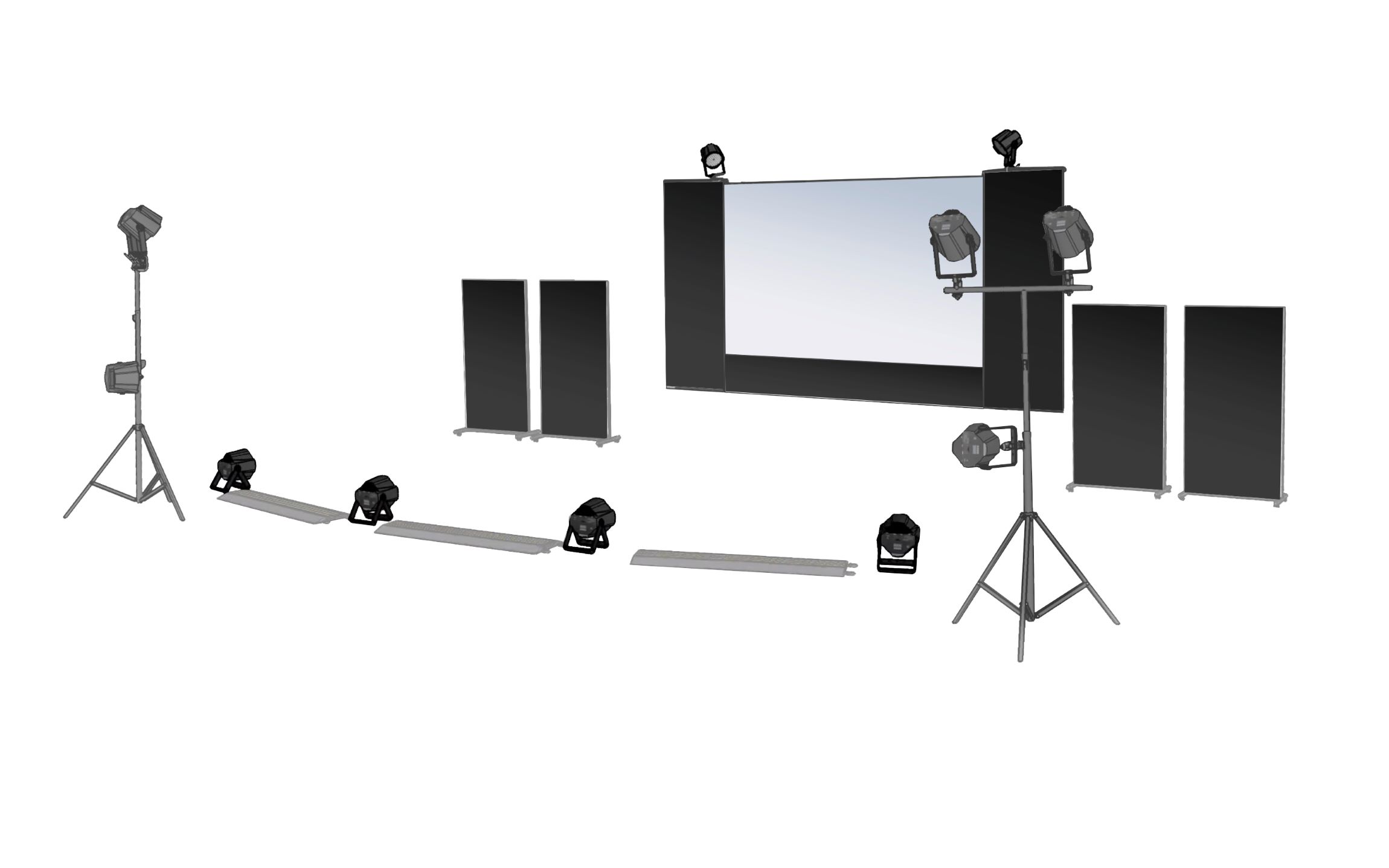 - Световое оборудование: 12 прожекторов DMX со светофильтрами, штативы для осветительных приборов;