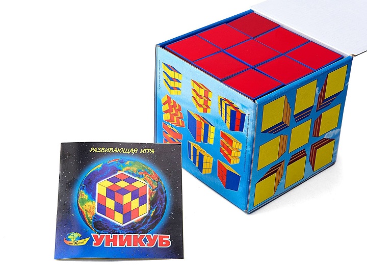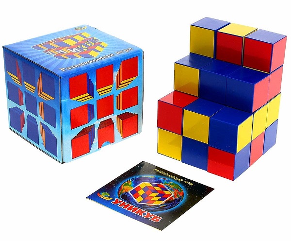 кубики размером 4х4х4. Набор кубиков для детей  3-12 лет. Игра состоит из 27 кубиков, окрашенных в жёлтый, красный, синий цвета и собранных в куб по определённой схеме. Задания в "Уникубе" трудные и требуют от ребёнка больших затрат времени и сил. Расположены задания в порядке возрастания сложности и это поможет развить пространственное мышление, научить аккуратности и предусмотрительности, привить навыки точности.