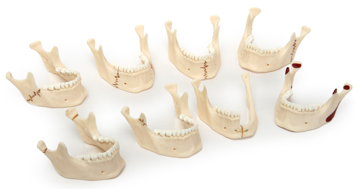 Комплект «Виды переломов нижней челюсти» состоит из 8 моделей, из которых 7 – различные виды переломов, а одна – норма – даётся для сравнения.