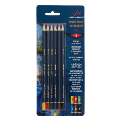 "VISTA-ARTISTA" Fine VFWPB-6 Профессиональные акварельные карандаши с водоразмываемыми грифелями, изготовленными из высококачественных пигментов. Светостойкие, яркие и насыщенные тона, легко ложатся на сухую и влажную бумагу. Могут использоваться как обычные цветные карандаши, но при размывании влажной кистью рисунок превращается в акварель. Могут использоваться в смешанных техниках.6 цветов в наборе: кадмиевый желтый светлый, кадмиевый красный темный, голубой ФЦ, изумрудно-зеленый светлый, марс красно-коричневый, черный-круглые- диаметр 7,0 мм., - толщина стержня 3,0 мм.,- длина 177 мм.