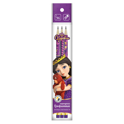 Набор графитных карандашей Hot Print, ТМ , круглые, с ластиком, диаметр 7.0мм, длина 190мм, заточенные, упаковка в ПП пакете по 3 шт. Предназначен для графических работ любой сложности. Дизайны с царевной Соней и узорами серии.- однородный графит не царапает бумагу;- противоударная особая технология склейки защищает грифель от раскалывания при случайных падениях;- мягко затачиваются благодаря качественной древесине ;- имеют покрытие в виде пленки с нанесением на неё декоративных рисунков - паттернов.