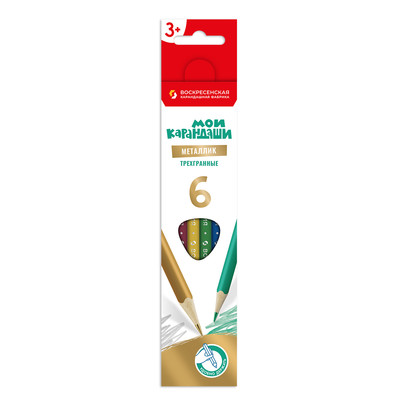 Набор трехгранных карандашей металлик ТМ «ВКФ» "Мои карандаши" арт. MP-MCP-1006 заточенные.6 цветов в наборе: желтый металлик, красный металлик, темно-синий металлик, зеленый металлик, коричневый металлик, черный металлик.Цветные металлические карандаши соединяют в себе металлический блеск и цвет. Их можно использовать как самостоятельно, так и совместно с другими художественными материалами для создания удивительных эффектов. Подходят для заштриховки больших поверхностей даже на светлой бумаге, хотя наиболее ярко цвета смотрятся на бумаге темных оттенков. Изготовлены из сырья и материалов природного происхождения и качественной химически необработанной древесины мелколистной липы, выращенной в экологически чистых районах России. Товар сертифицирован для детей от 3-х лет.Главная особенность серии "Мои карандаши" это трехгранная форма корпуса, которая анатомически идеально подходит для детской руки. Вырабатывается правильный захват пишущего инструмента, и руки менее устают от работы. Подходят как для правшей, так и для левшей. Большая коллекция карандашей для юных художников и любителей рисования постарше!Форма корпуса карандаша: трехранныйДлина карандаша: 177 ммДиаметр сечения корпуса: 7 ммДиаметр стержня: 3 ммУпаковка: картонная коробка с европодвесом