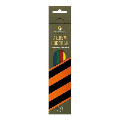 Специальная серия карандашей, приуроченная ко Дню Победы. Наборы составлены из основных цветов цветового круга. Имеют прочный, но очень мягкий стержень, с отличной пигментацией. Рисунки получаются яркими и насыщенными.Карандаши цветные, 6 цв., шестигранные, диаметр 7.0 мм., длина 177 мм, отделка корпуса в цвет стержня, заточенные, в картонной коробке с европодвесом.