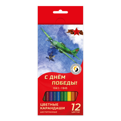 "ВКФ" "С Днем Победы!" SUV-020 Набор цветных карандашей Самолет Ил-2 заточенный 12 цв.